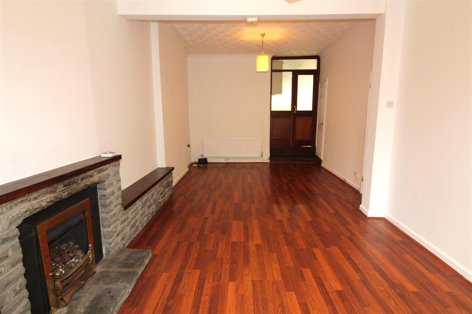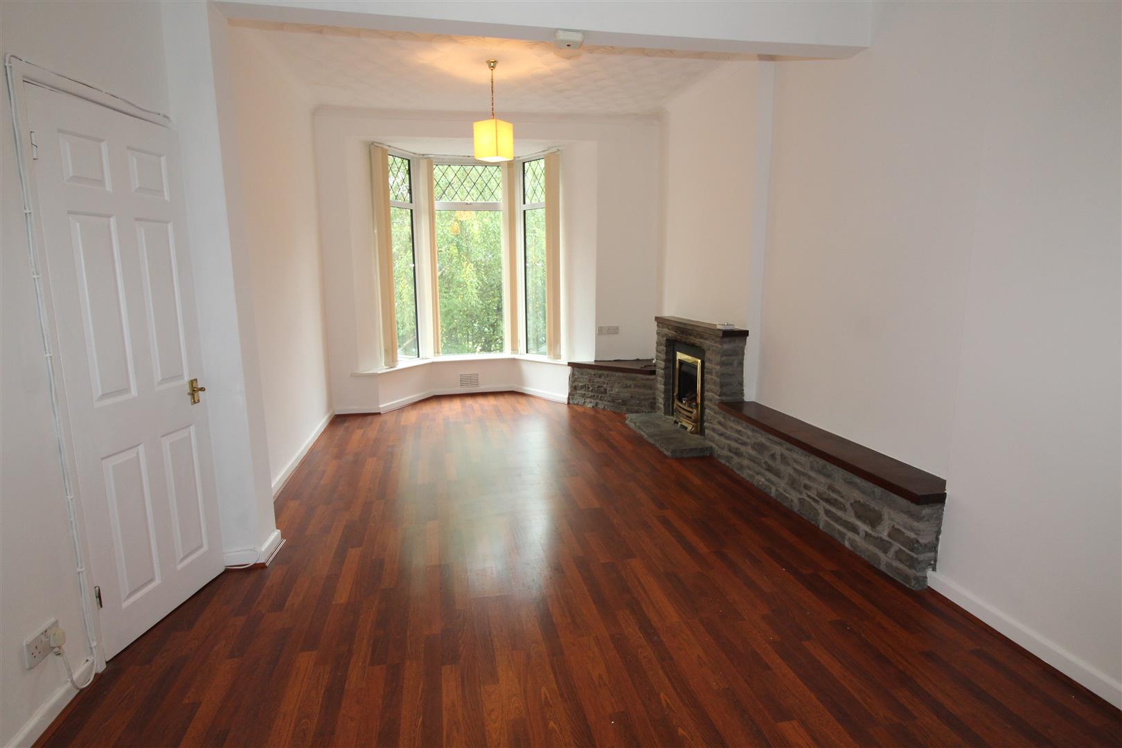 Double glazed bay window to front aspect, coved and textured finish to ceiling, panted finish to walls, stone fronted fireplace with Brazilian Mahogany shelving, stand alone remote controlled gas fire, hardwood door leading to kitchen, under-stairs cupboard.