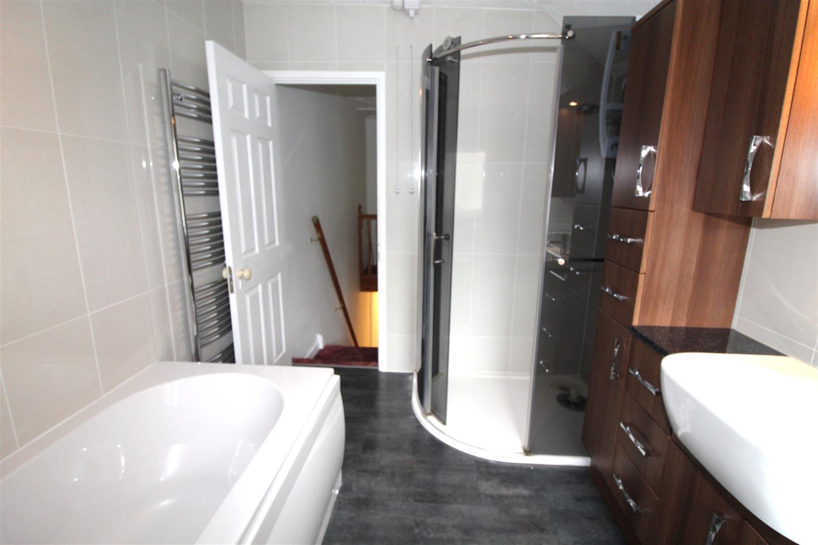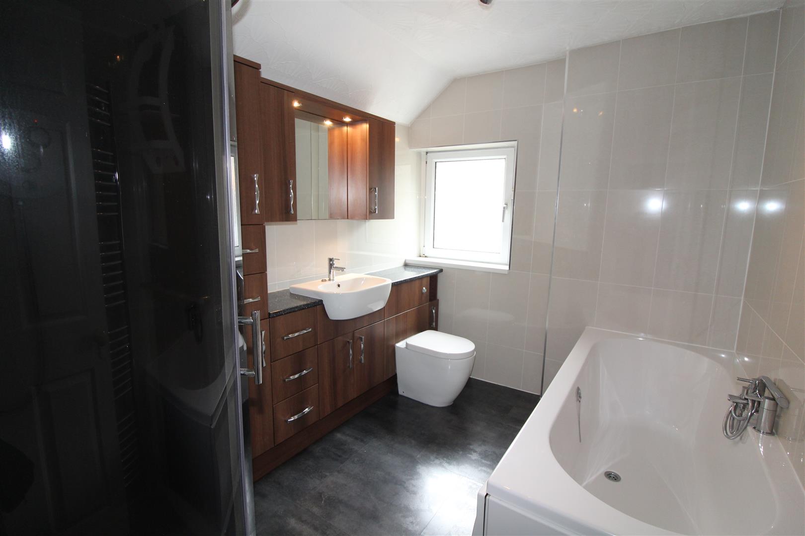 Double glazed window to rear aspect with obscured glass, textured finish to ceiling, tiled walls, a fitted suite with wash hand basin and WC set in vanity with storage, wall mounted mirror with lighting, bath with mixer tap and shower attachment, shower enclosure with shower, heated towel rail.