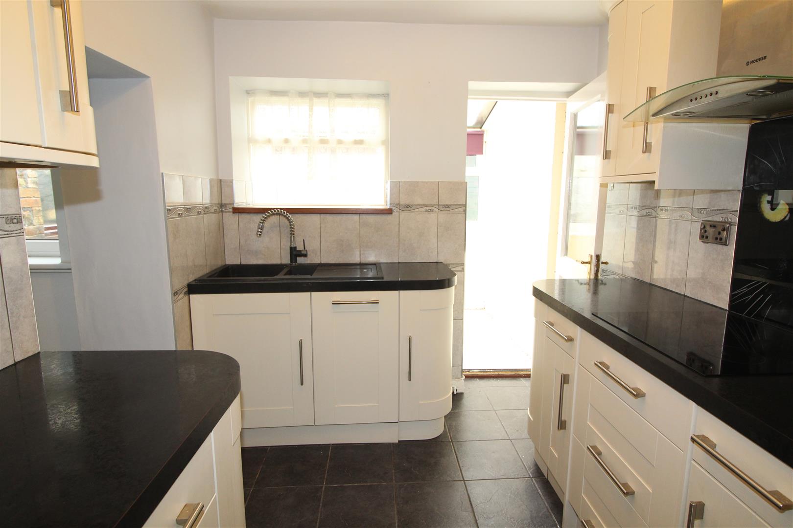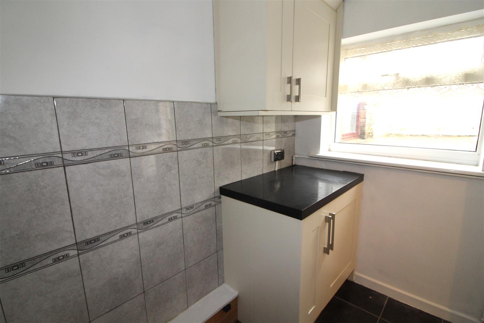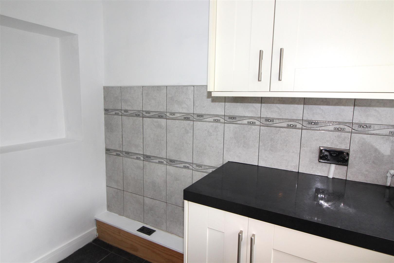 Double glazed widow to rear aspect, painted finish to ceiling, painted and tiled finish to walls, base and wall units, space for fridge/freezer, tiled flooring.