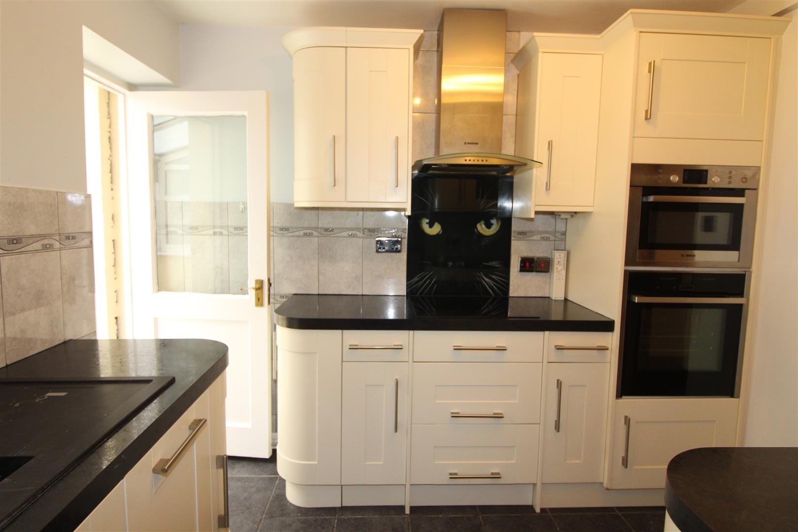 Painted finish to ceiling, tiled finish to walls, base and wall cabinets, bowl and a half single drainer sink, built in washing machine and dishwasher, electric hob, extractor fan, microwave oven and Neff oven, power points with USB charging points, window to conservatory.