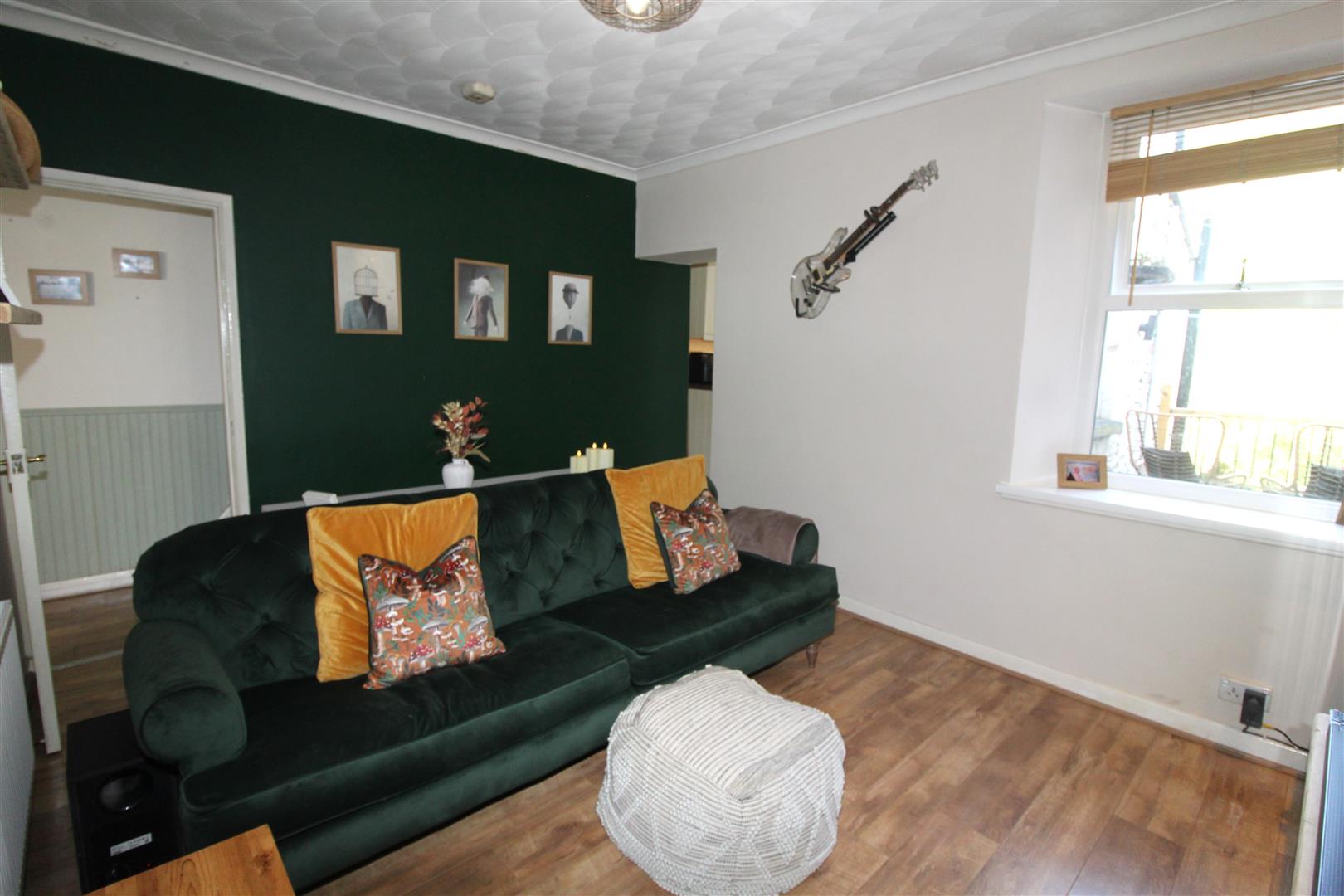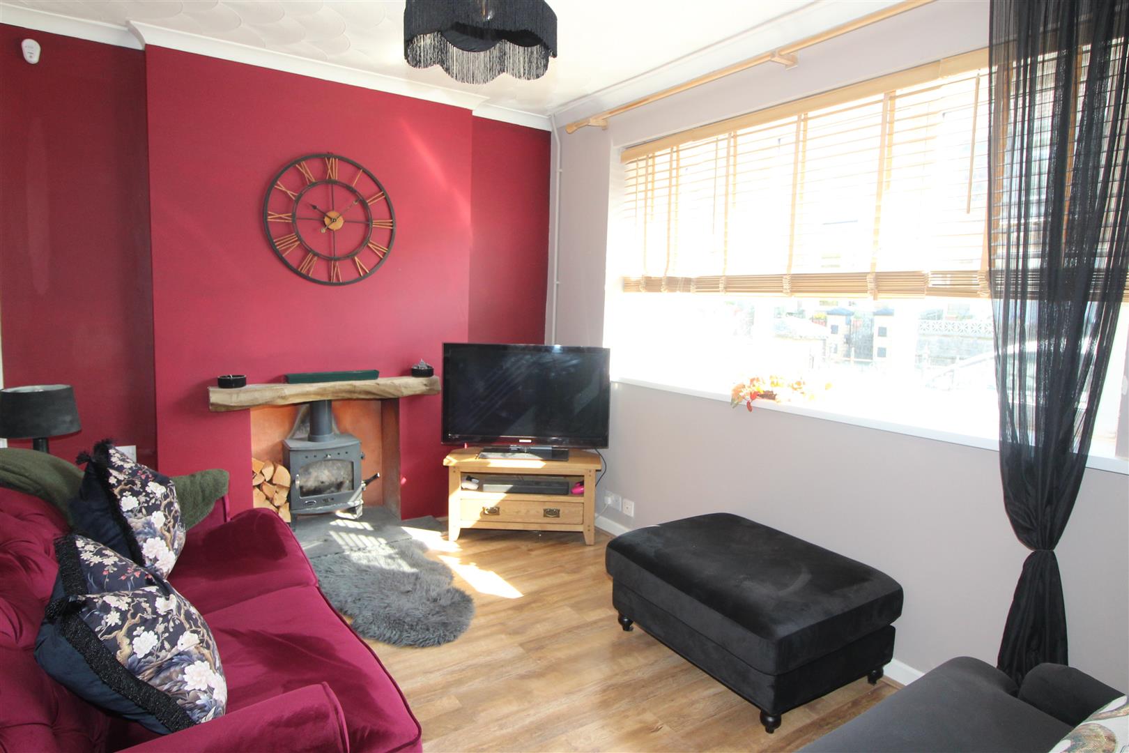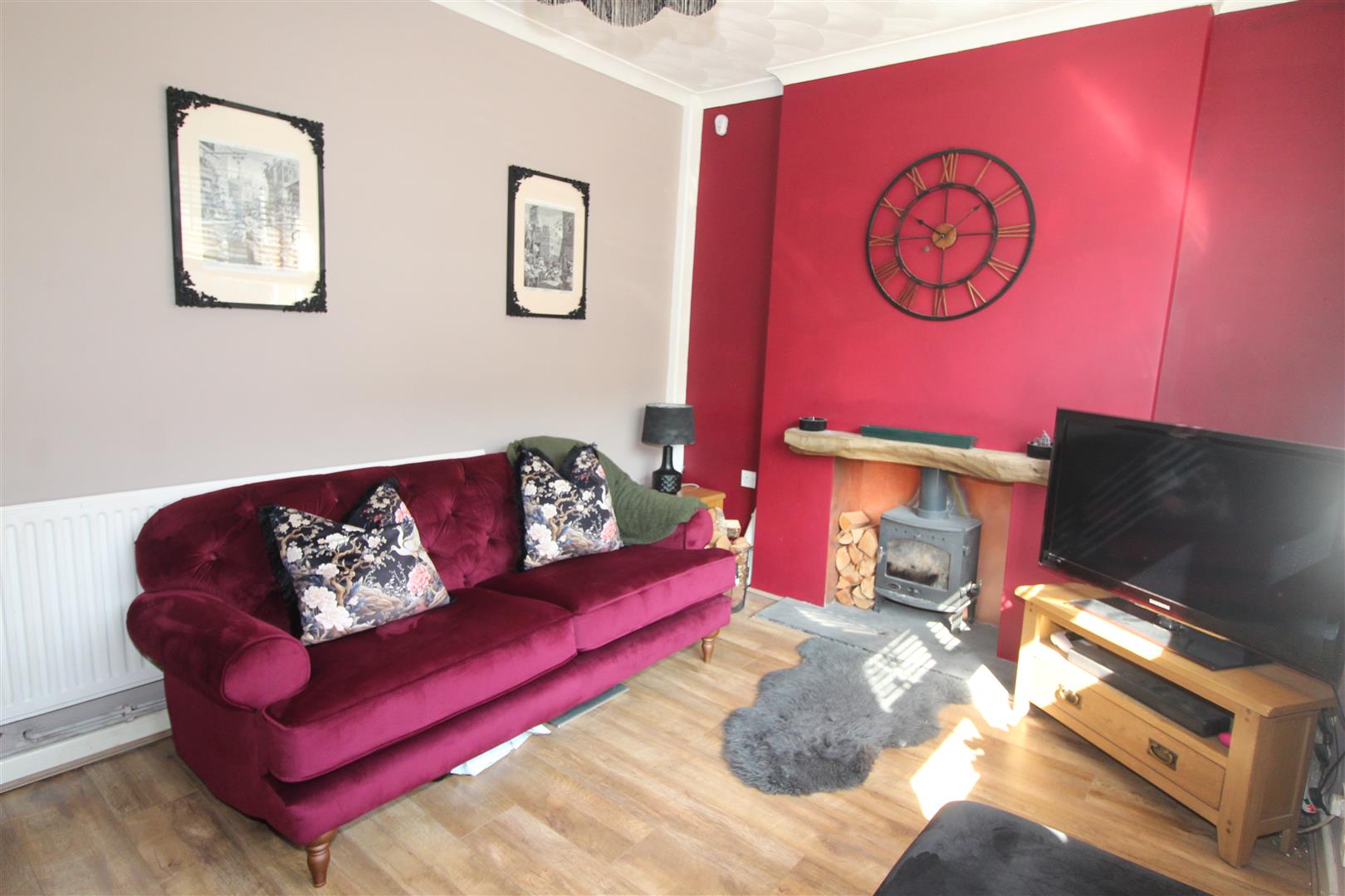 Double glazed window to front aspect, coved and textured finish to ceiling, painted finish to walls, log burner set in alcove with mantle, radiator, laminated wood flooring.