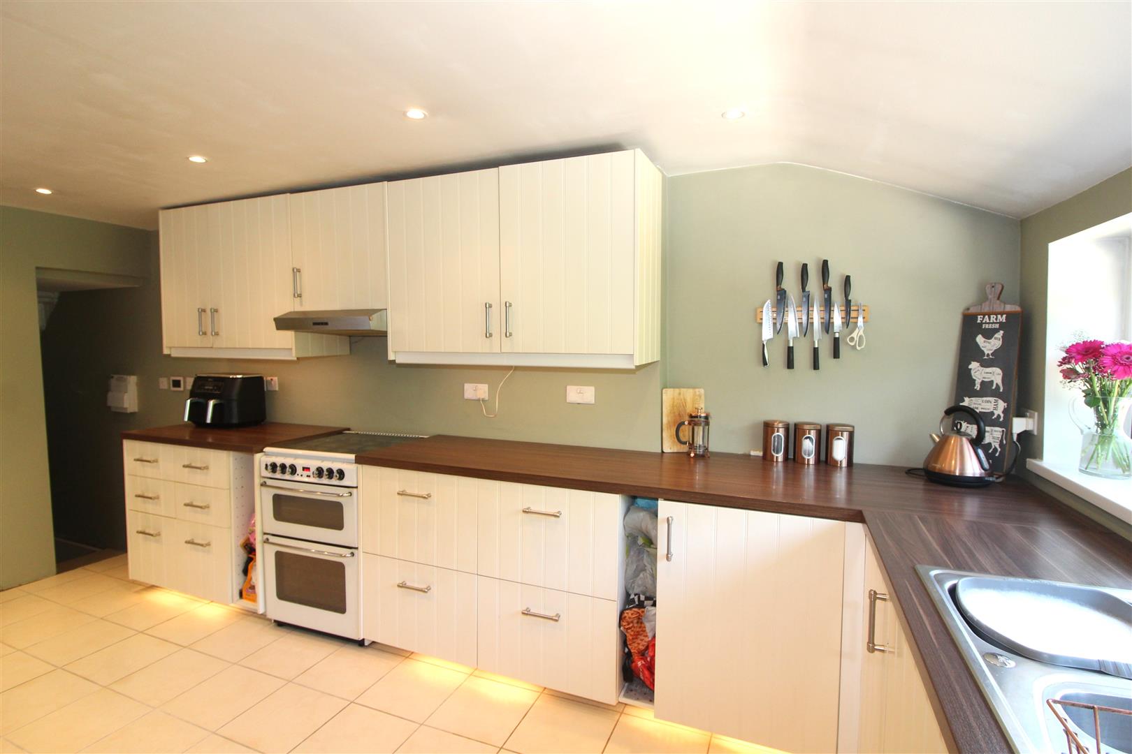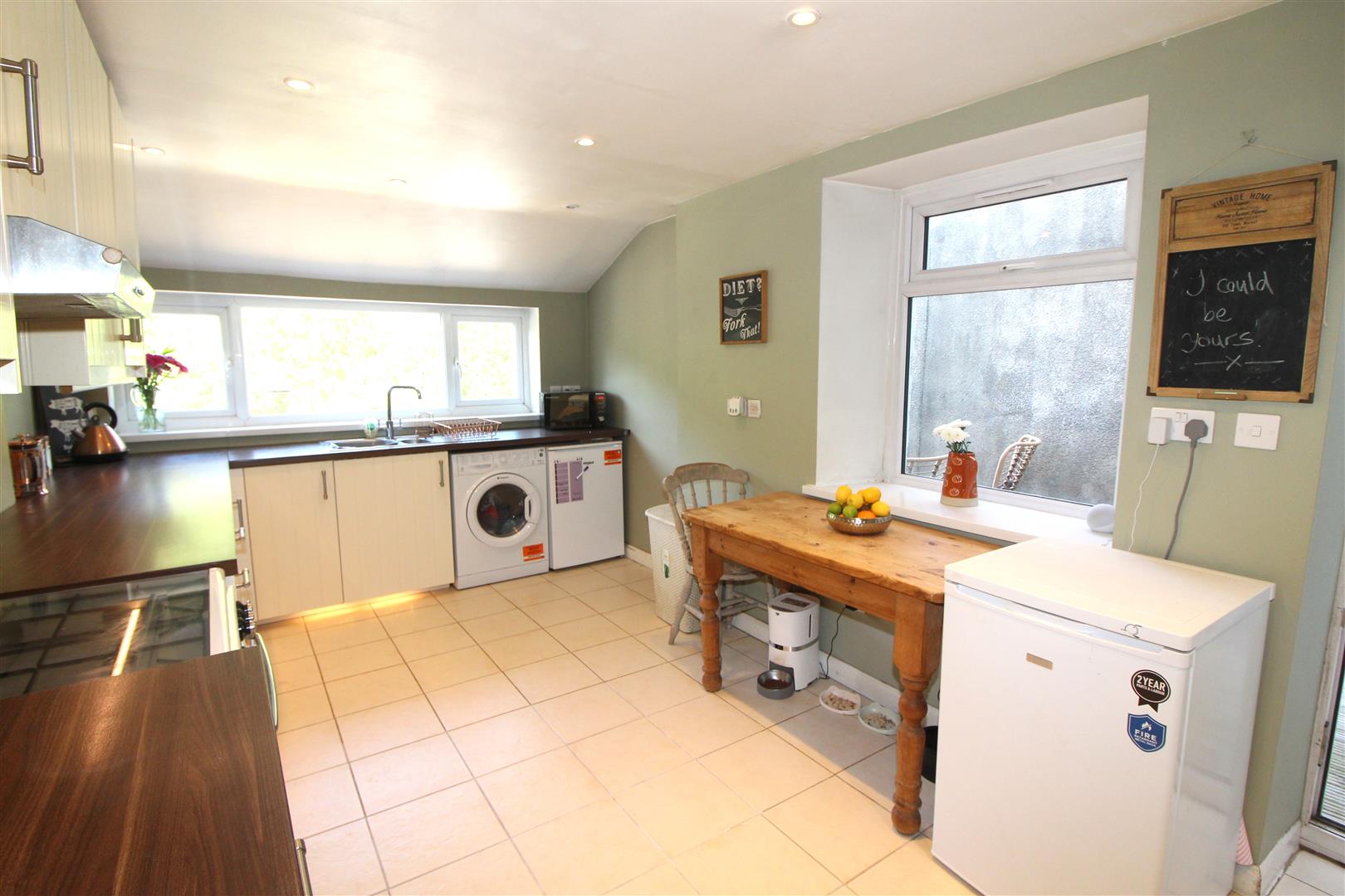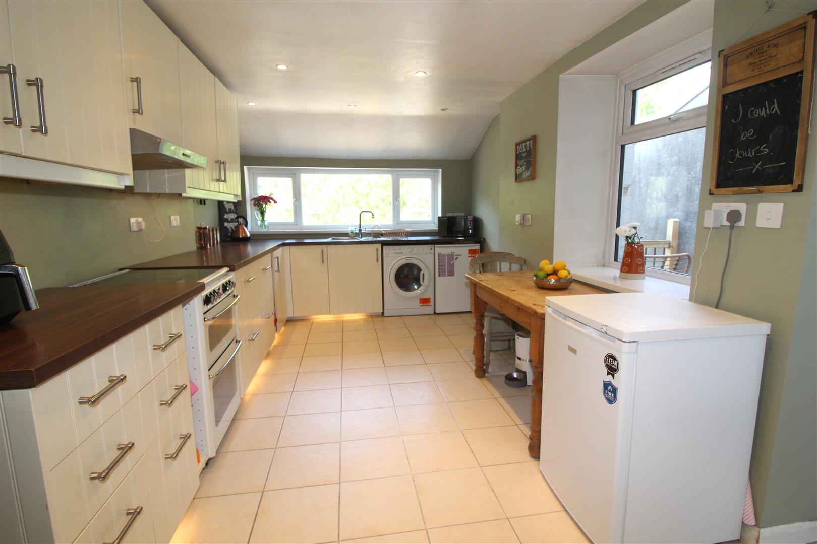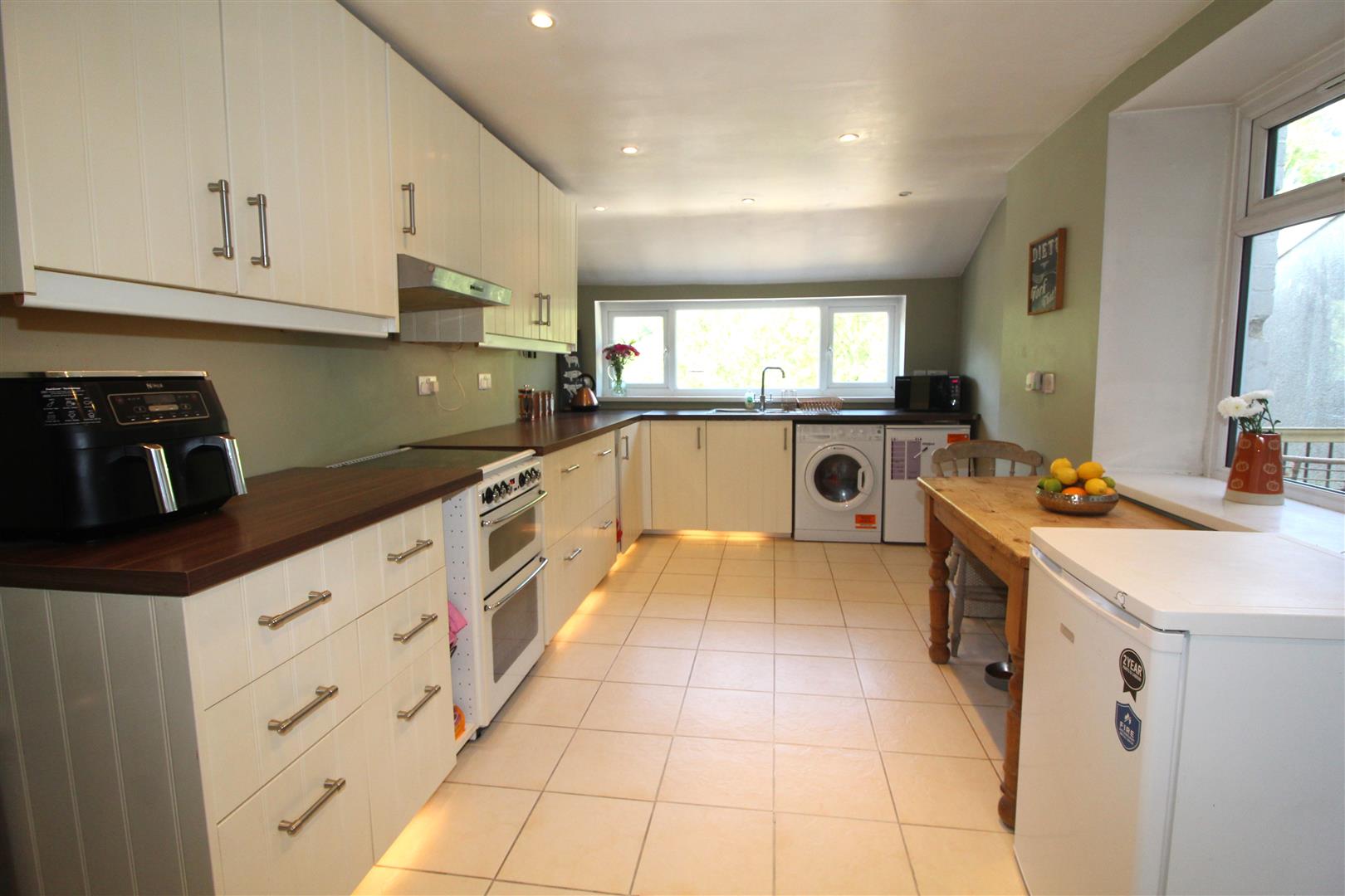 Double glazed window to rear and side aspects with views, painted finish to walls and ceiling with spot lighting, base and wall cabinets, kick space lighting, bowl and a half stainless steel sink, tiled splash back, plumbing for automatic washing machine, space for cooker, fridge and dining table, double glazed door leading to outside, “left right” stairs leading to lower ground floor.