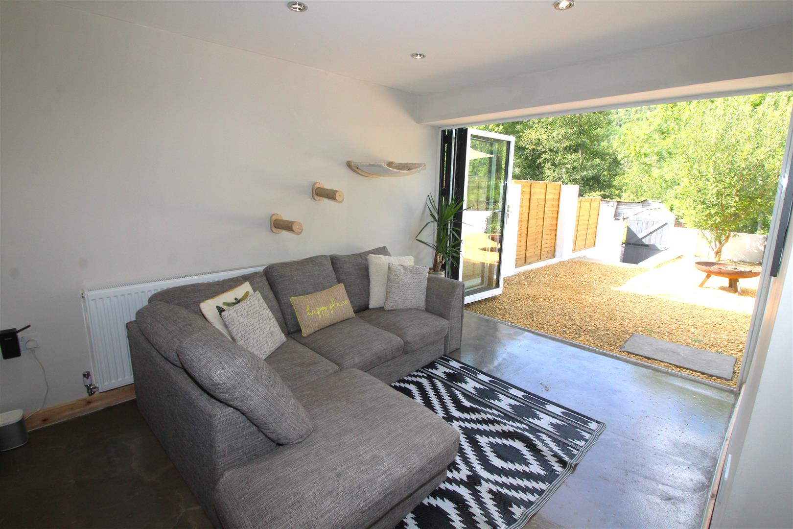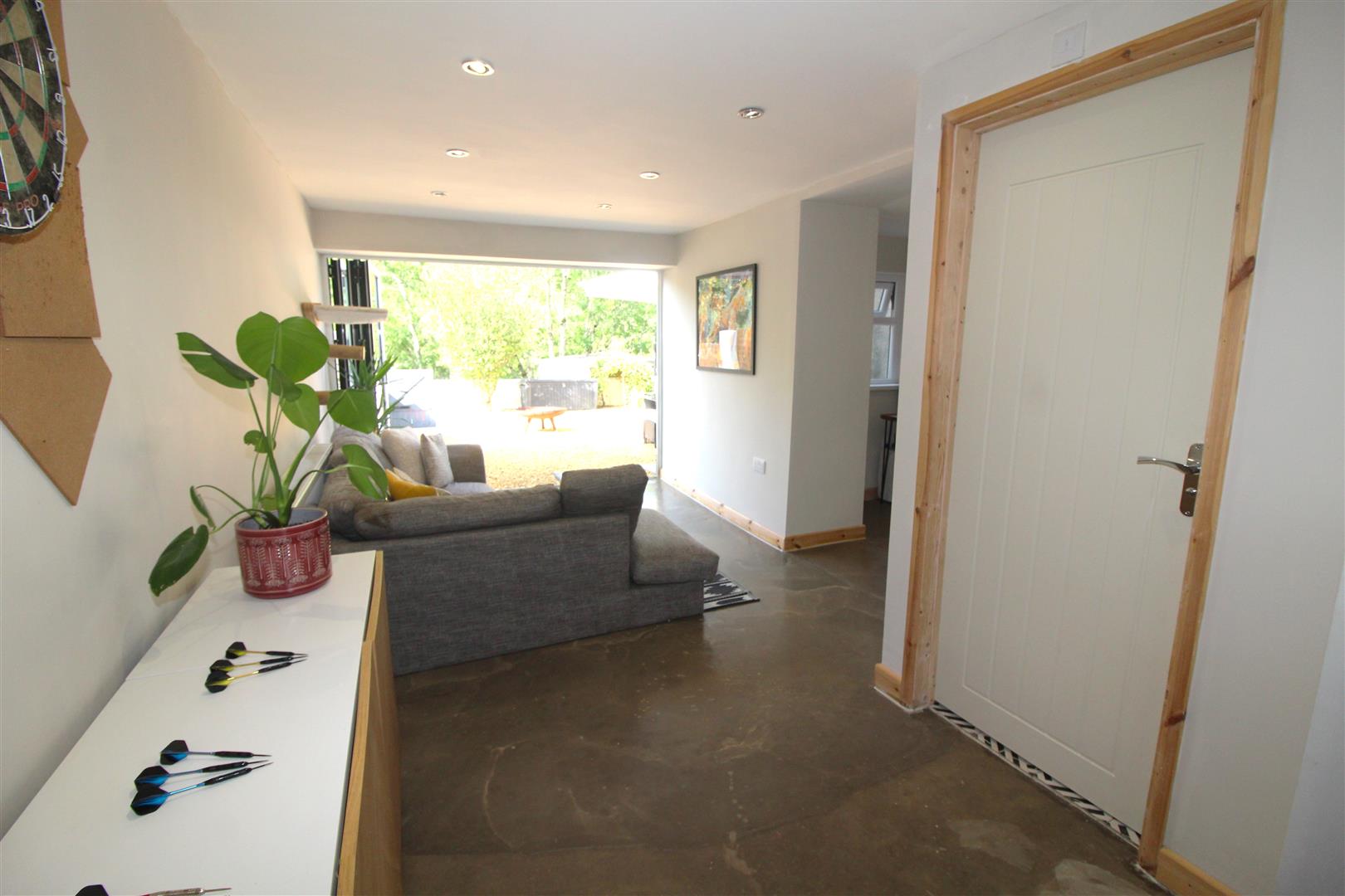 A lovely open space with painted finish to walls and ceiling, spot lighting, polished concrete floor, large bi-folding doors opening up to the rear garden, opening to office area.