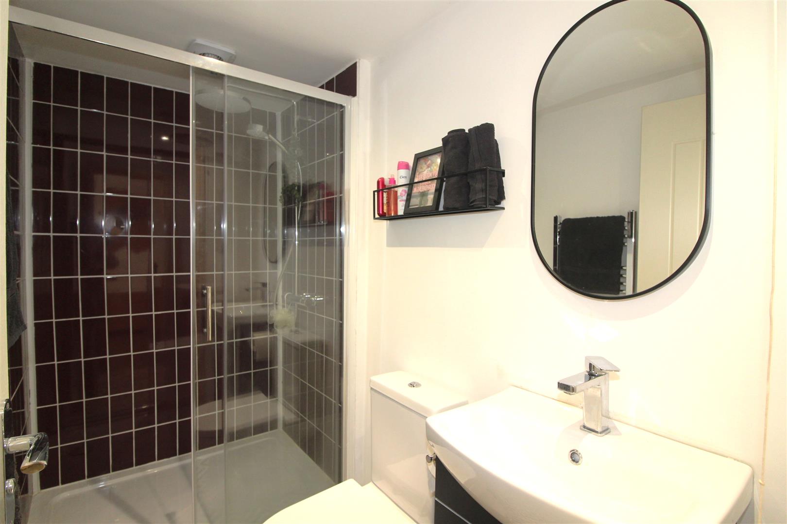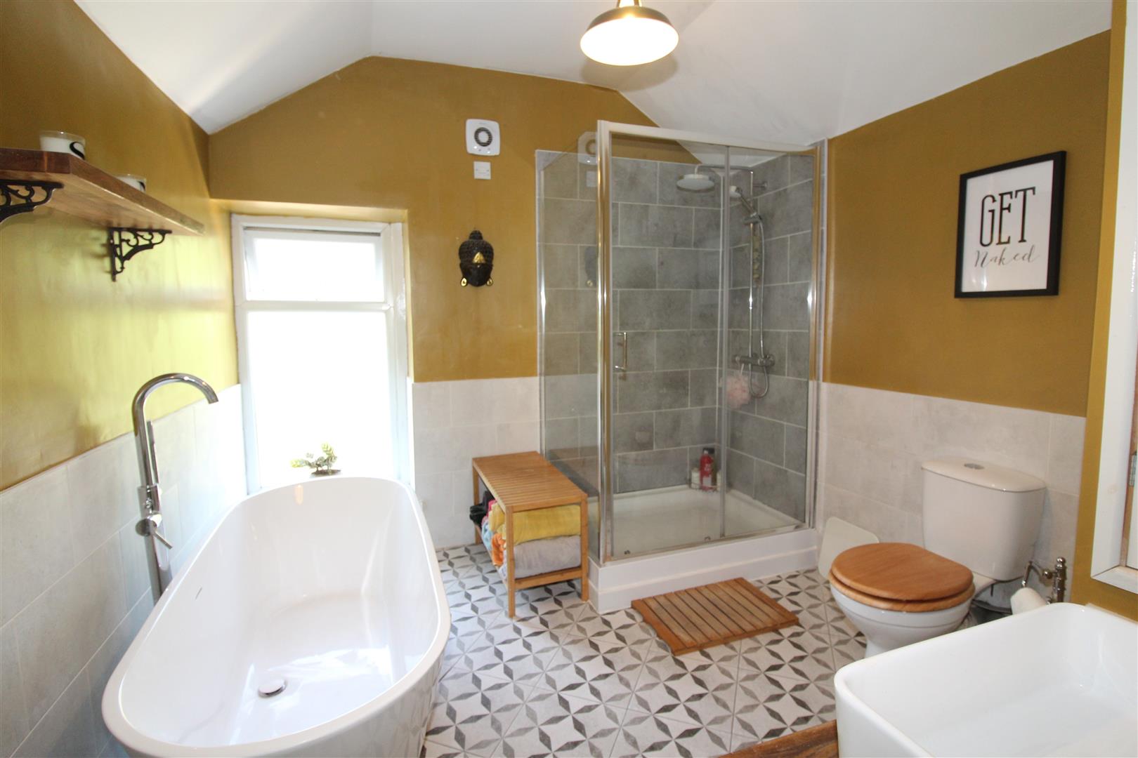 Double glazed window to rear aspect with obscured glass, painted finish to ceiling, painted and tiled finish to walls, bath tub with mixer tap and shower attachment, large shower enclosure, wash hand basin set on feature timber table, low level WC, cupboard housing wall mounted gas central heating combination boiler.