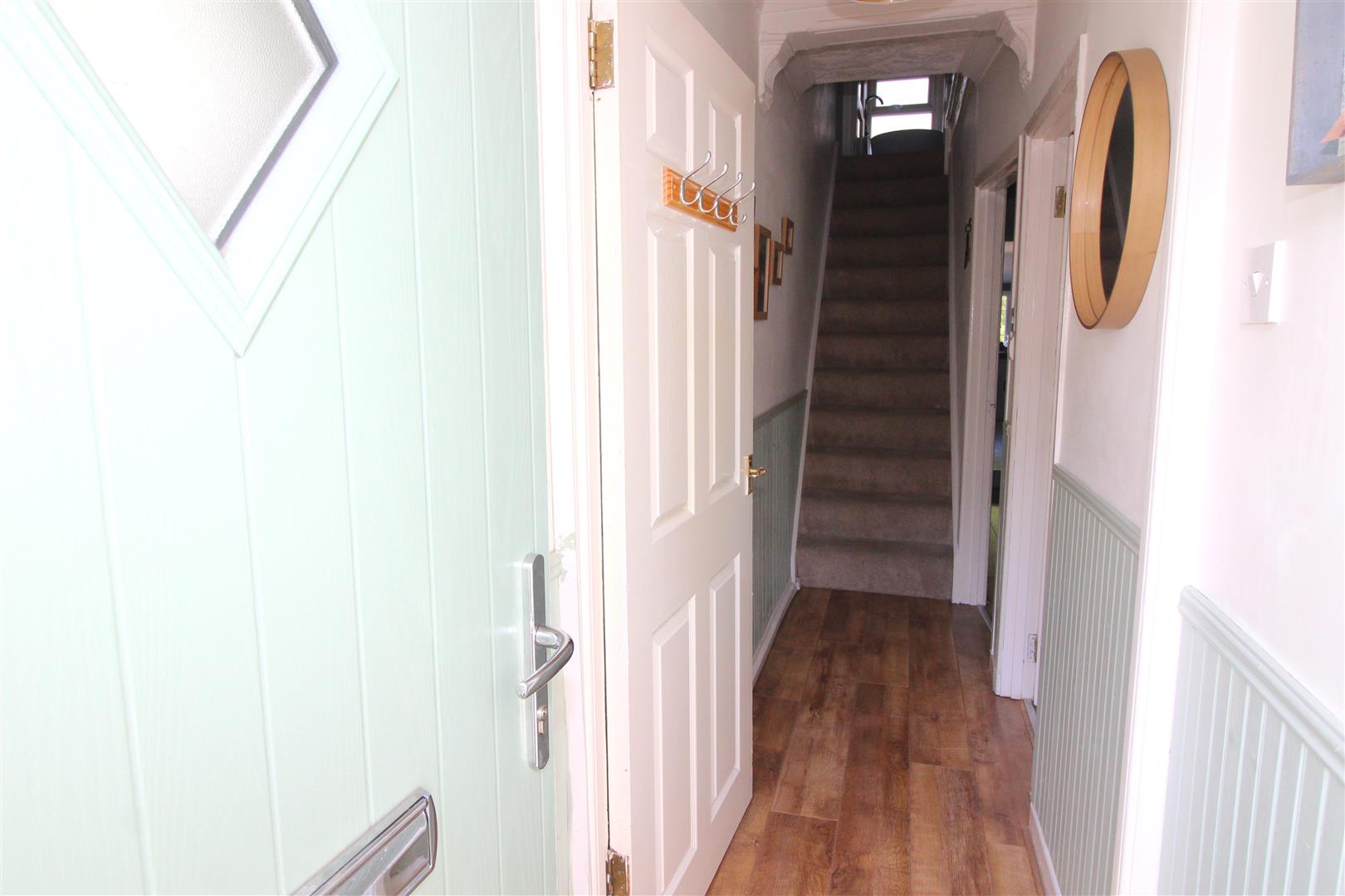 Double glazed composite entrance door, coved and textured finish to ceiling, painted an wood panelled finish to walls, laminated wood flooring, door leading to hallway.
