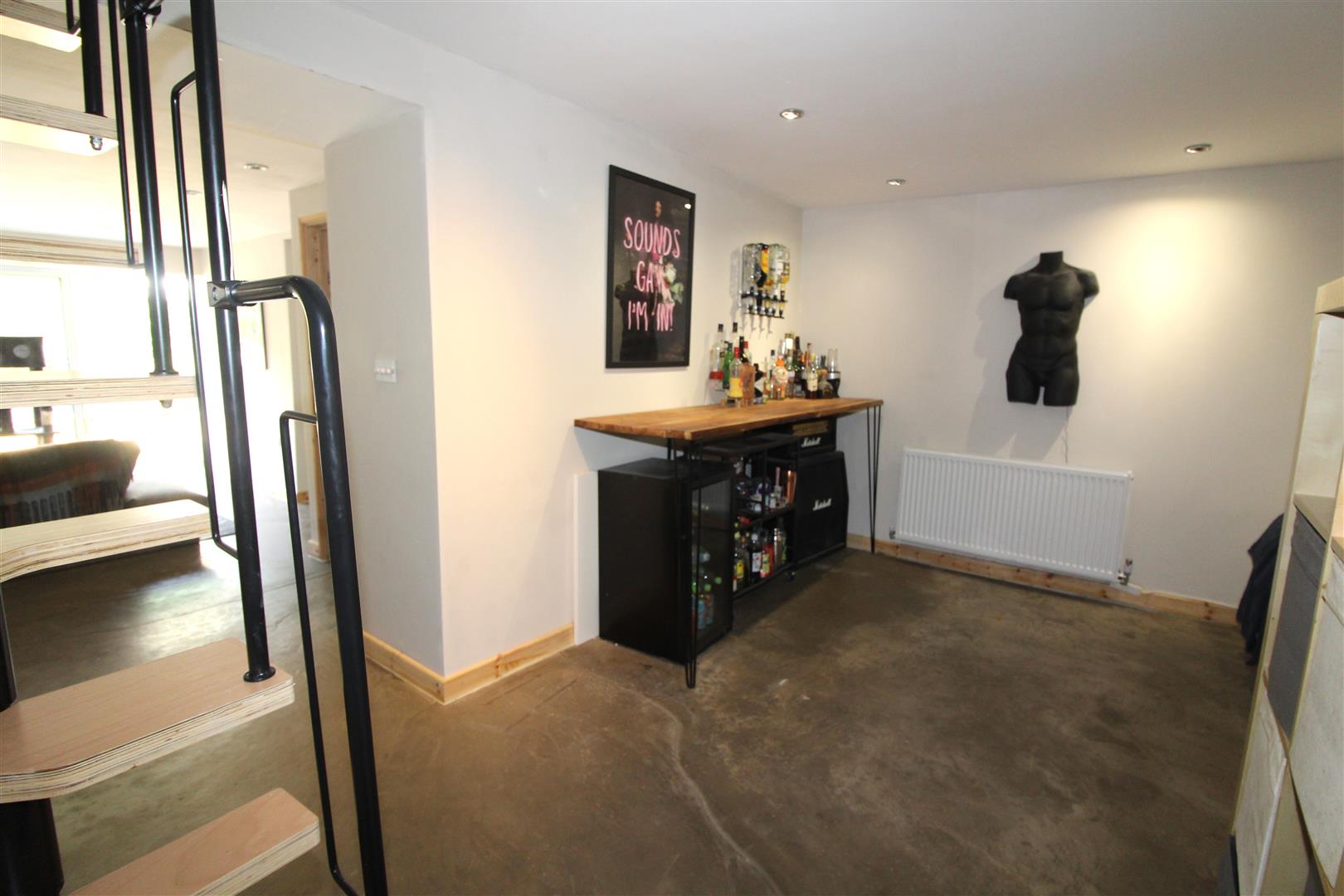 Via “left right” stairs leading from Kitchen/Breakfast Room. With polished concrete flooring opening out to family room, sitting room, office and shower room.