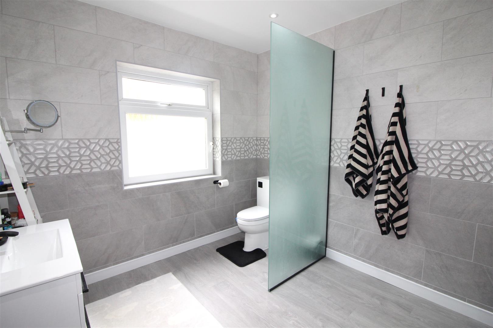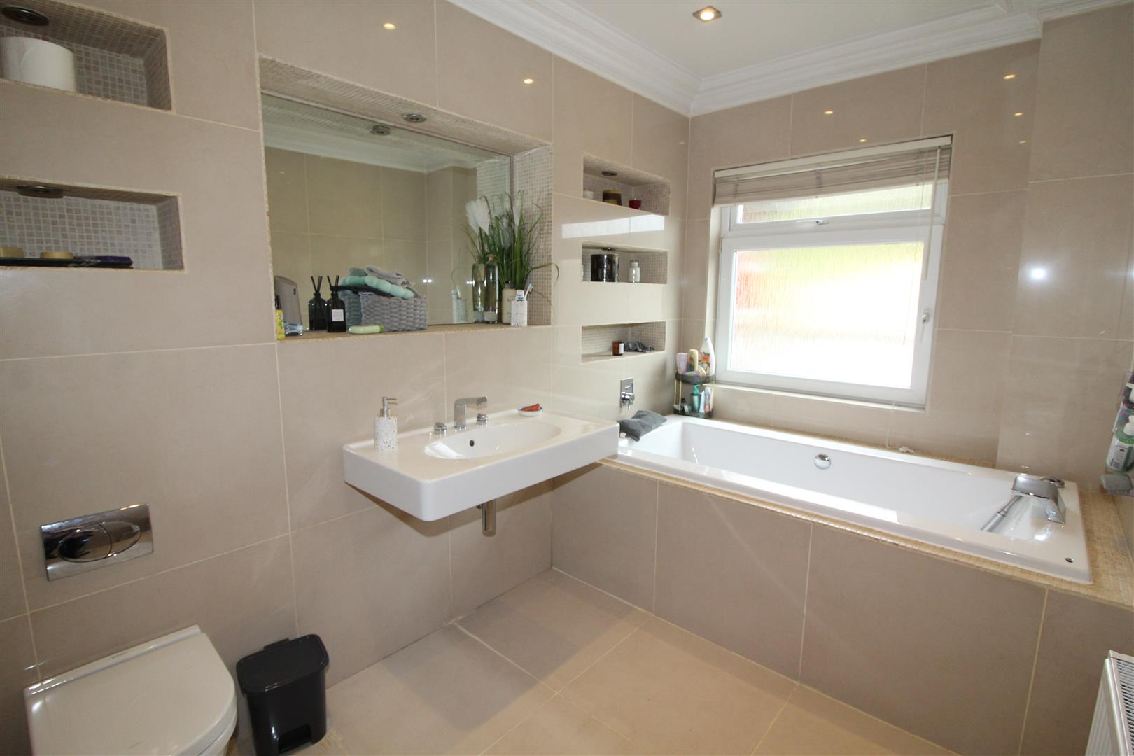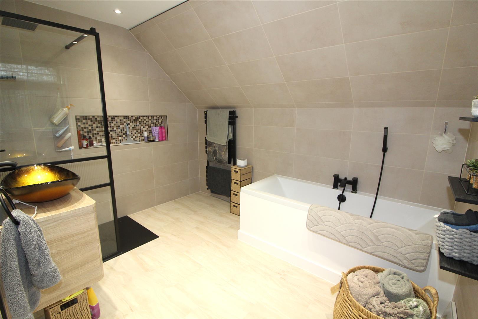 Double glazed window to rear aspect with obscured glass, coved and painted finish to ceiling, spot lighting, tiled walls with inset display shelving, bath with waterfall tap and extendable shower, wash hand basin WC, tiled floor, radiator.