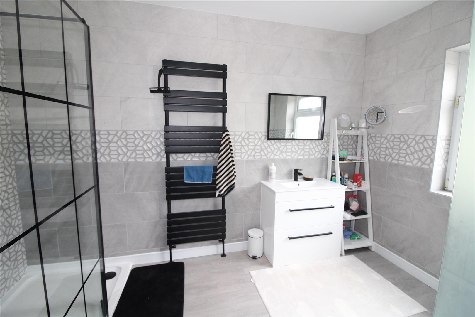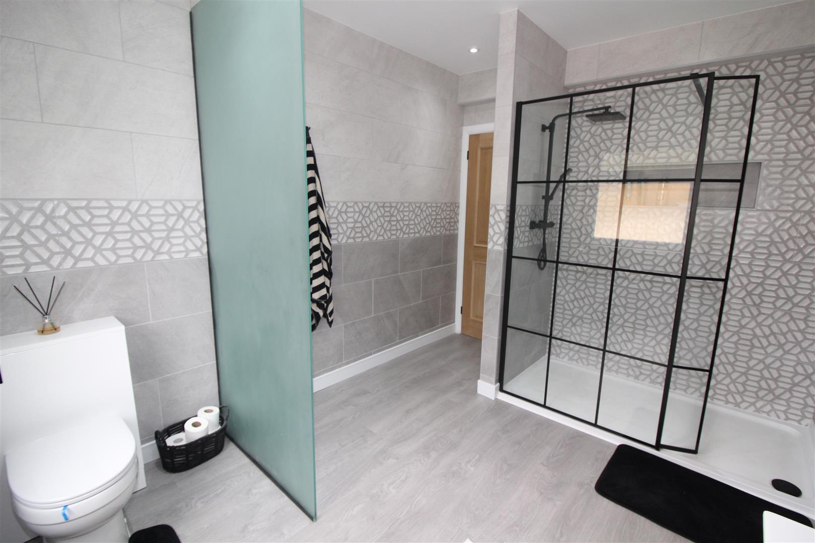 Double glazed window to rear aspect with obscured glass, painted finish to ceiling, spot lighting walk in shower enclosure with shower, wash hand basin set in vanity unit, WC, heated towel rail, laminated wood flooring.