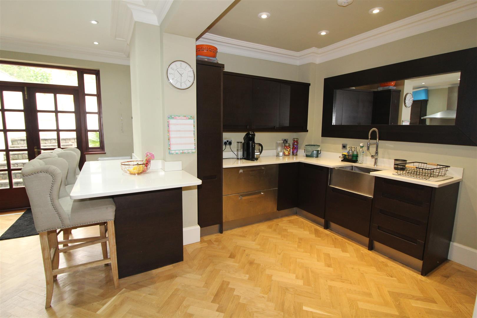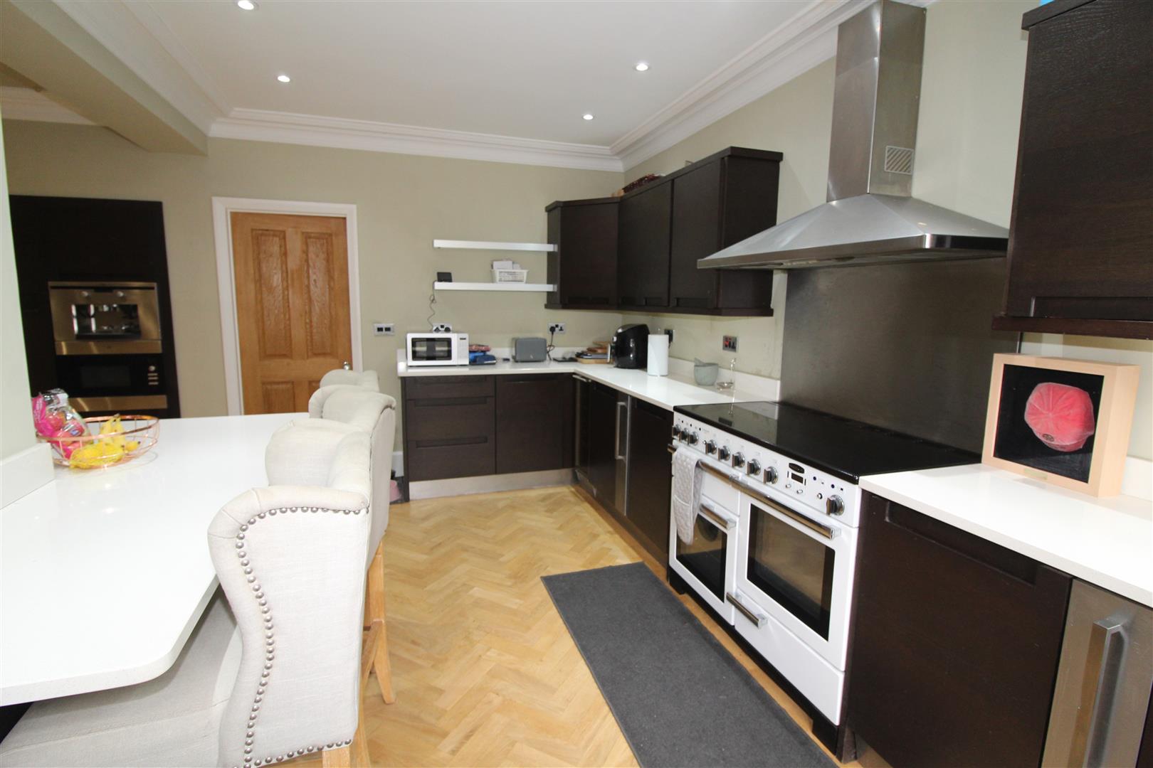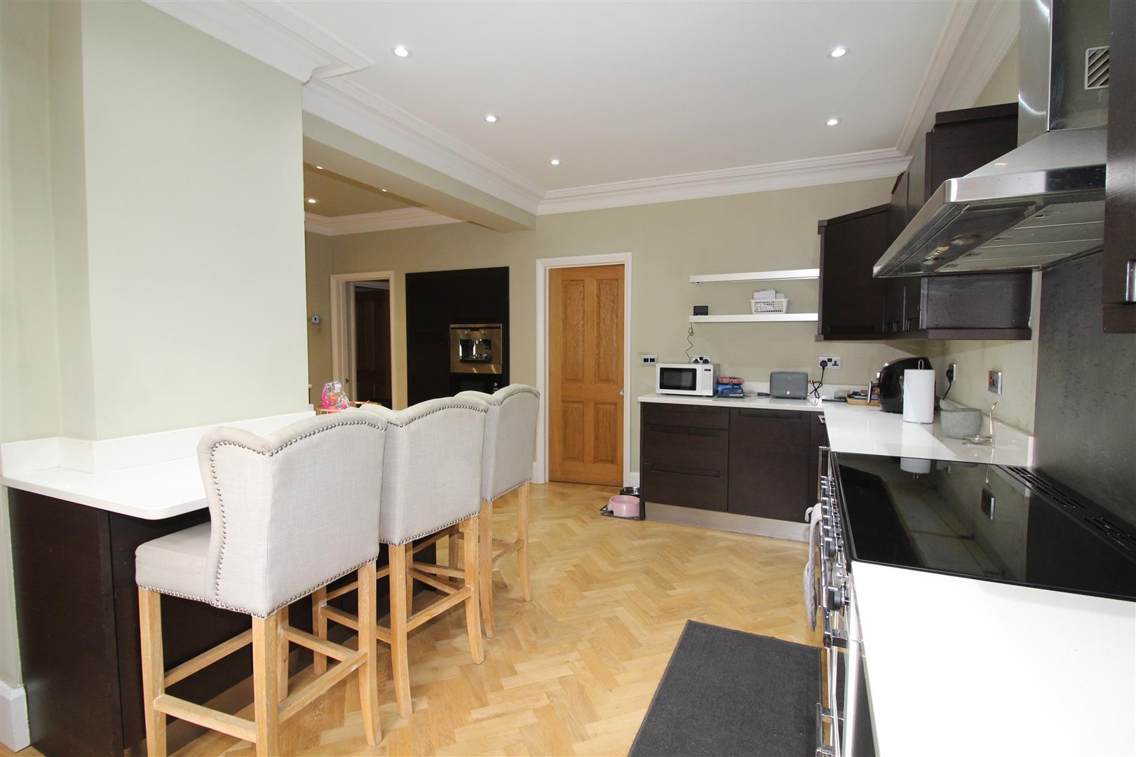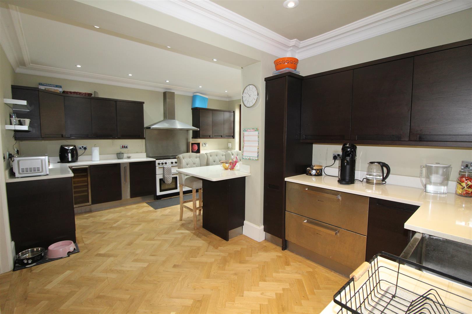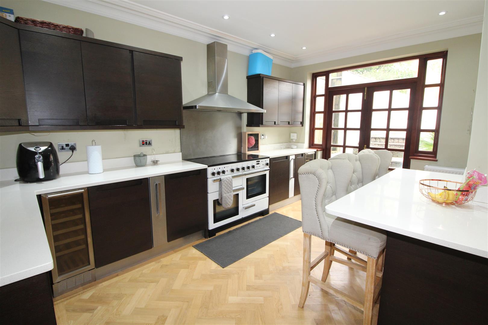 Coved and painted finish to walls and ceiling, spot lighting base and wall cabinets, stainless steel “Belfast” style sink, Rangemaster oven, extractor hood, two wine coolers, breakfast bar, wooden flooring, French doors leading to rear garden.