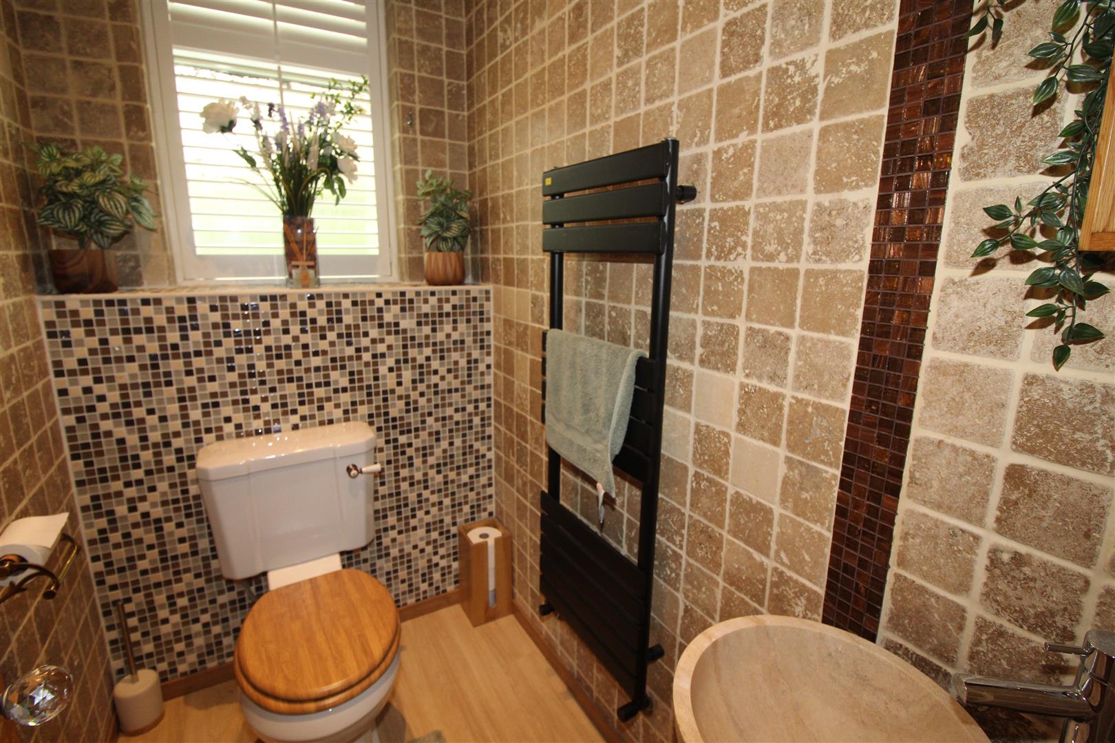 Double glazed window to side aspect with obscured glass, coved and painted finish to ceiling, tiled finish to walls and floor, low level WC, circular wash hand basin with mixer tap set in tiled vanity, heated towel rail.
