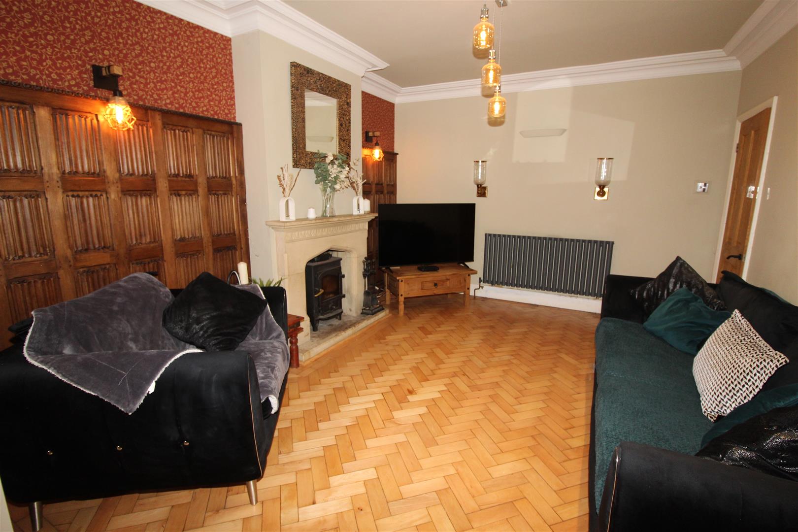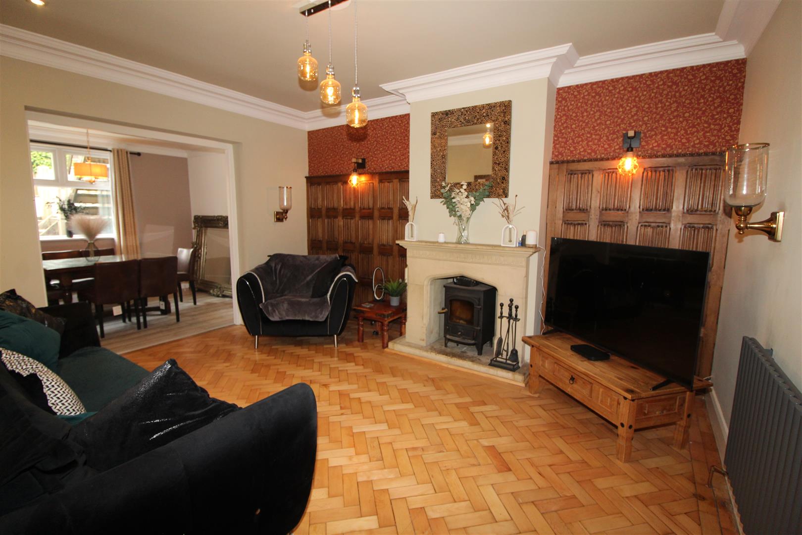 Coved and painted finish to ceiling, painted and papered finish to walls, ornamental log burner set in fireplace, adjacent wood panelling to walls, wooden flooring, radiator, opening to dining room.