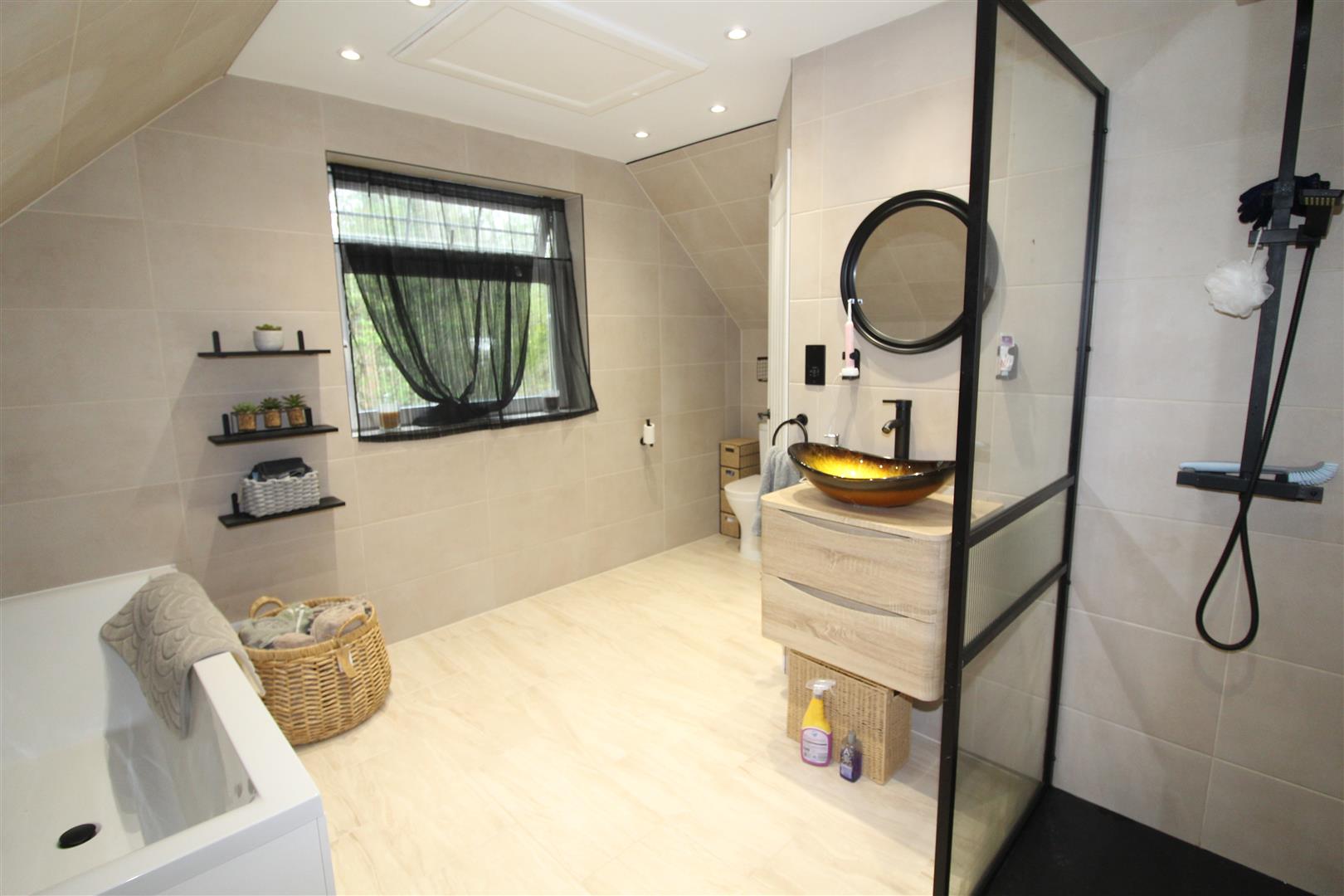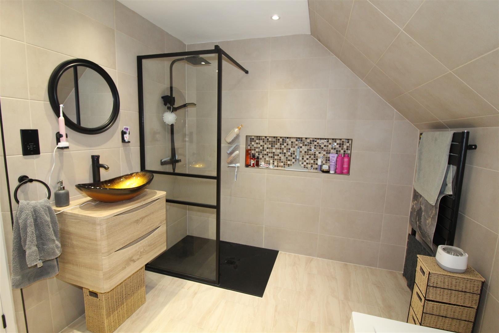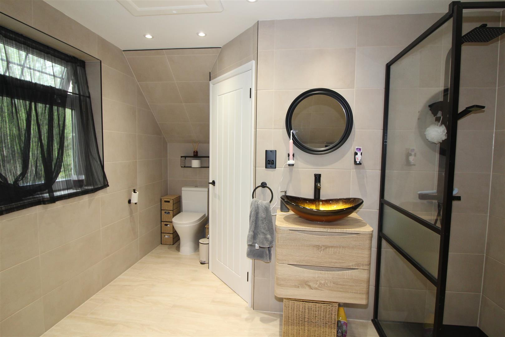 Double glazed window to side aspect, bath, walk in shower enclosure, WC, feature coloured glass sink set in vanity, heated towel rail, tiled flooring.