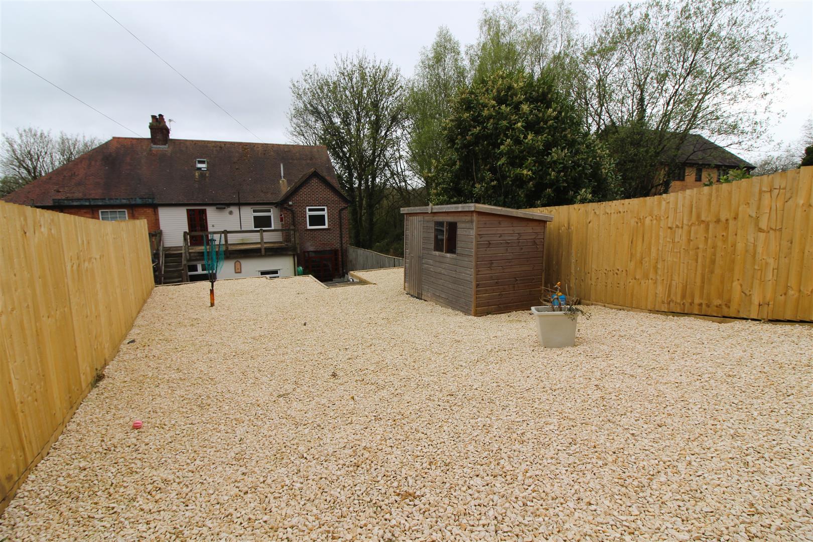 A large rear garden with timber fence boundaries, pebbled garden, paved patio and timber decking, timber steps leading to balcony (in need of repair), cold water tap.