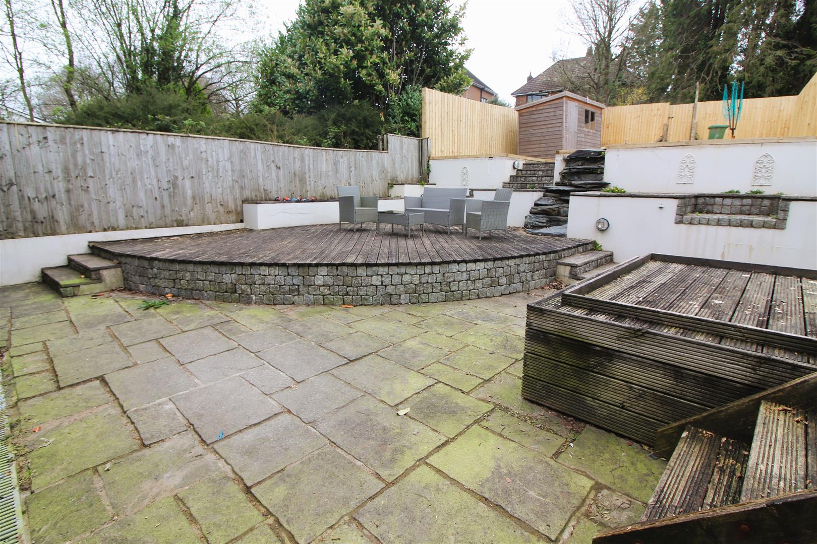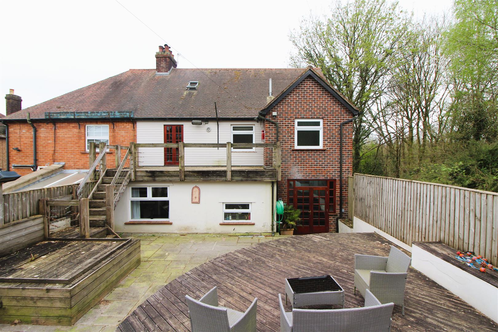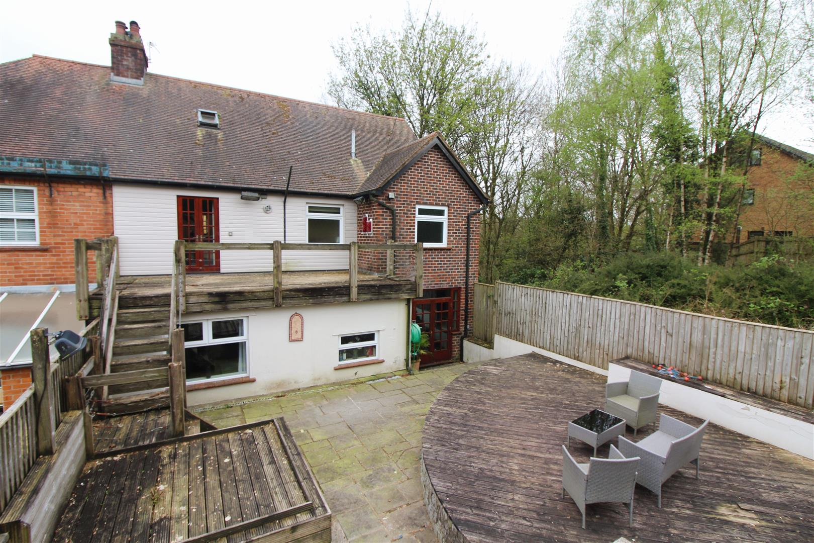 A large balcony with decking (in need of repair) wooden staircase (In need of repair) leading to rear garden.