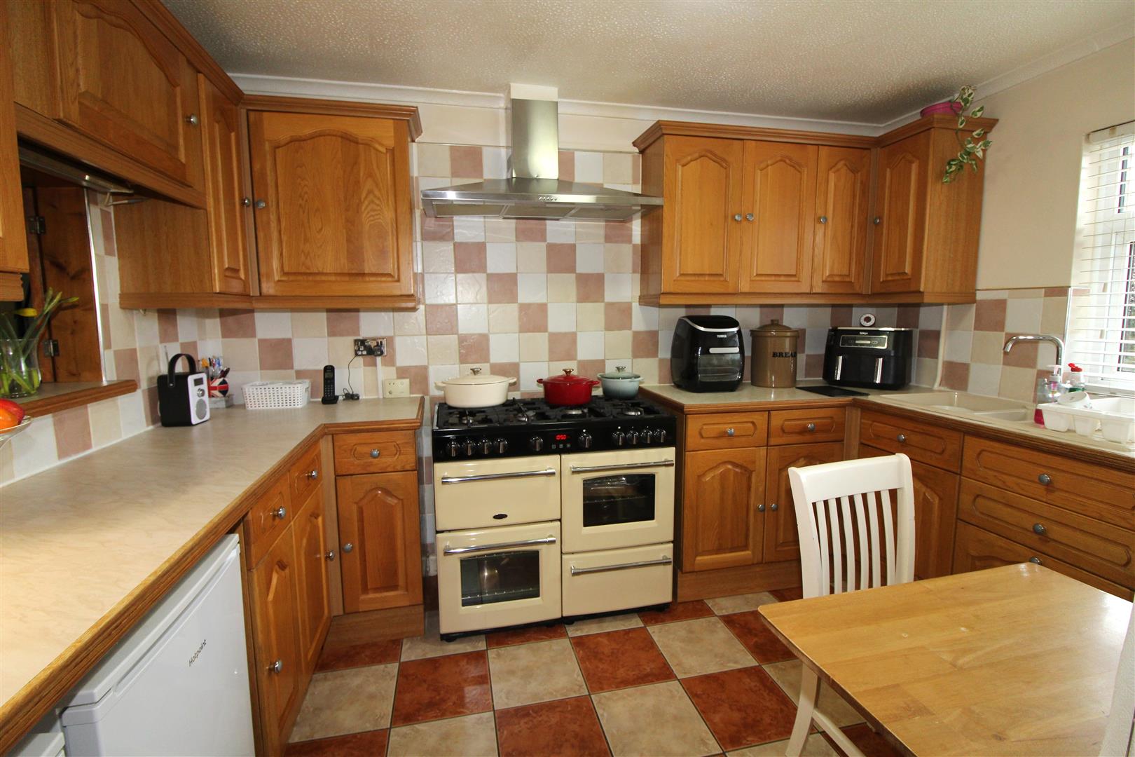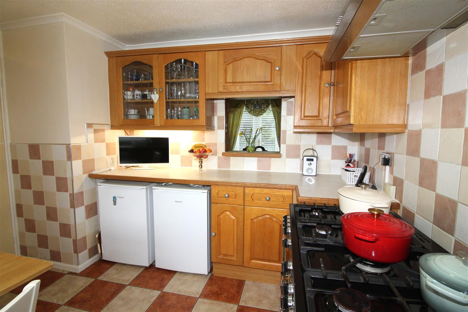 Double glazed window to rear aspect, coved and textured finish to ceiling, painted and tiled finish to walls, base and wall cabinets, bowl and a half single drainer sink, extractor hood, tiled flooring.