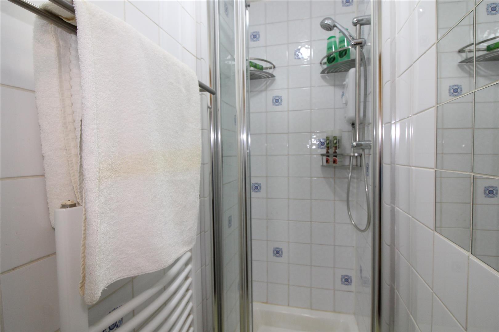 Textured finish to ceiling, tiled walls, shower enclosure with electric shower, heated towel rail, laminated wood flooring.