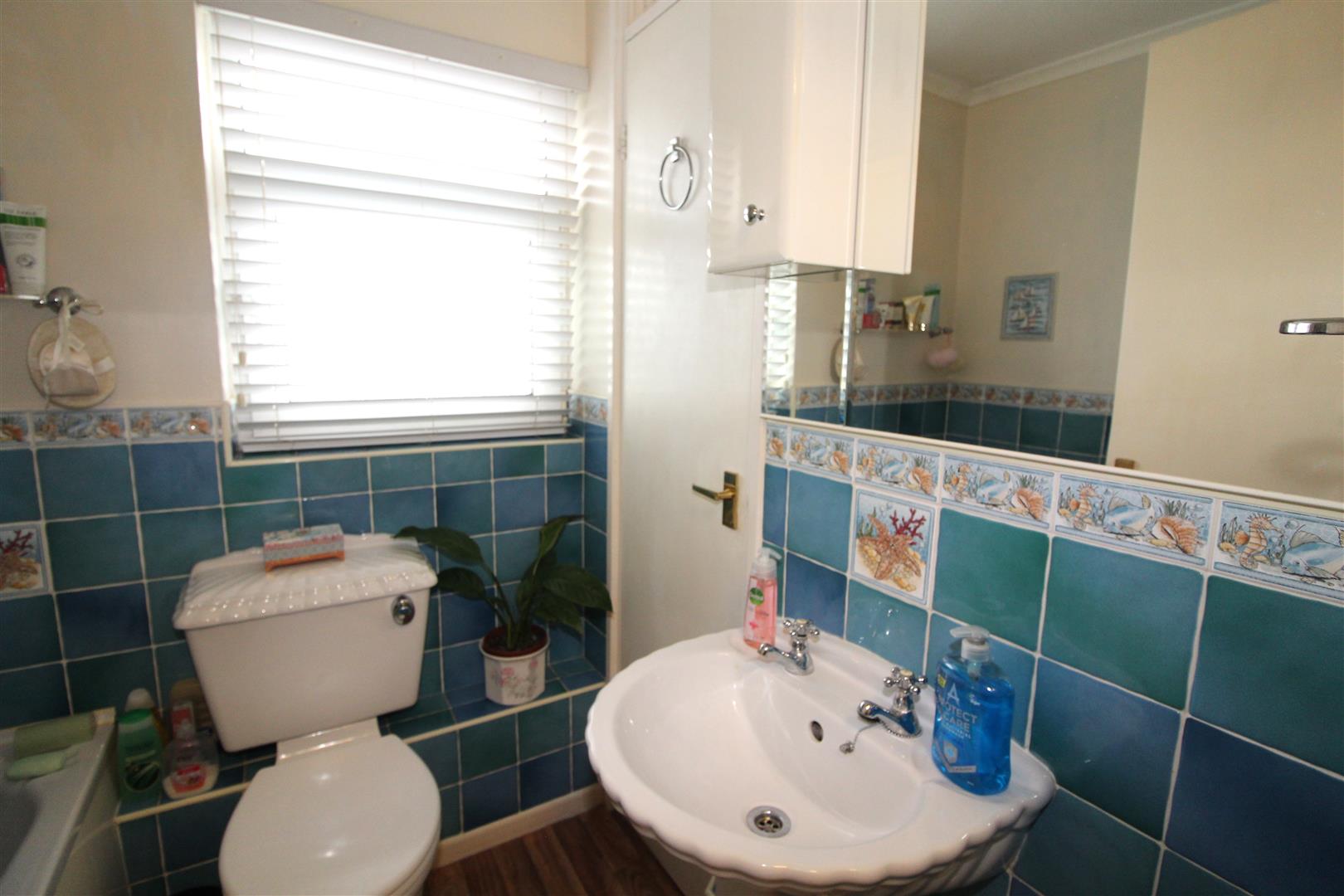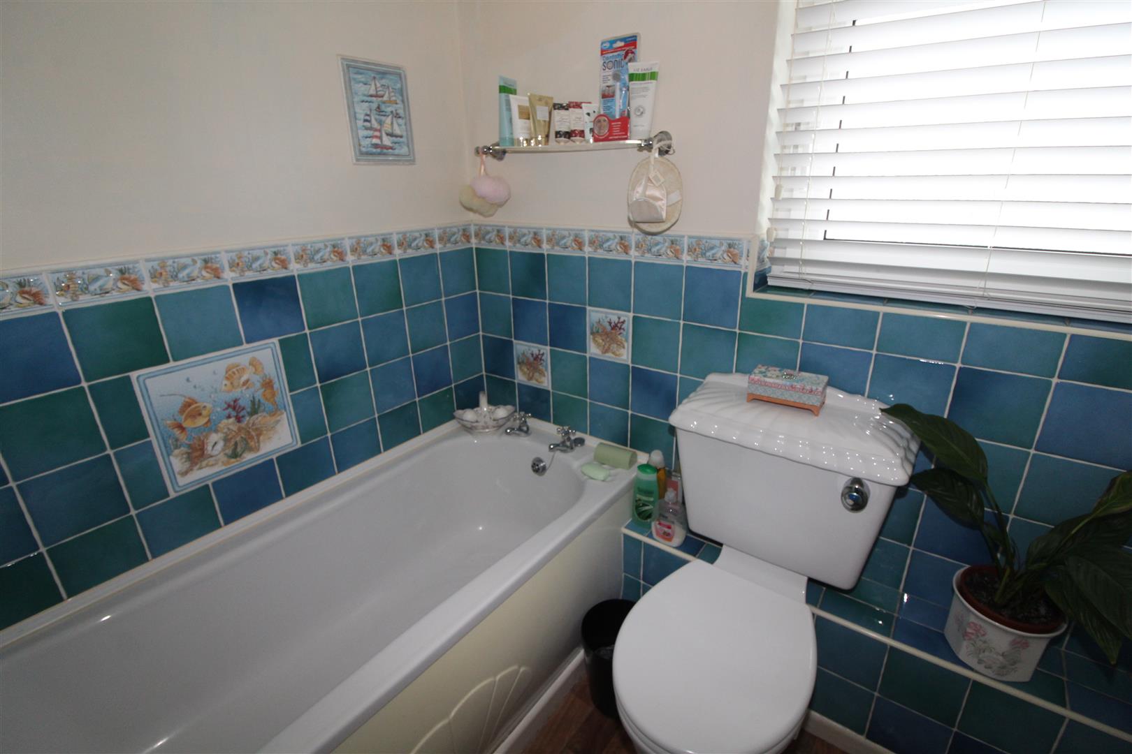 Double glazed window with obscured glass to rear aspect, coved and textured finish to ceiling, painted and tiled finish to walls, panel bath, wash hand basin, low level WC, large store cupboard.