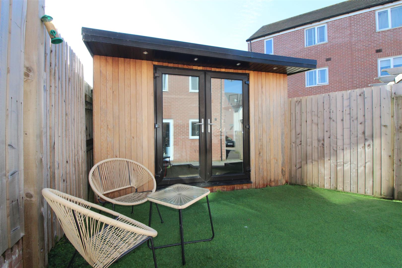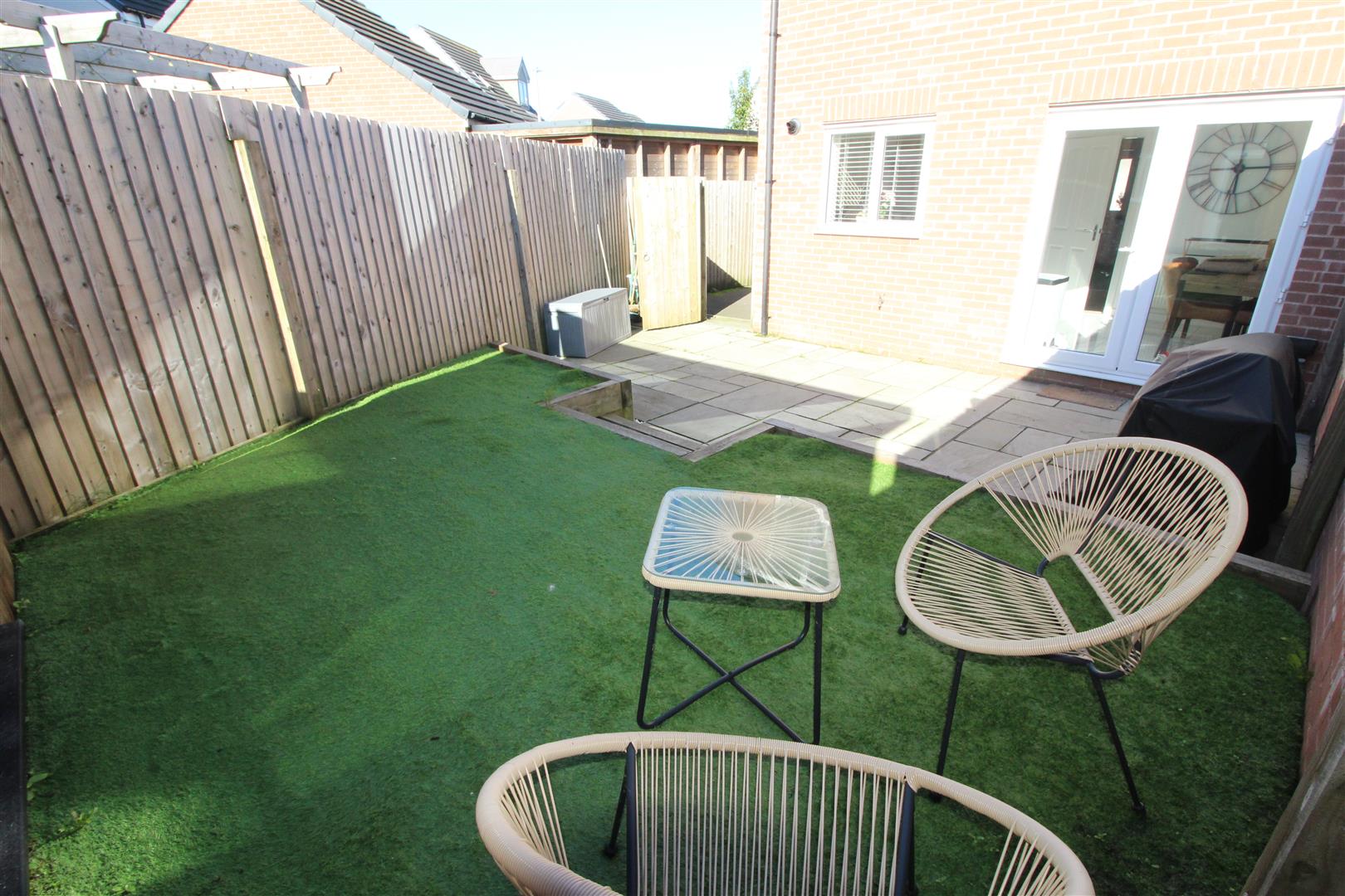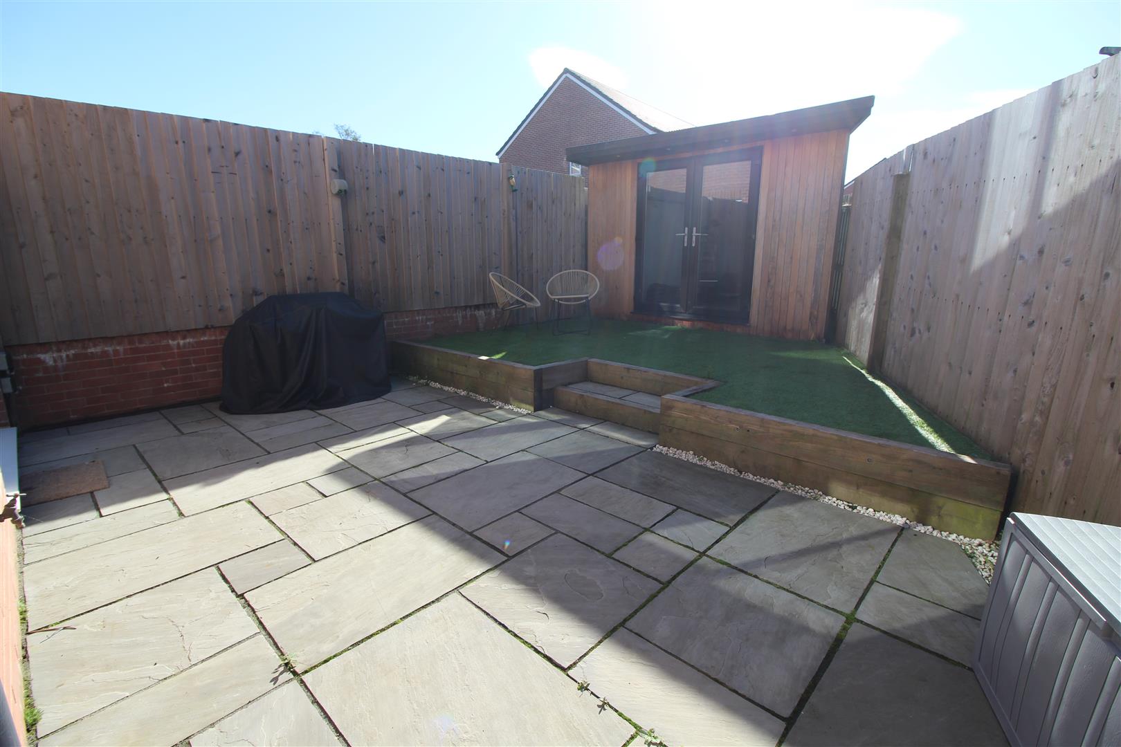 A low maintenance rear garden enclosed by high timber fencing with Indian stone paving, artificial grass, garden lighting, external power points and cold water tap.