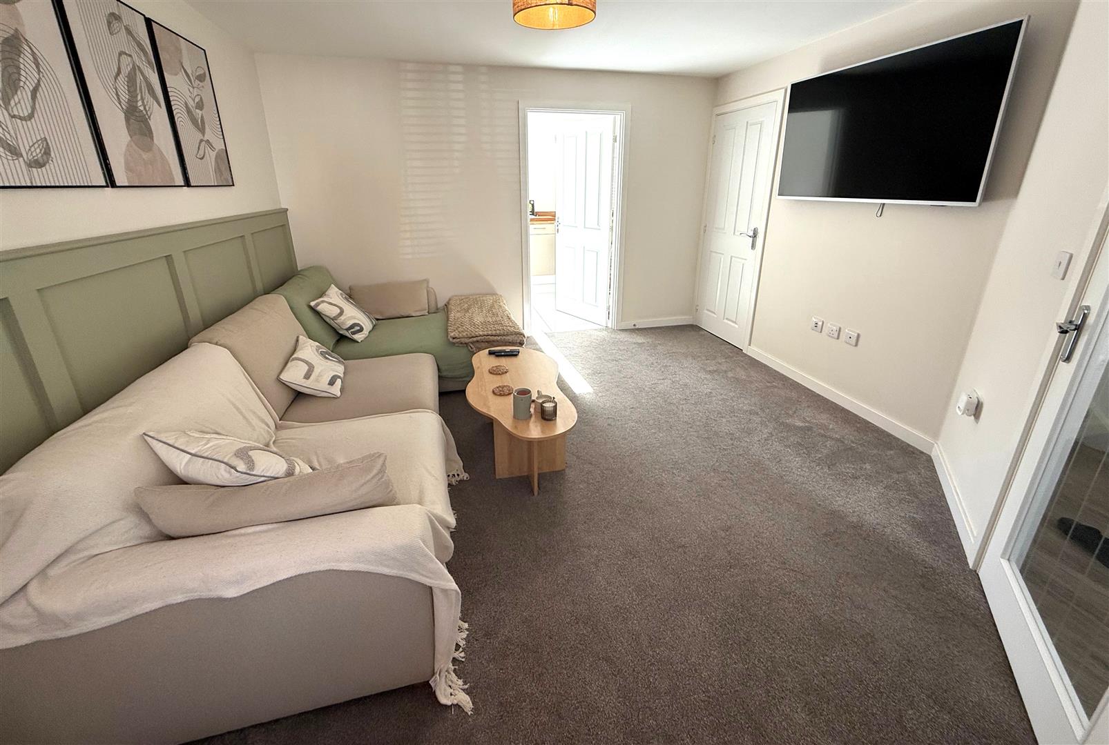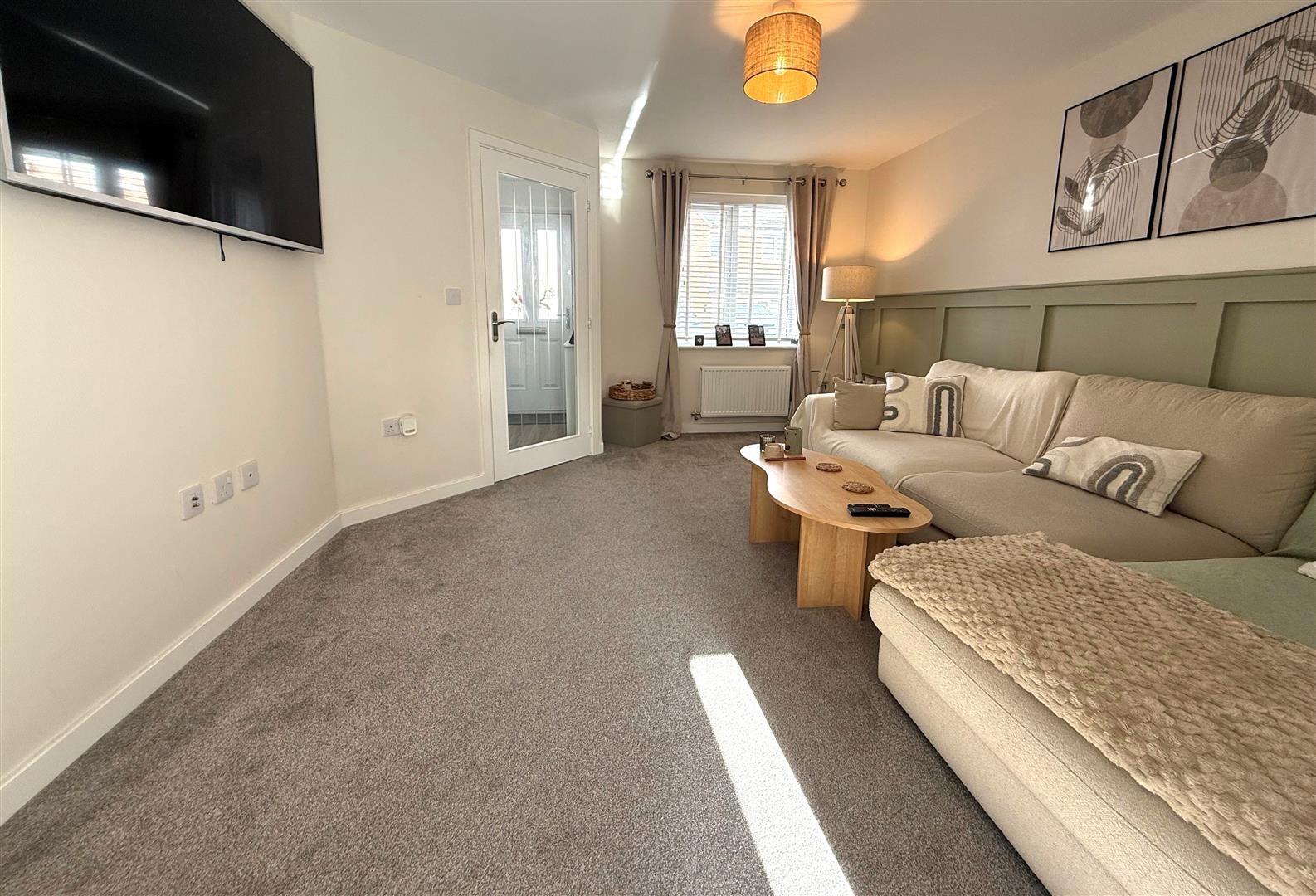 Double glazed window to front aspect, painted finish to walls and ceiling, wood panelling to walls, radiators, understairs storage cupboard, aerial box for satellite television.