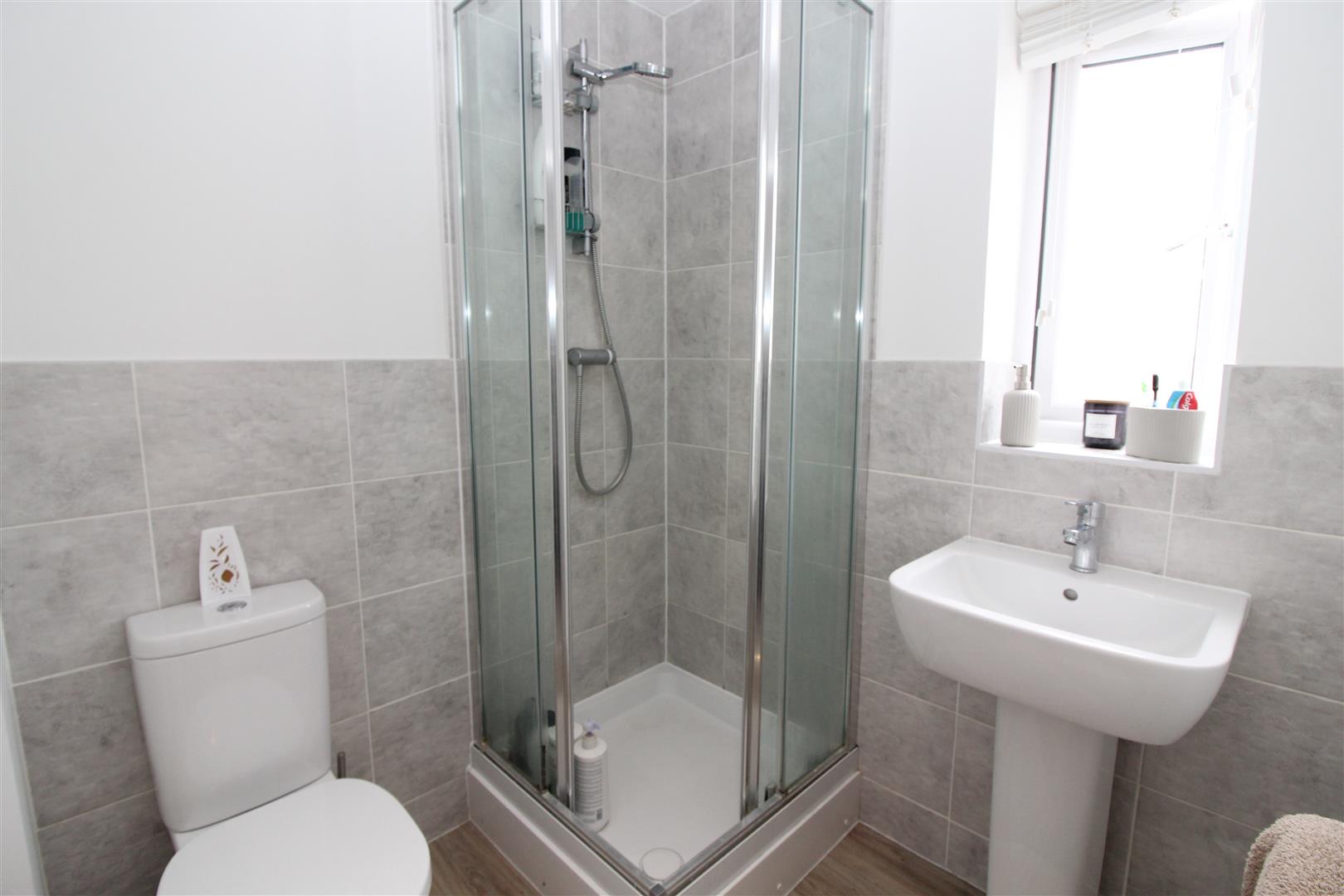 Double glazed window to front aspect with obscured glass, painted finish to ceiling, painted and tiled finish to walls, shower enclosure, low level WC, wash hand basin, luxury vinyl flooring.