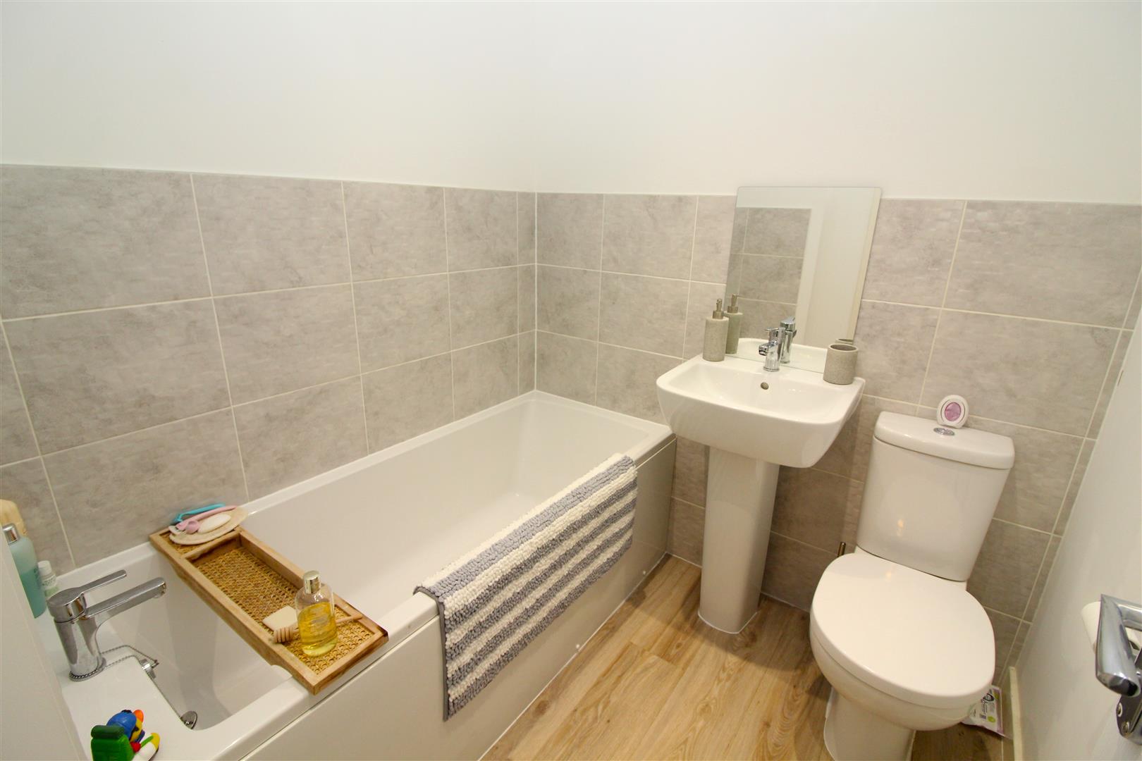 Painted finish to walls and ceiling, tiled splash backs, panel bath, pedestal wash hand basin, low level WC, luxury vinyl flooring, radiator.