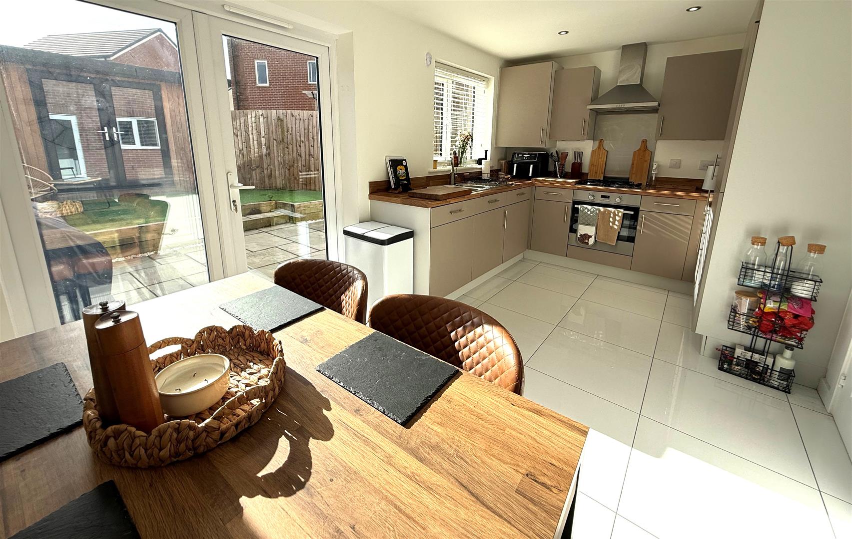 Double glazed window to rear aspect, painted finish to walls and ceiling, modern base and wall units, bowl and a half stainless steel single drainer sink with mixer tap, tiled splash backs, gas hob, electric oven, extractor hood, built in fridge/freezer, built in dishwasher and washing machine, tiled flooring, radiator, space for dining room, double glazed French doors leading to rear garden.