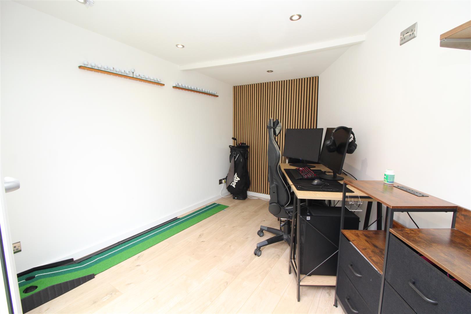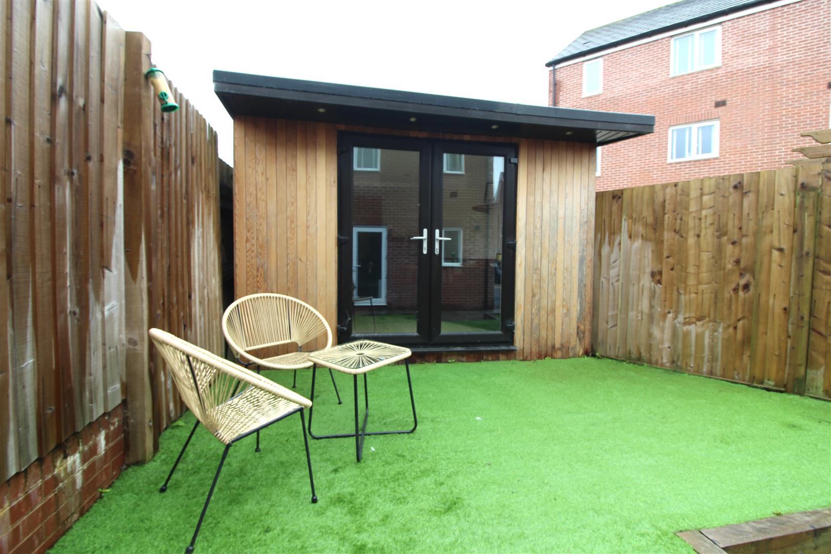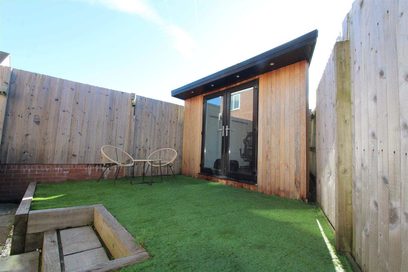 A lovely addition to the garden offering space for relaxation or office space, with double glazed French doors, painted finish to walls and ceiling, spot lighting, power and light.