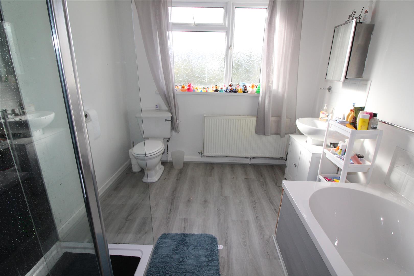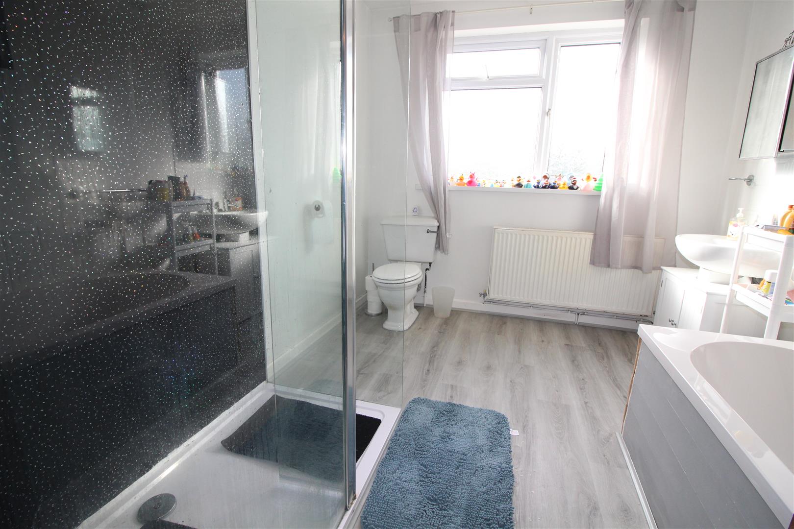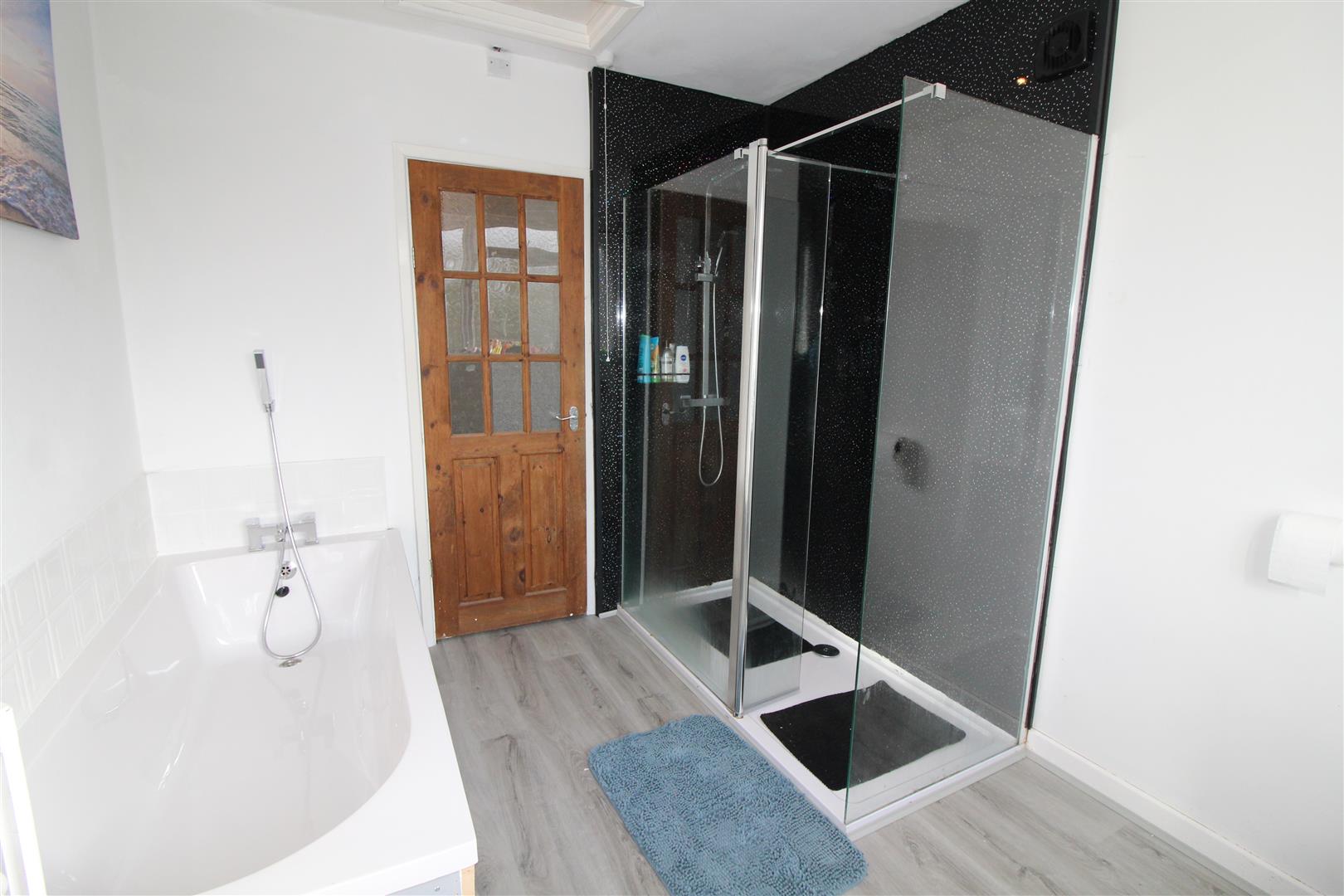 Double glazed window with obscured glass to rear aspect, painted finish to walls and ceiling, spot lighting, panel bath with mixer tap and shower attachment, walk in shower enclosure with dual shower, pedestal wash hand basin, low level WC, radiator.
