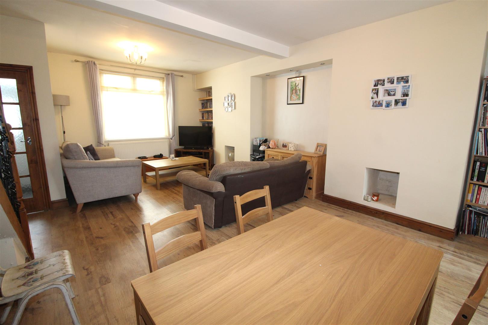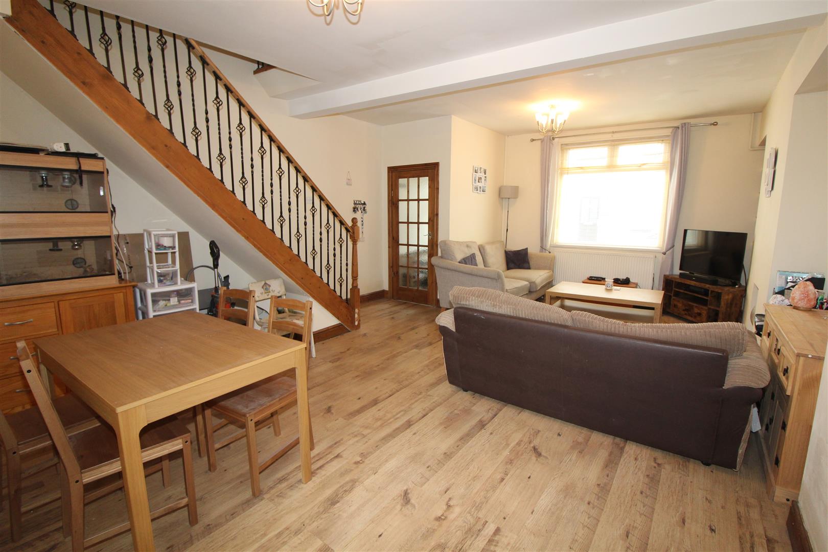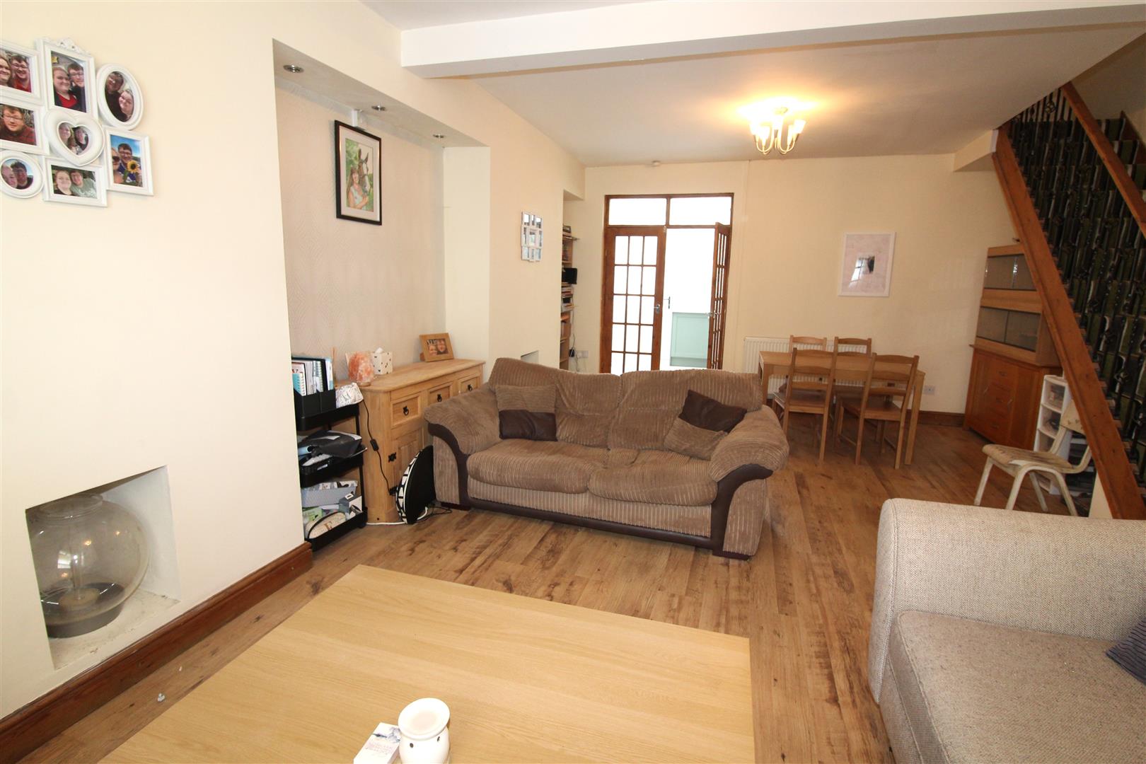 Double glazed window to front aspect, painted finish to walls and ceiling, laminated wood flooring, stairs leading to first floor accommodation, two radiators, double doors leading to kitchen/breakfast room.