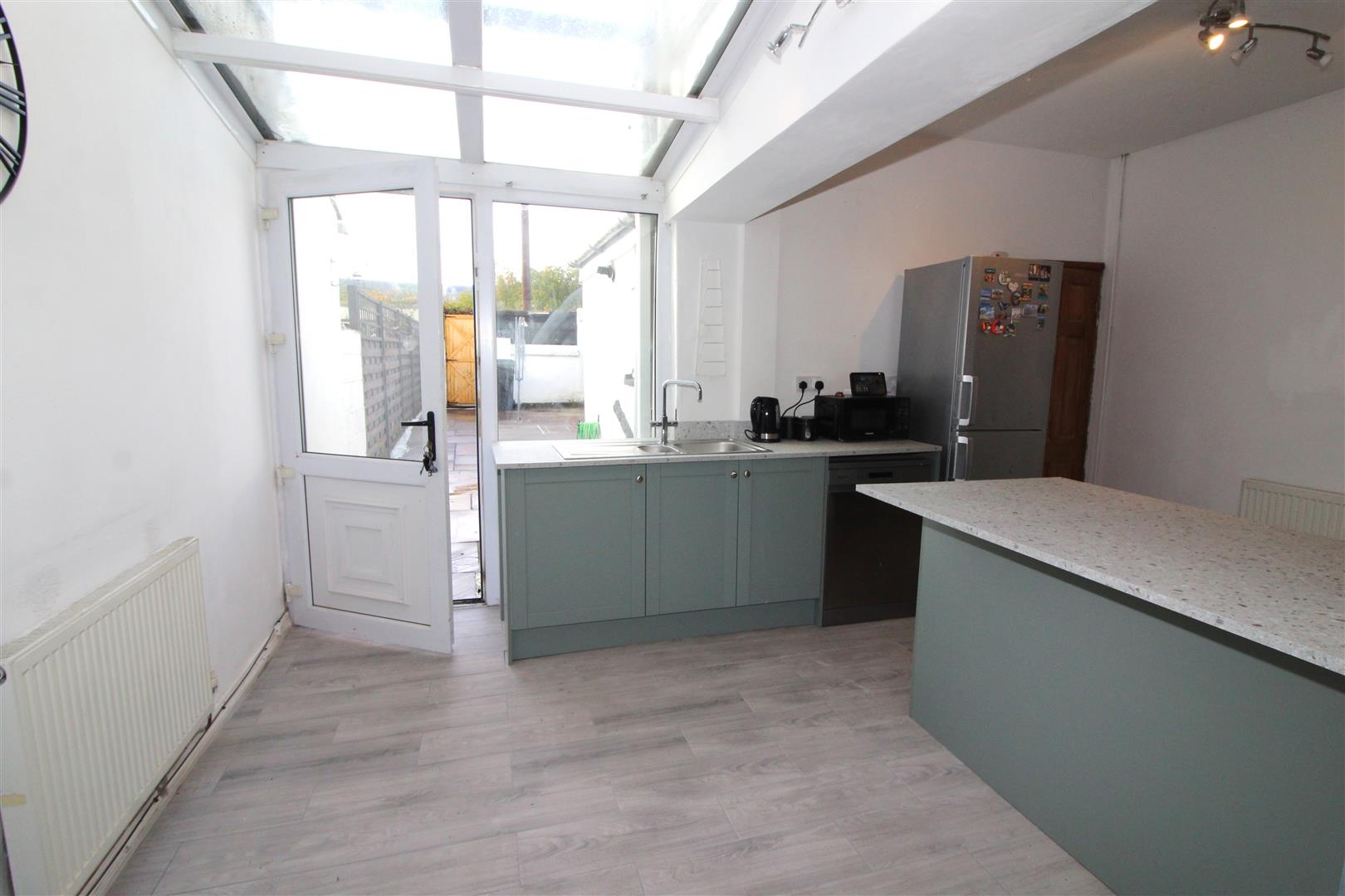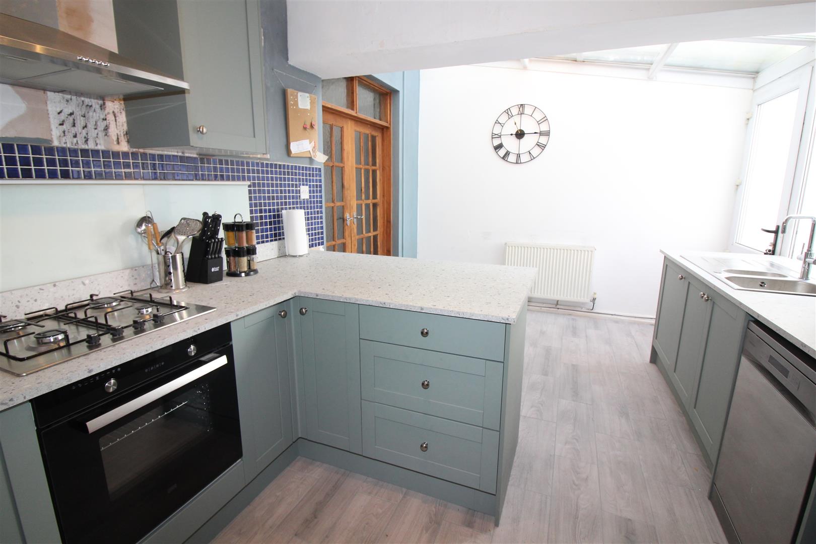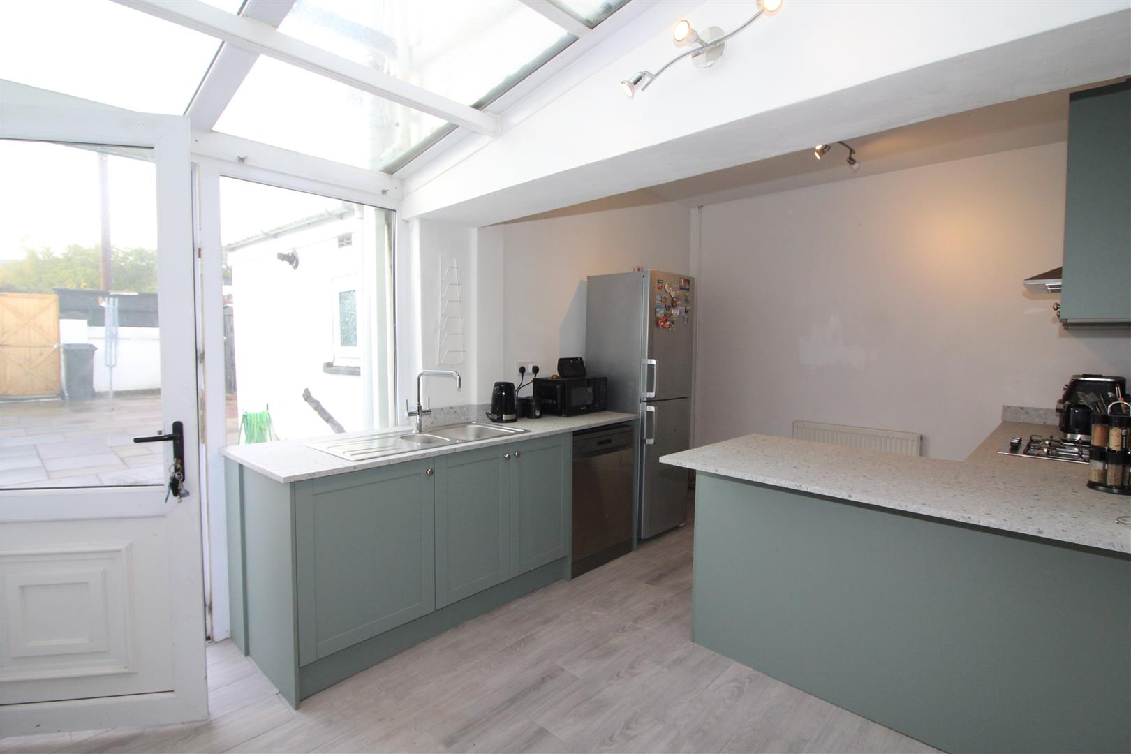 Double glazed window to rear aspect, painted finish to walls and ceiling with glazed roof in breakfast area, modern base and wall units, bowl and a half stainless steel single drainer sink, gas hob, extractor hood, electric oven, plumbing for dishwasher, space for fridge/freezer and dining table, tiled flooring, double glazed door leading to rear garden.