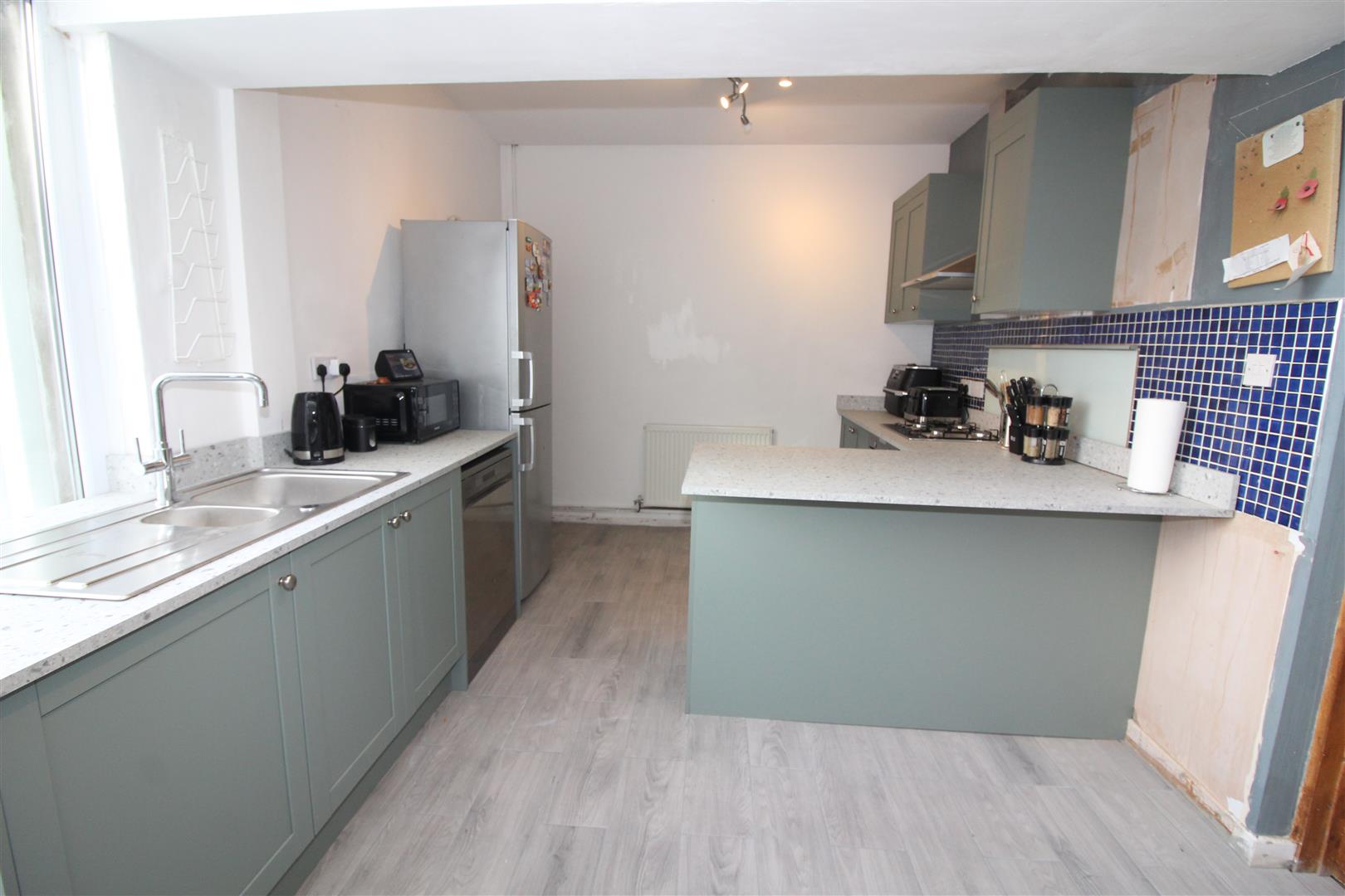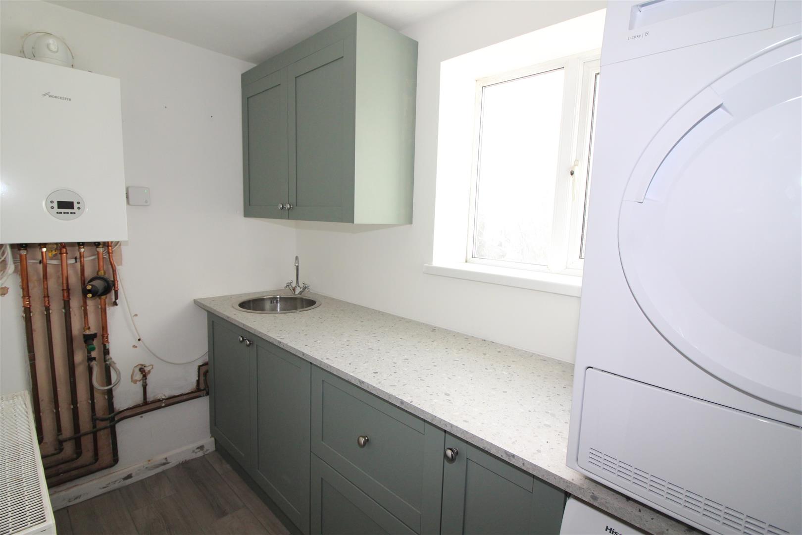 Double glazed window to rear aspect, painted finish to walls and ceiling, base and wall cabinets, stainless steel circular sink, plumbing for automatic washing machine, radiator, tiled flooring, wall mounted gas central heating combination boiler.