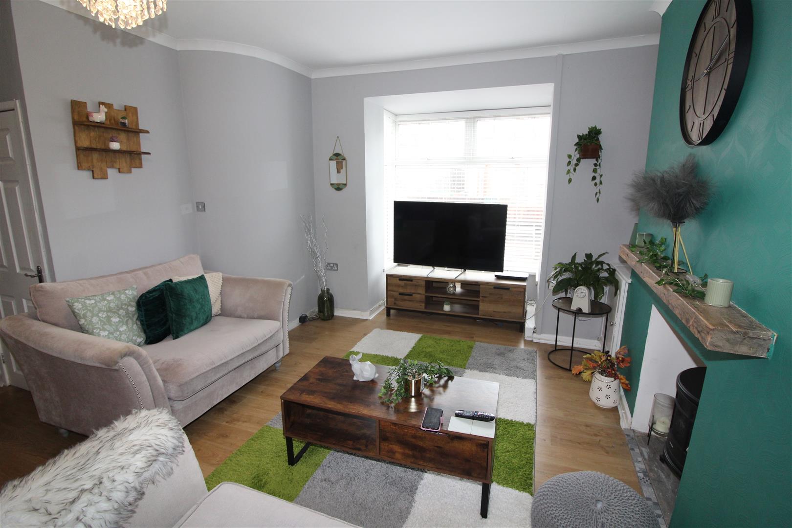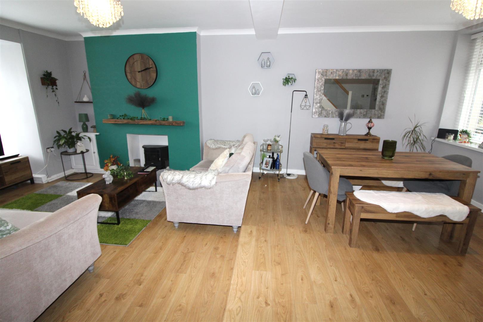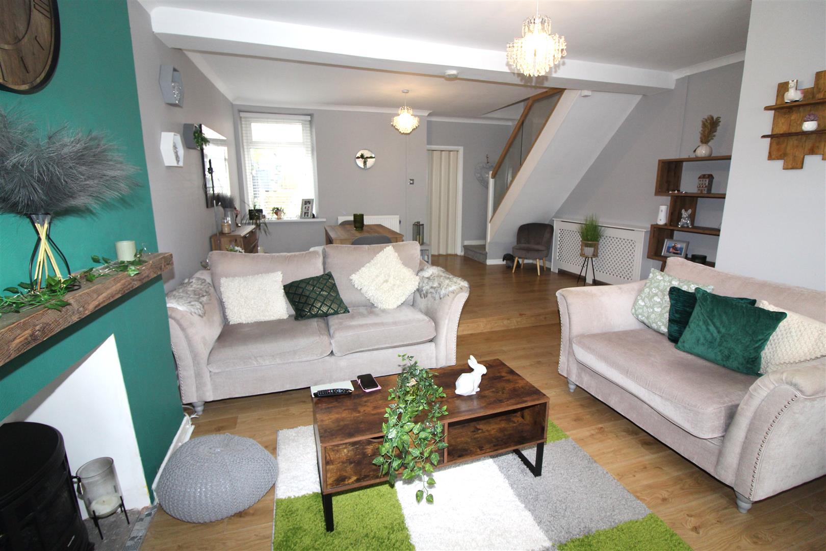 Double glazed square bay window to front aspect, double glazed window to rear aspect, coved and painted finish to ceiling, papered and painted finish to walls, laminated wood flooring, stairs to first floor with glass balustrading, three radiators.