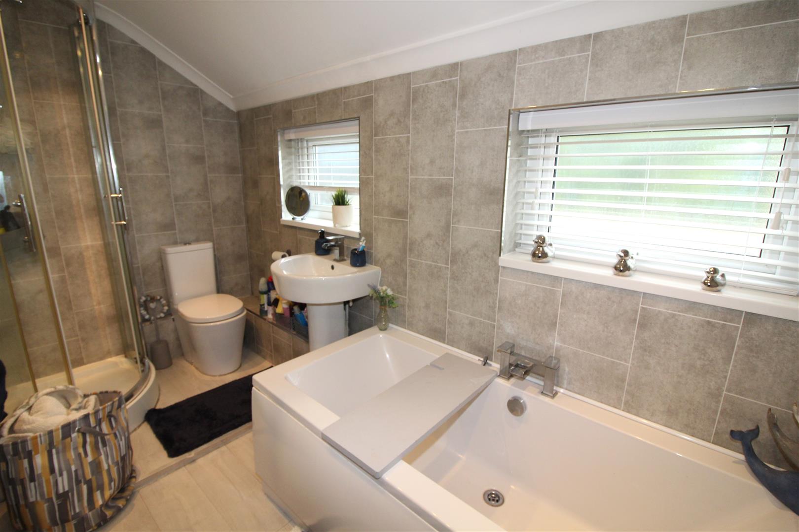 Two double glazed windows to rear aspect with obscured glass, coved and painted finish to ceiling, spotlighting, extractor fan, corner shower enclosure, bath, low level WC, wash hand basin, radiator, laminated wood flooring.