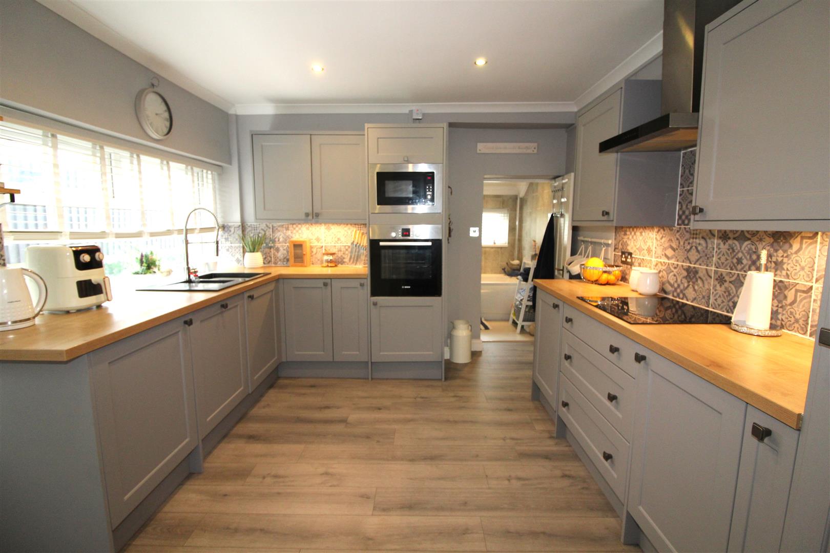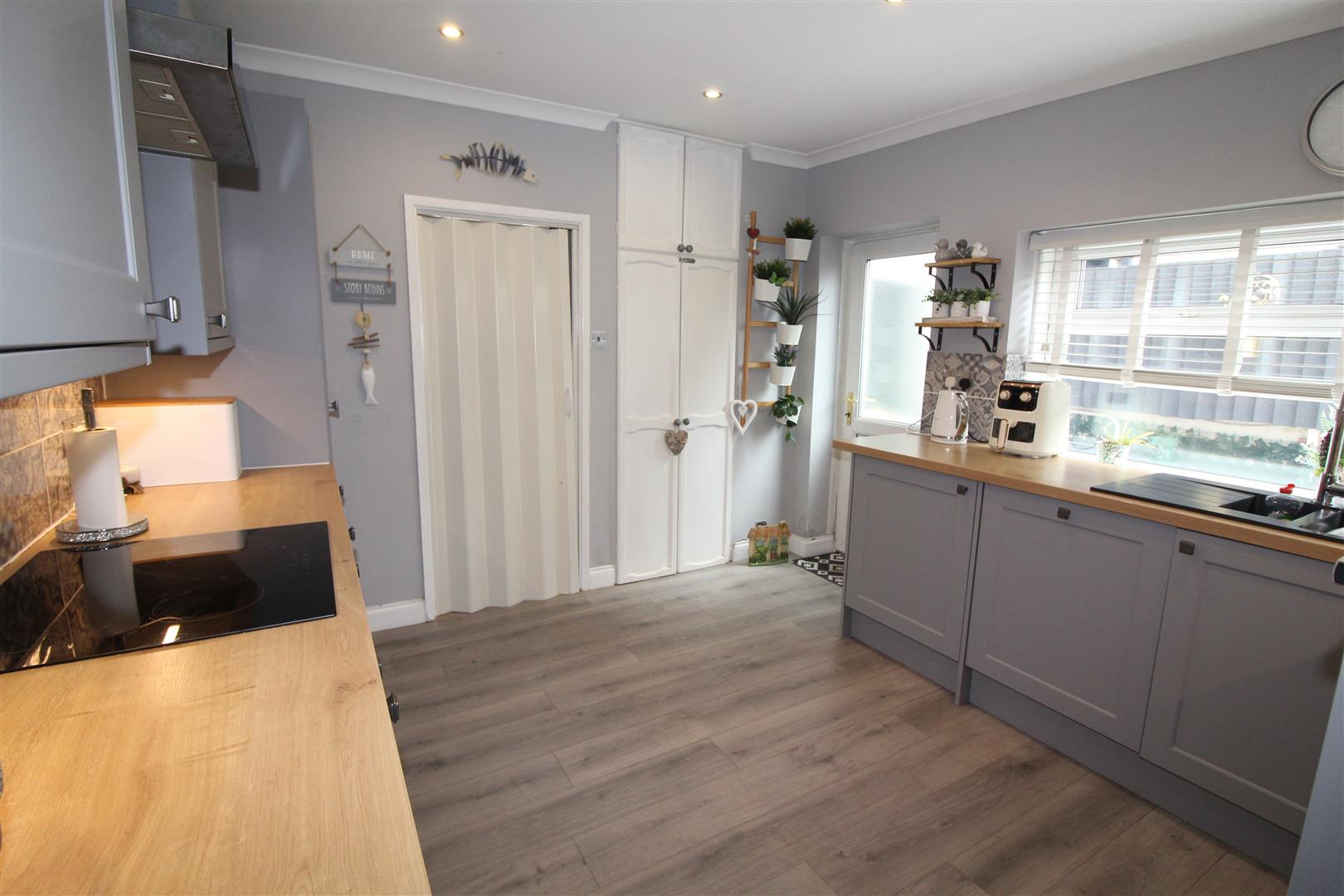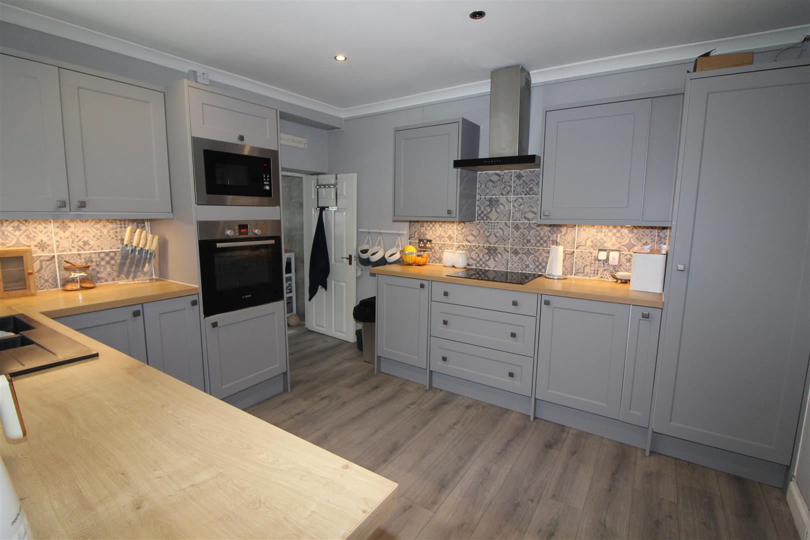 Double glazed window to side aspect, coved and painted finish to walls and ceiling, modern base and wall cabinets, tiled splash backs, bowl and a half single drainer sink, electric hob, extractor hood, microwave, sys level oven, built in dishwasher and fridge/freezer, lamented wood flooring, built in tall cupboard., double glazed door leading to outside.