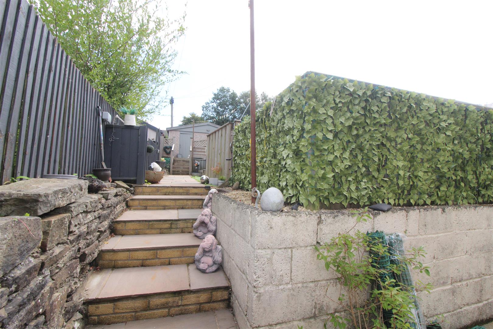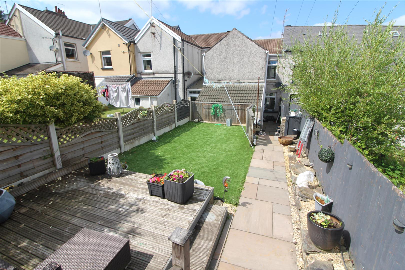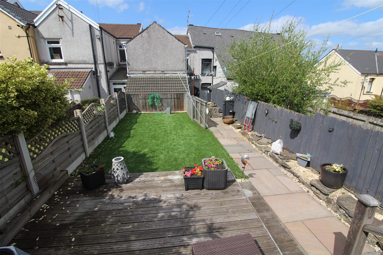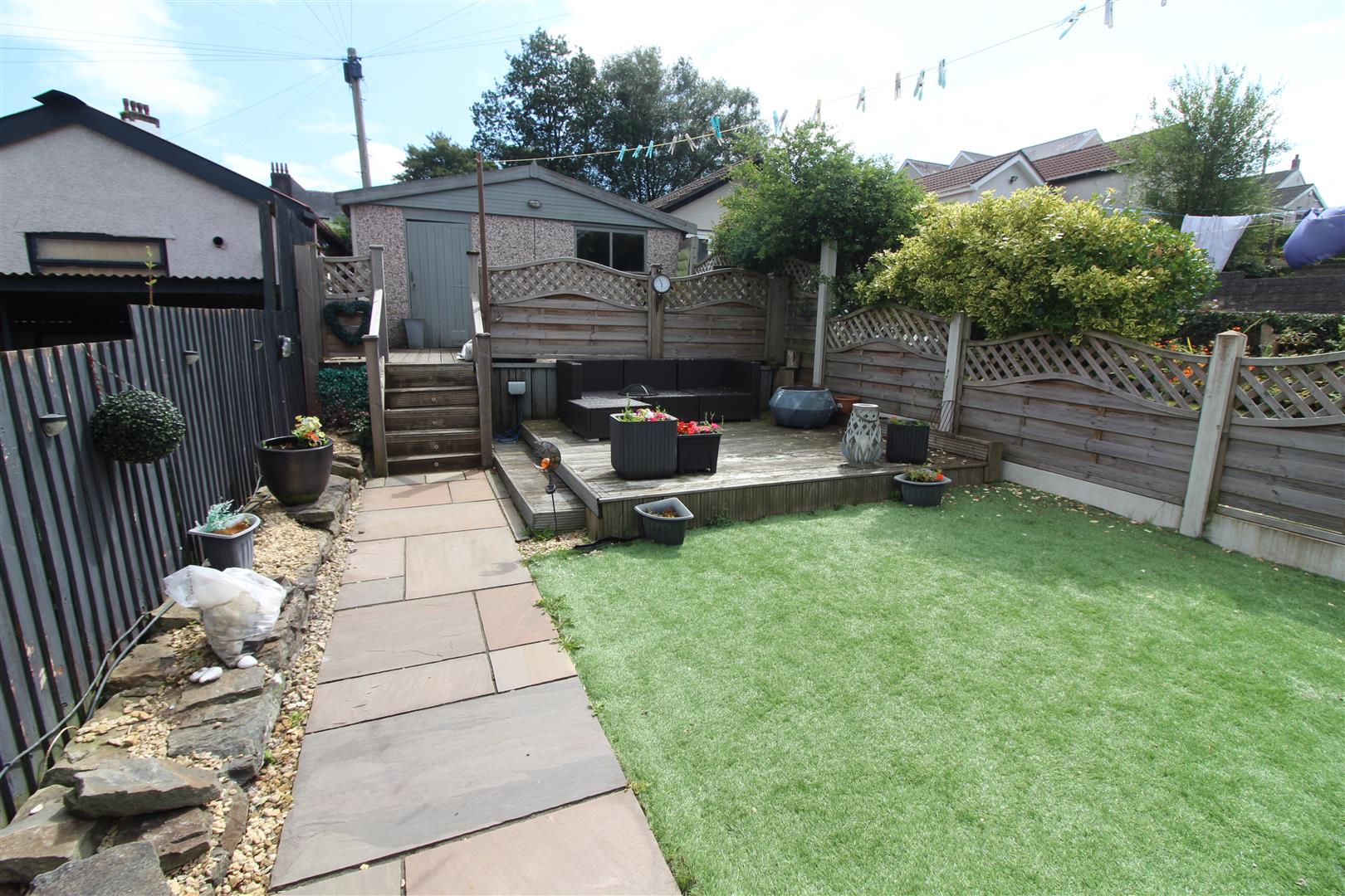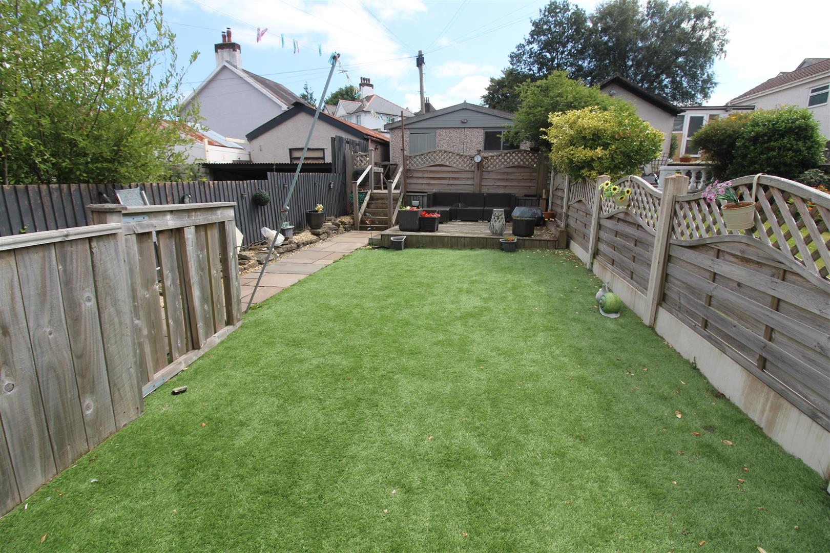 Courtyard leading to garden with Indian stone paving, artificial grass, decked seating area, steps up to further decking and access to garage, cold water tap.