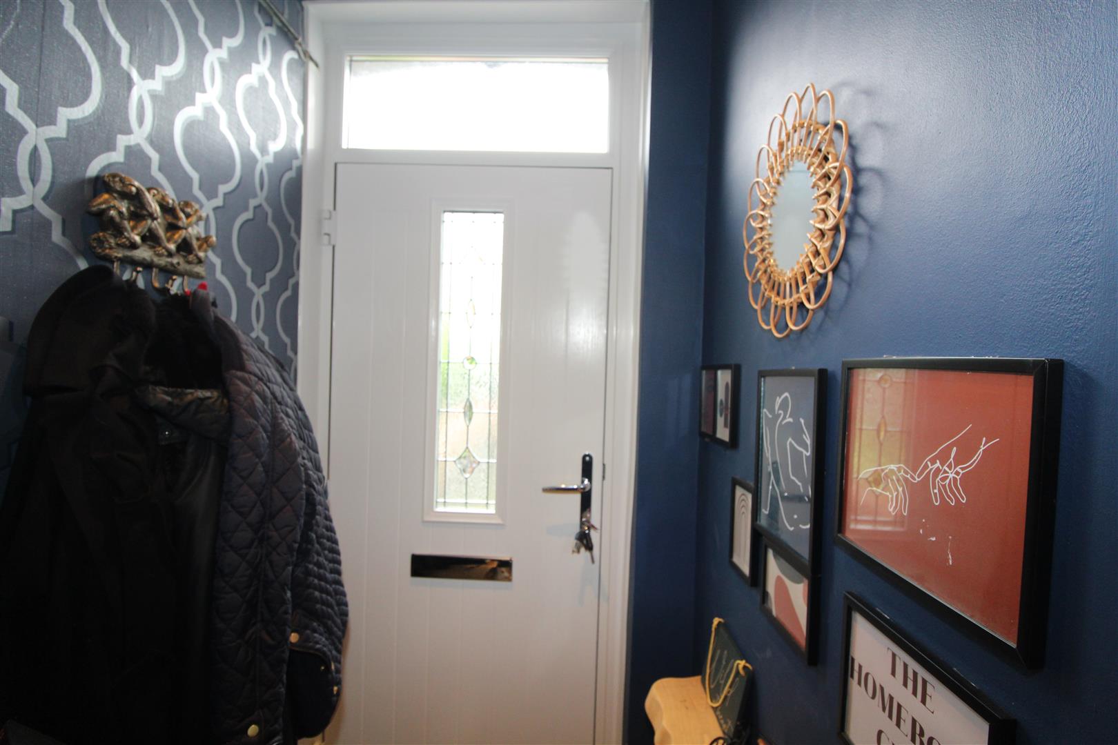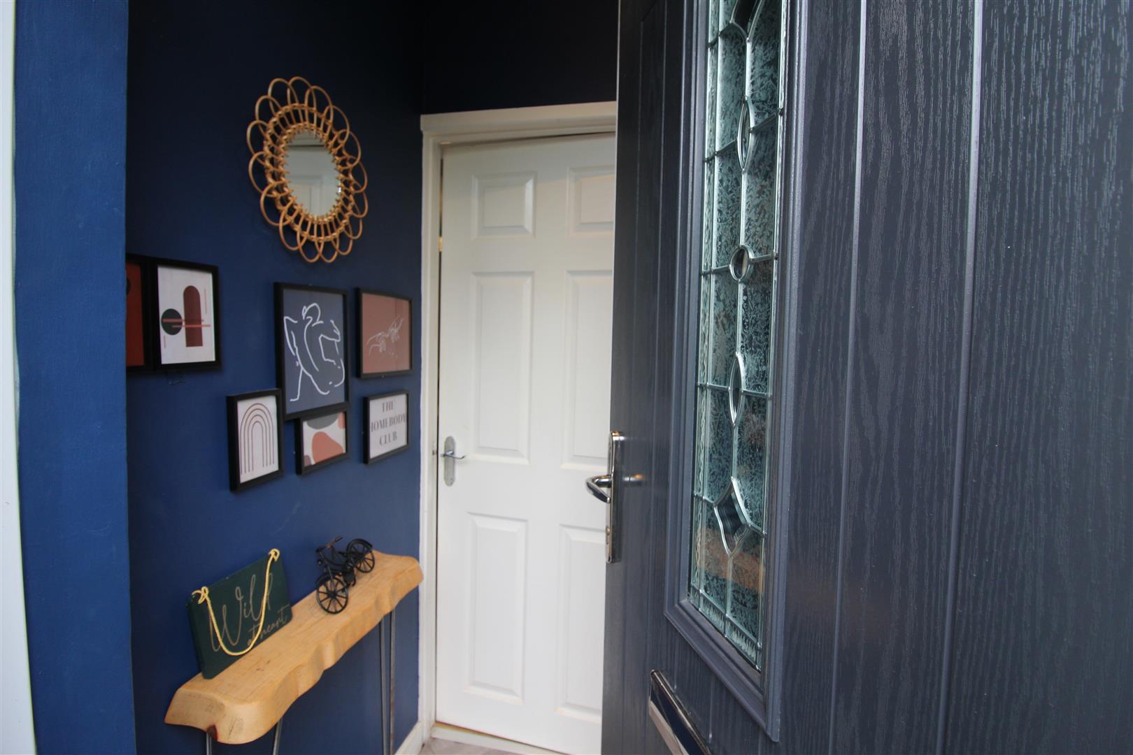 Double glazed composite door, textured finish to ceiling, painted and papered finish to walls.