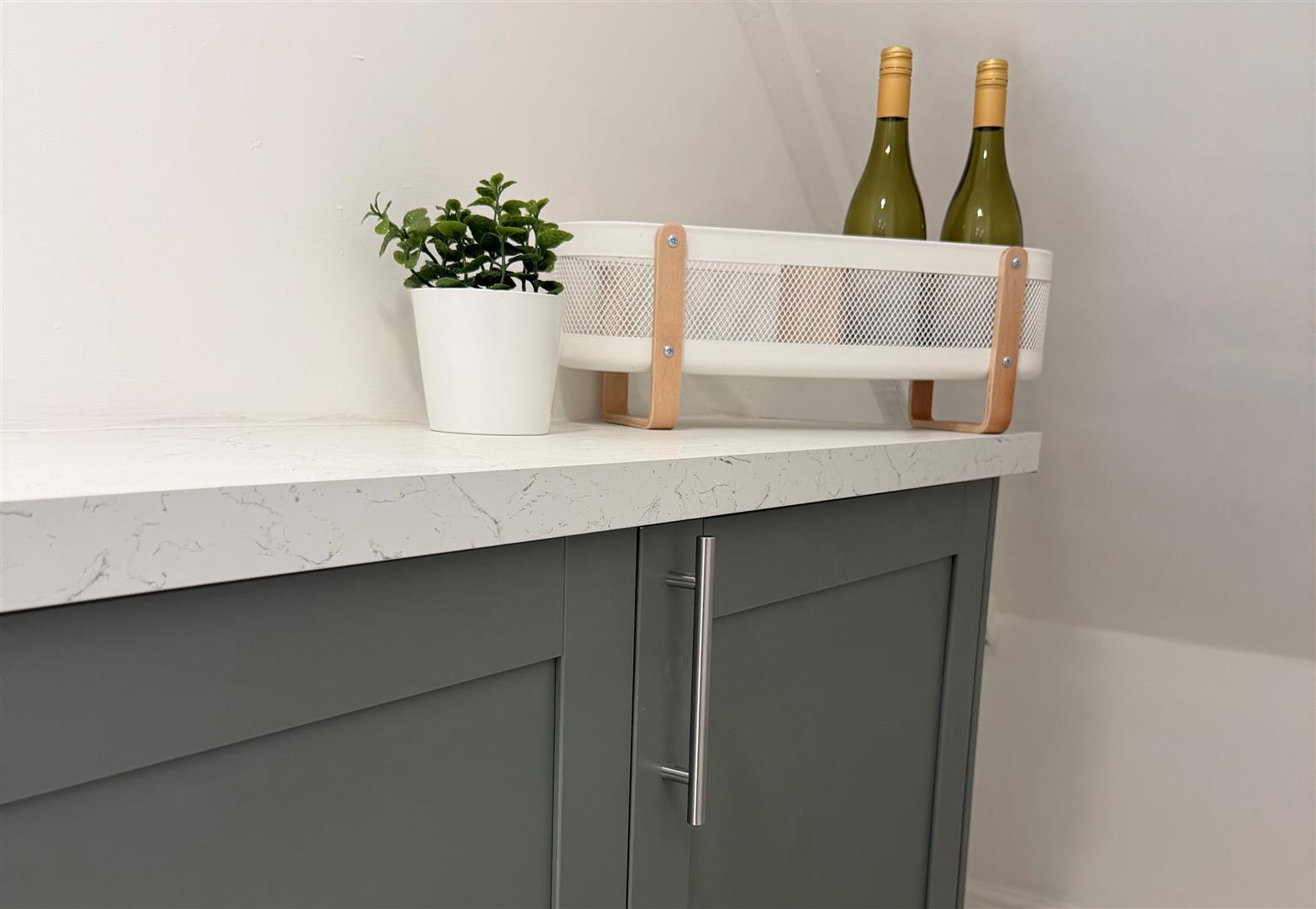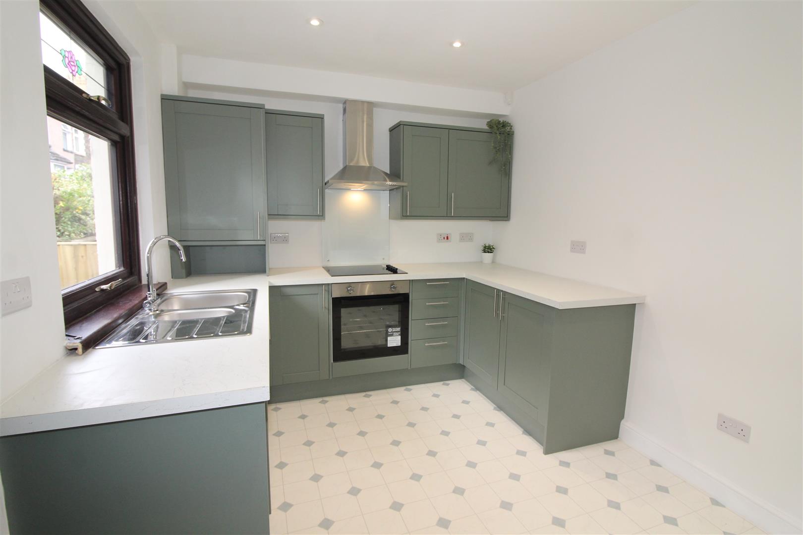 Double glazed window to side aspect, painted finish to walls and ceiling, spot lighting, modern base and wall cabinets, bowl and a half stainless steel single drainer sink, electric oven, hob and extractor fan, plumbing for automatic washing machine, space for fridge/freezer, tall radiator, understairs alcove with base cabinet storage and lighting, double glazed door leading to rear garden.