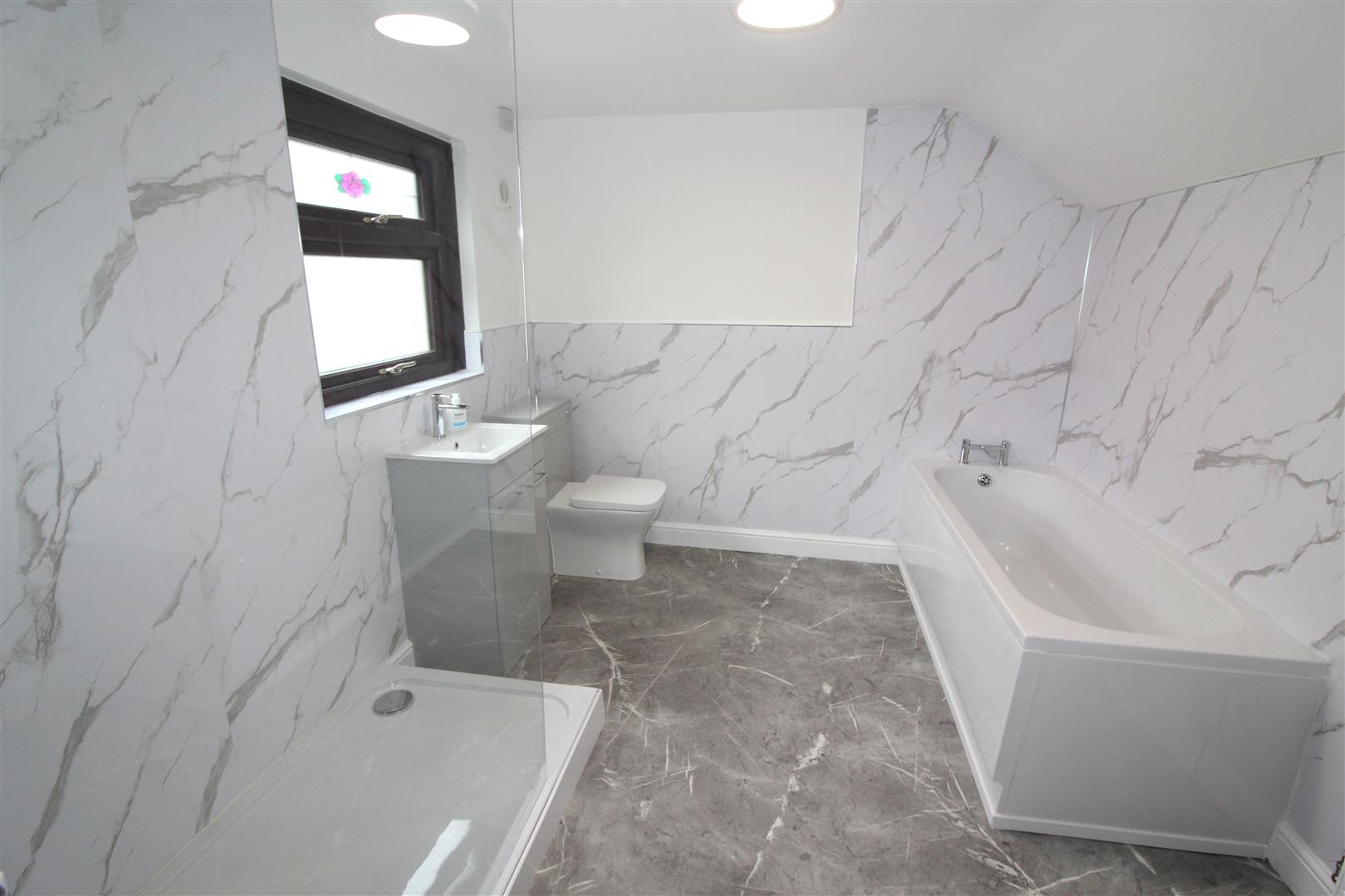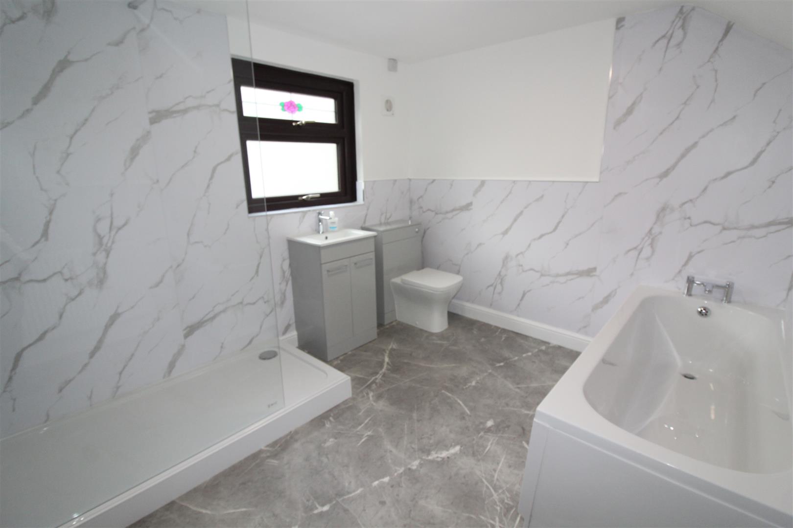 Double glazed window to side aspect with obscured glass, painted finish to ceiling, painted and cladding finish to walls, large walk in shower with dual shower, bath with mixer tap, wash hand basing set in vanity unit, low level WC, radiator, extractor fan.