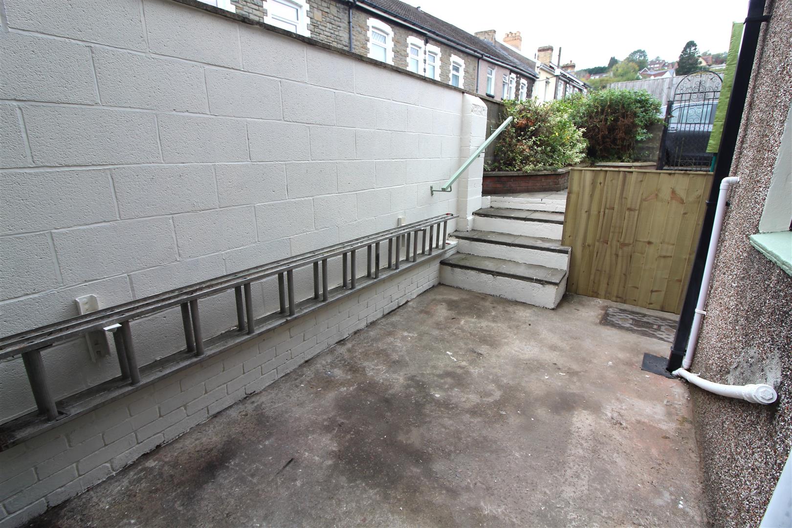 An enclosed rear garden with courtyard, outside WC, leading to paved garden with raised flower beds, gated access leading to rear lane access.