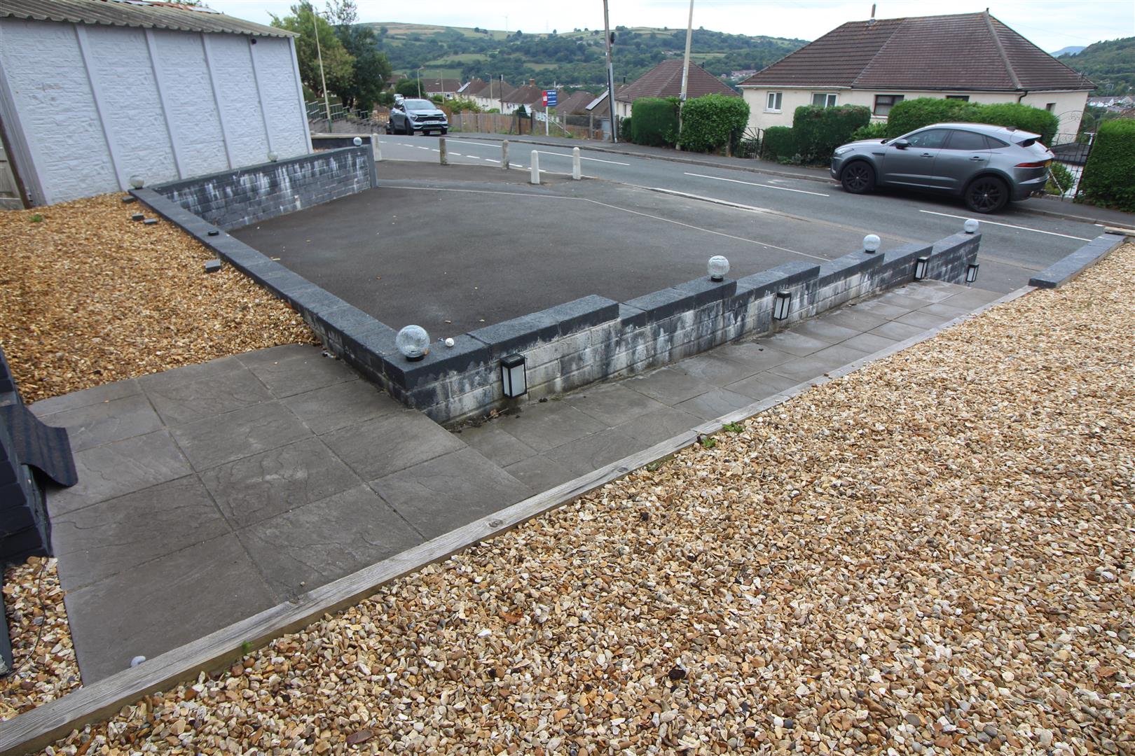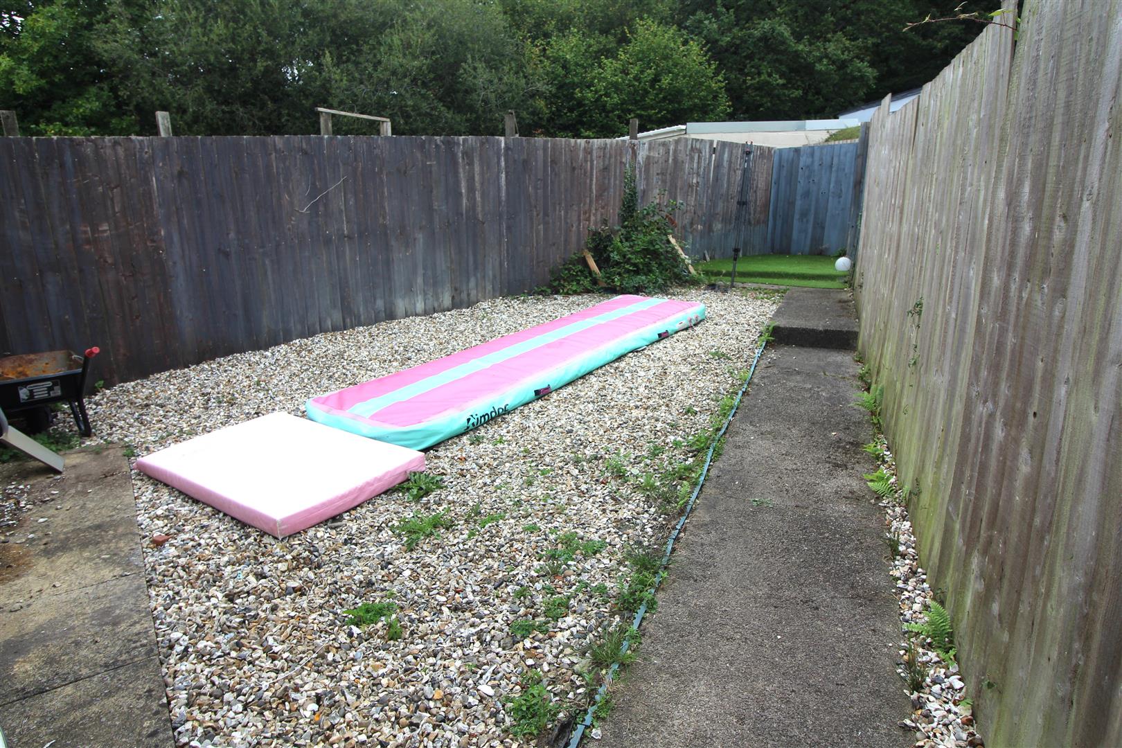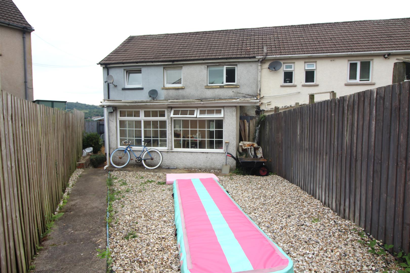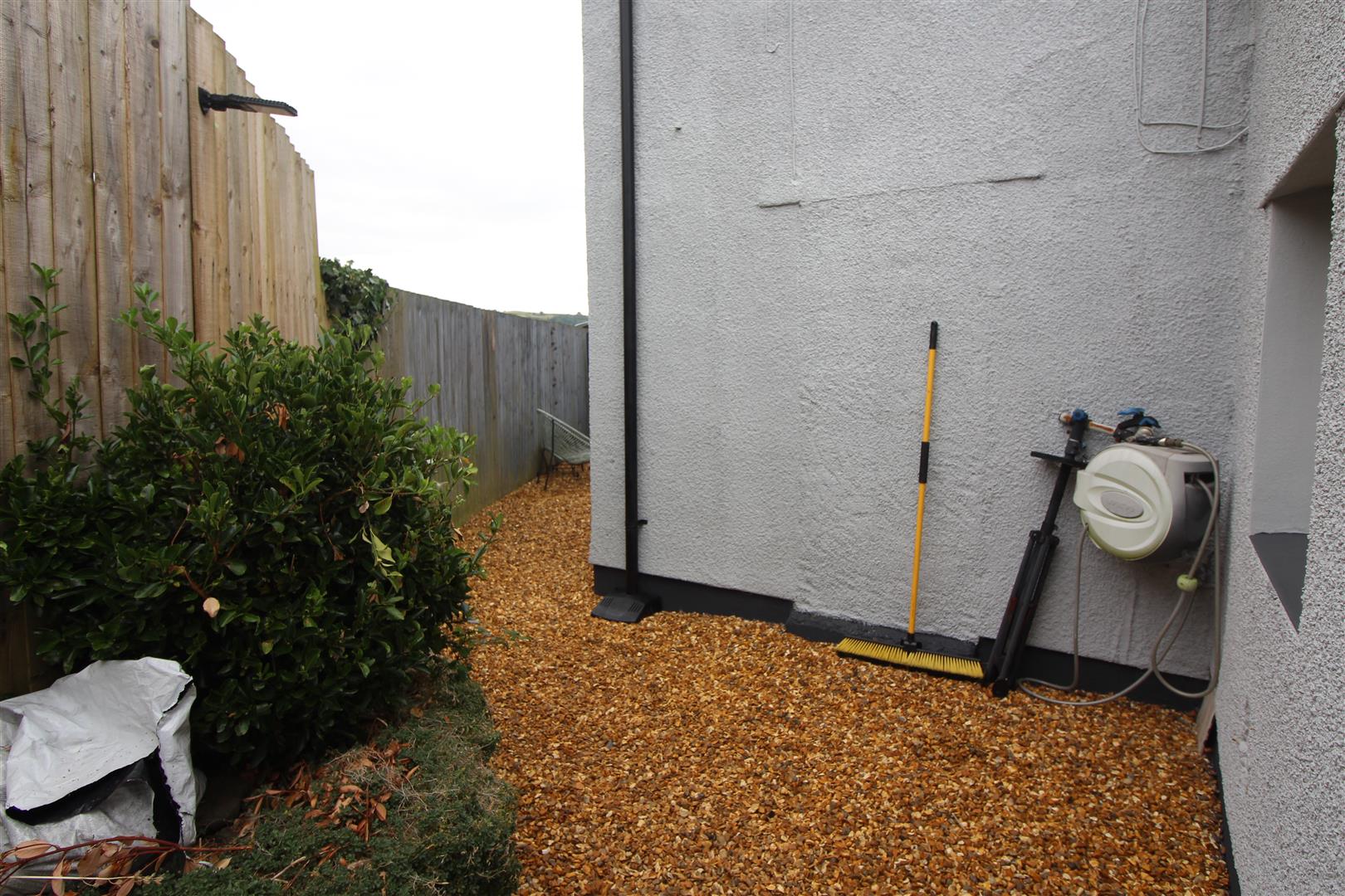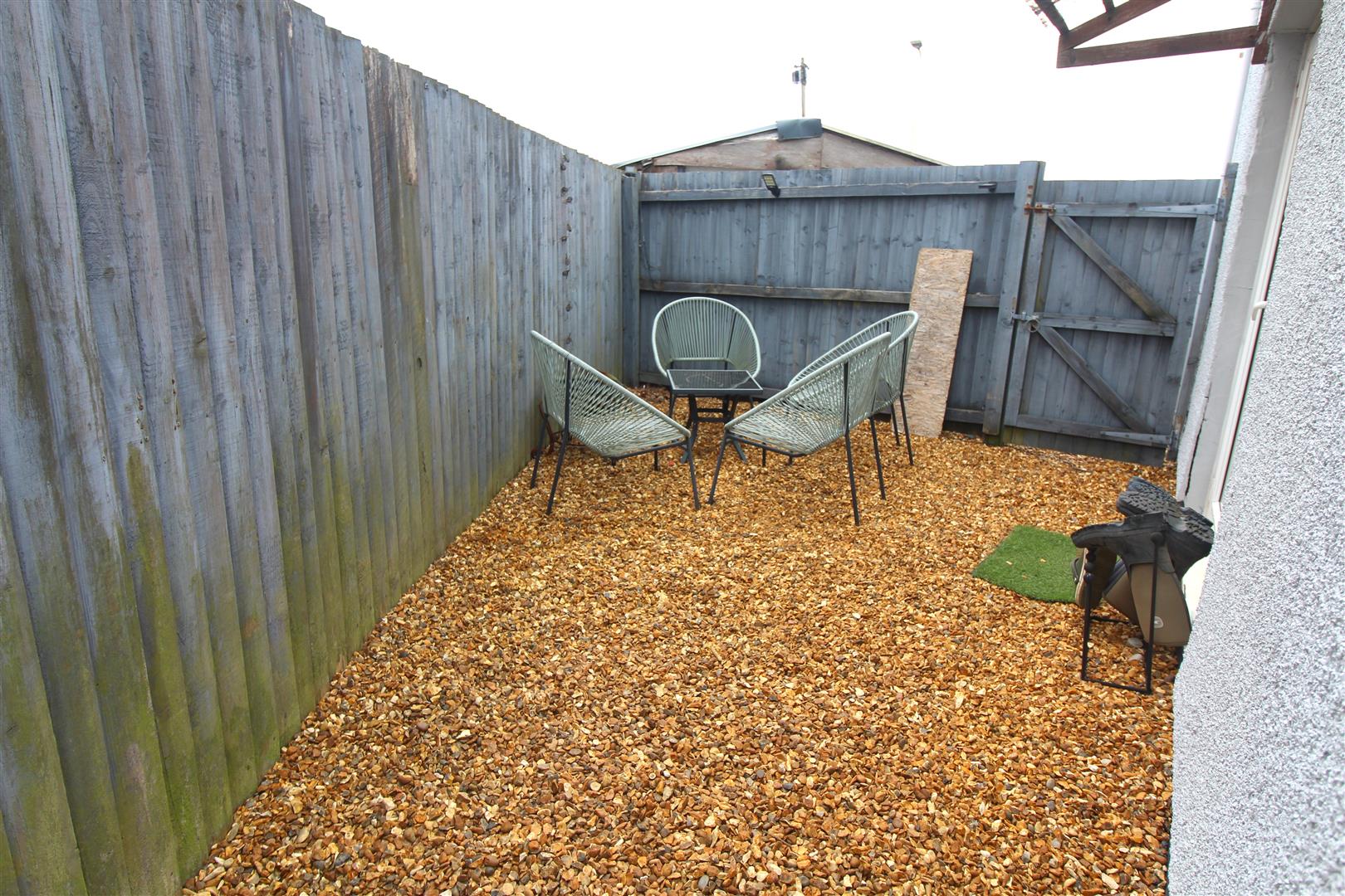 An enclosed rear garden area with pebbles.