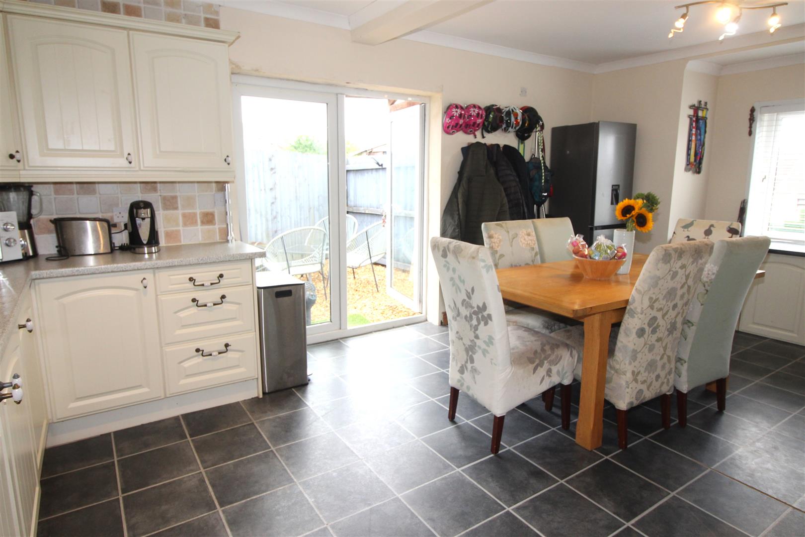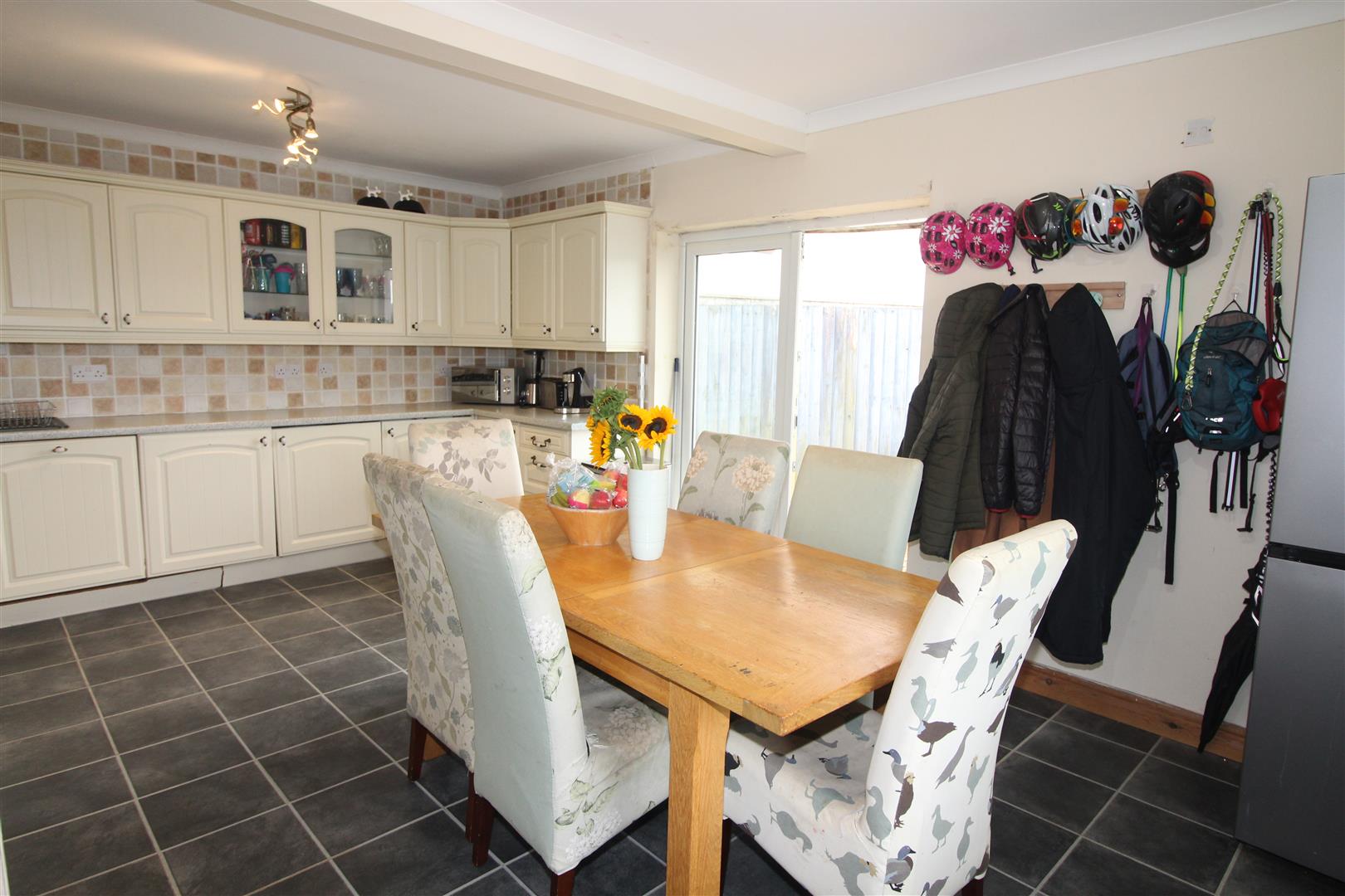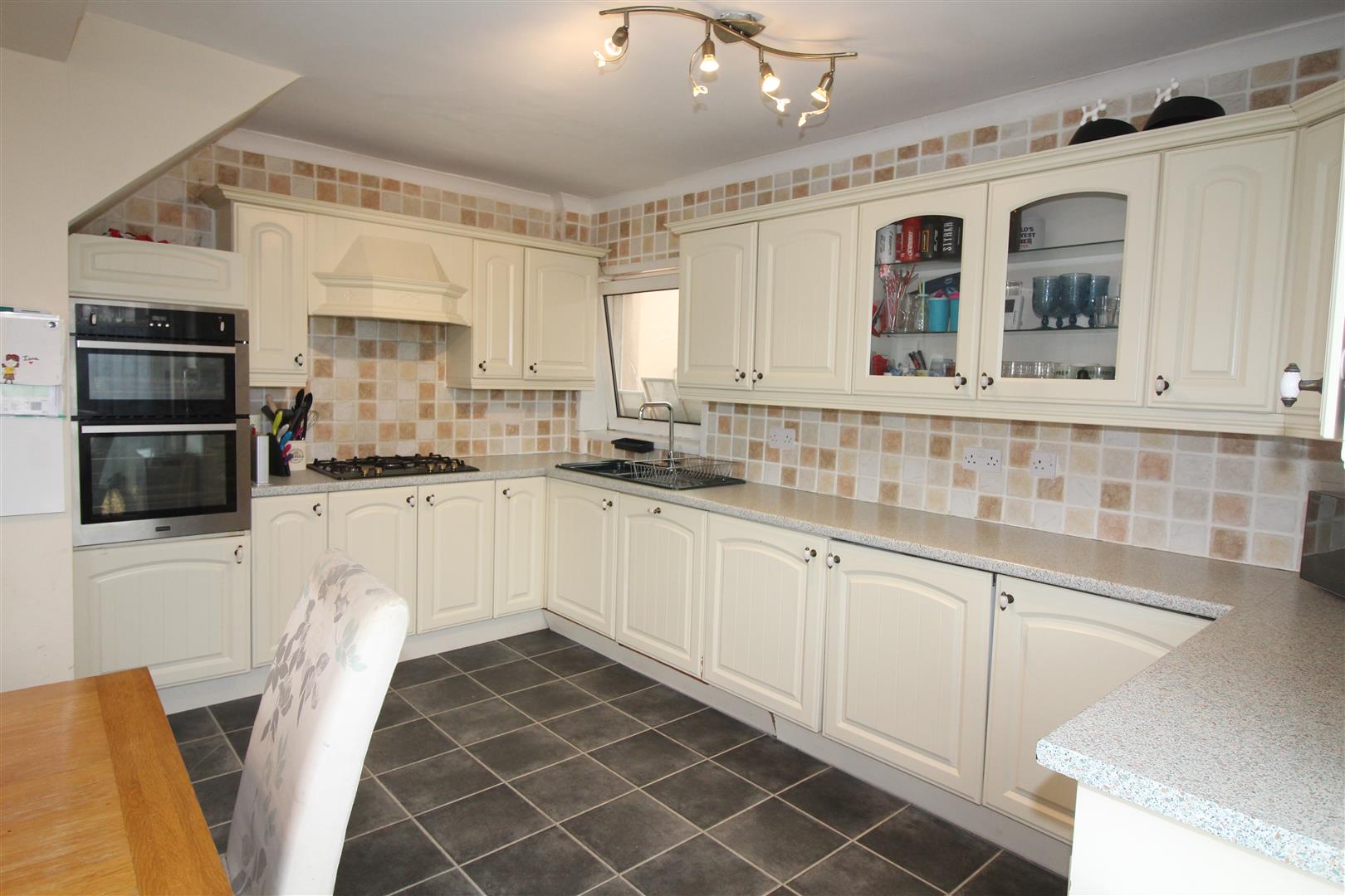 Double glazed window to front aspect, double glazed window to lean-to/sitting room, base and wall cabinets, bowl and a half single drainer sink, tiled splash back, 5 ring gas hob, electric double oven, double glazed French doors leading to side garden, space for dining table.