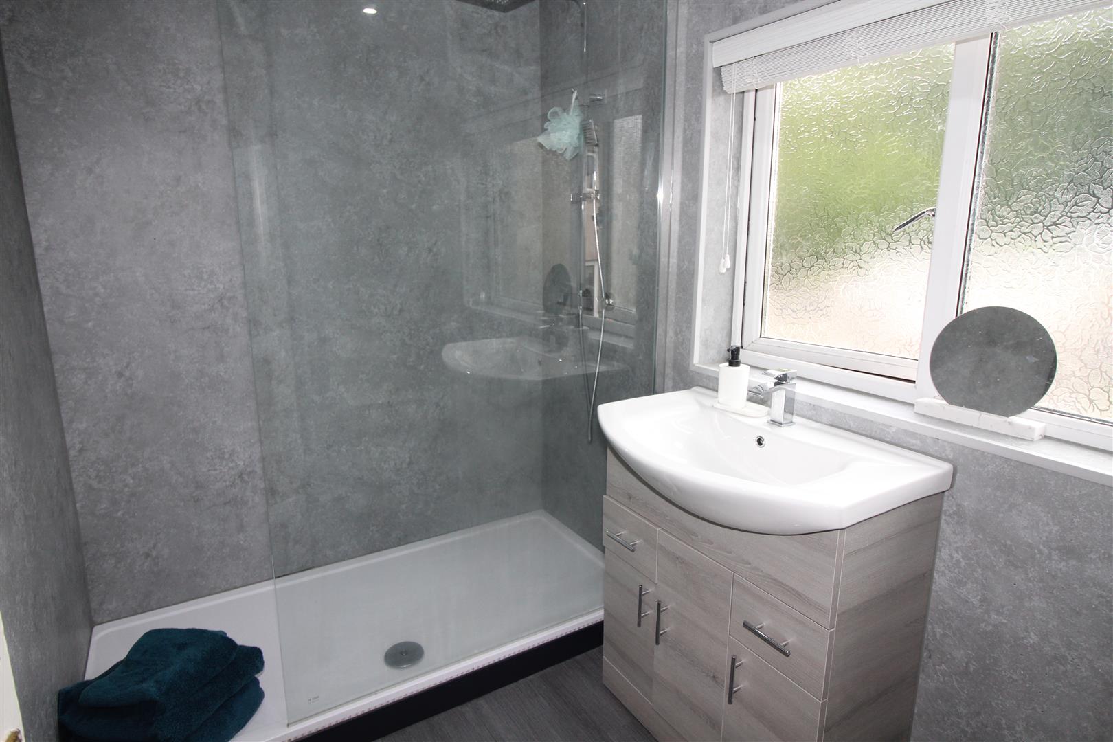 Double glazed window to rear aspect, painted finish to ceiling, spot lighting, upvc cladding to walls, large shower enclosure with shoer, wash hand basin, low level WC , tall radiator.