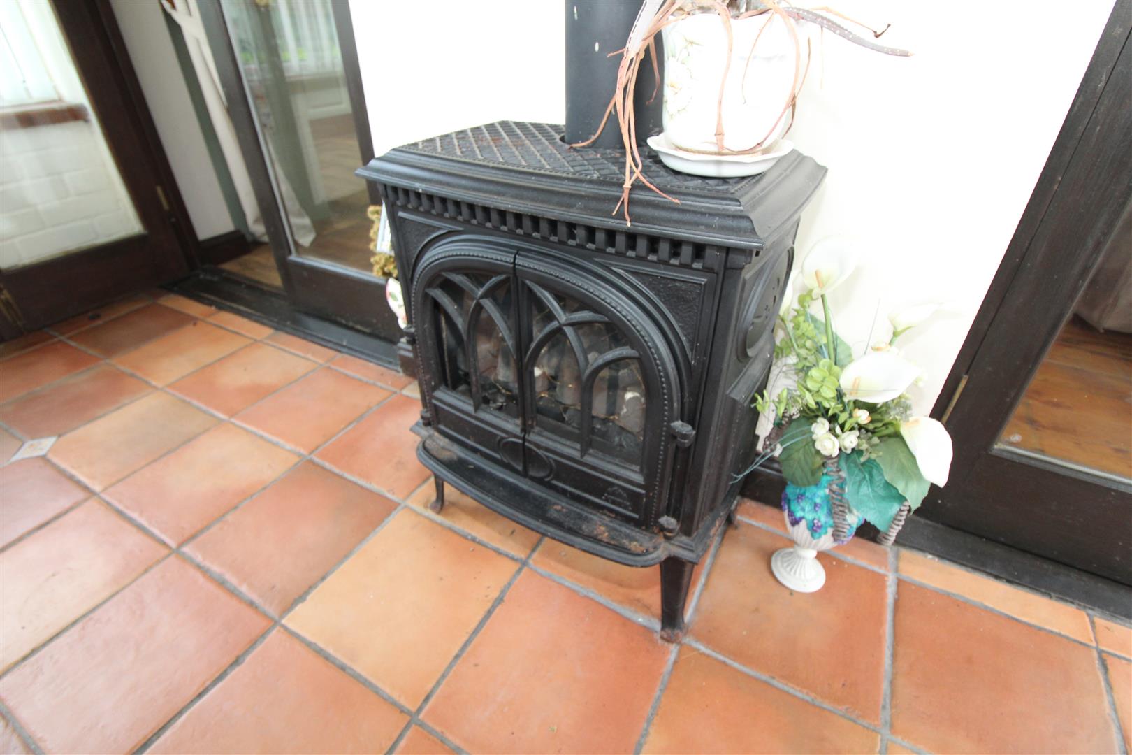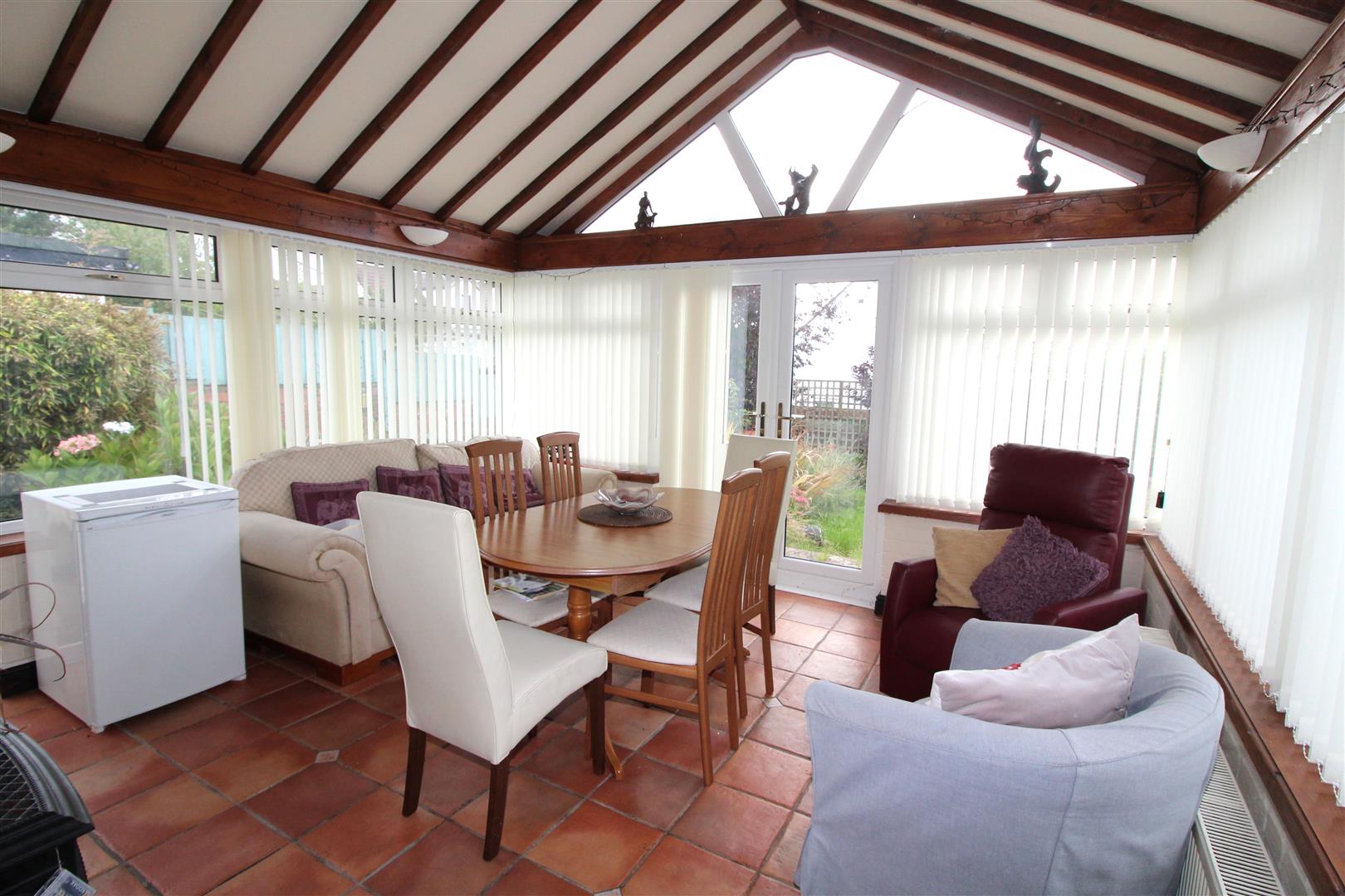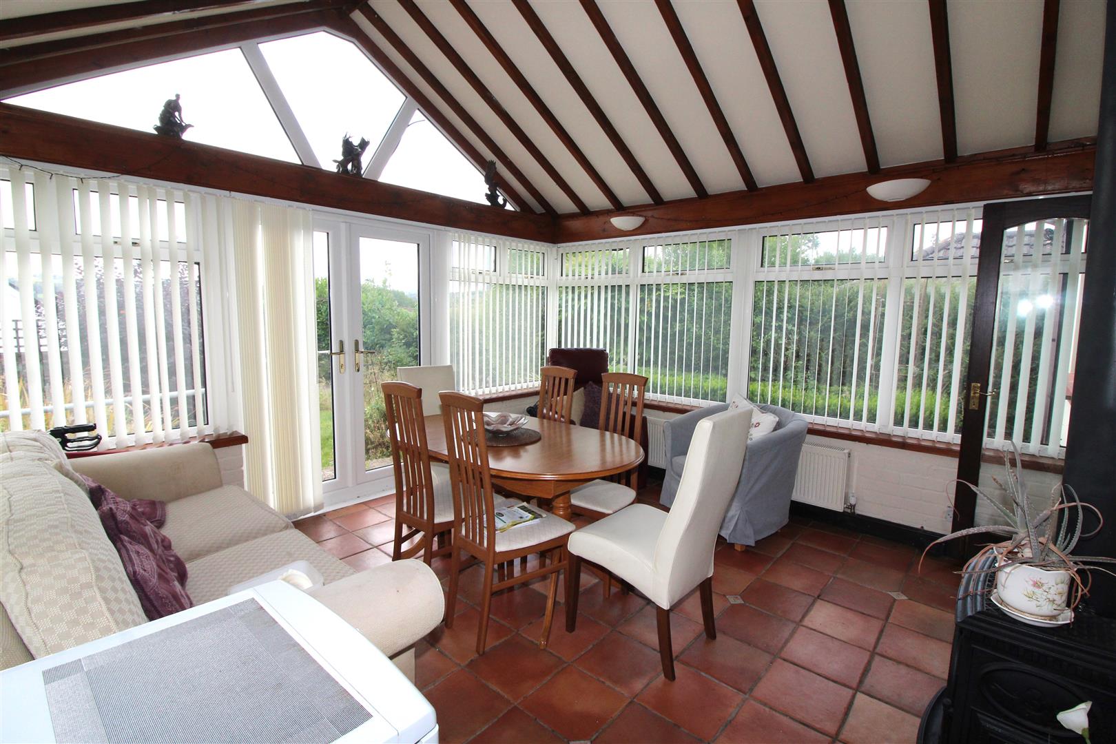 A brick built and double glazed conservatory with widows to side and rear aspects, tiled flooring, ornamental log burner, double glazed door leading to outside.