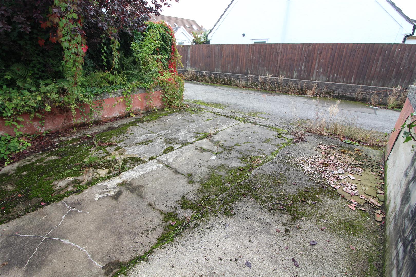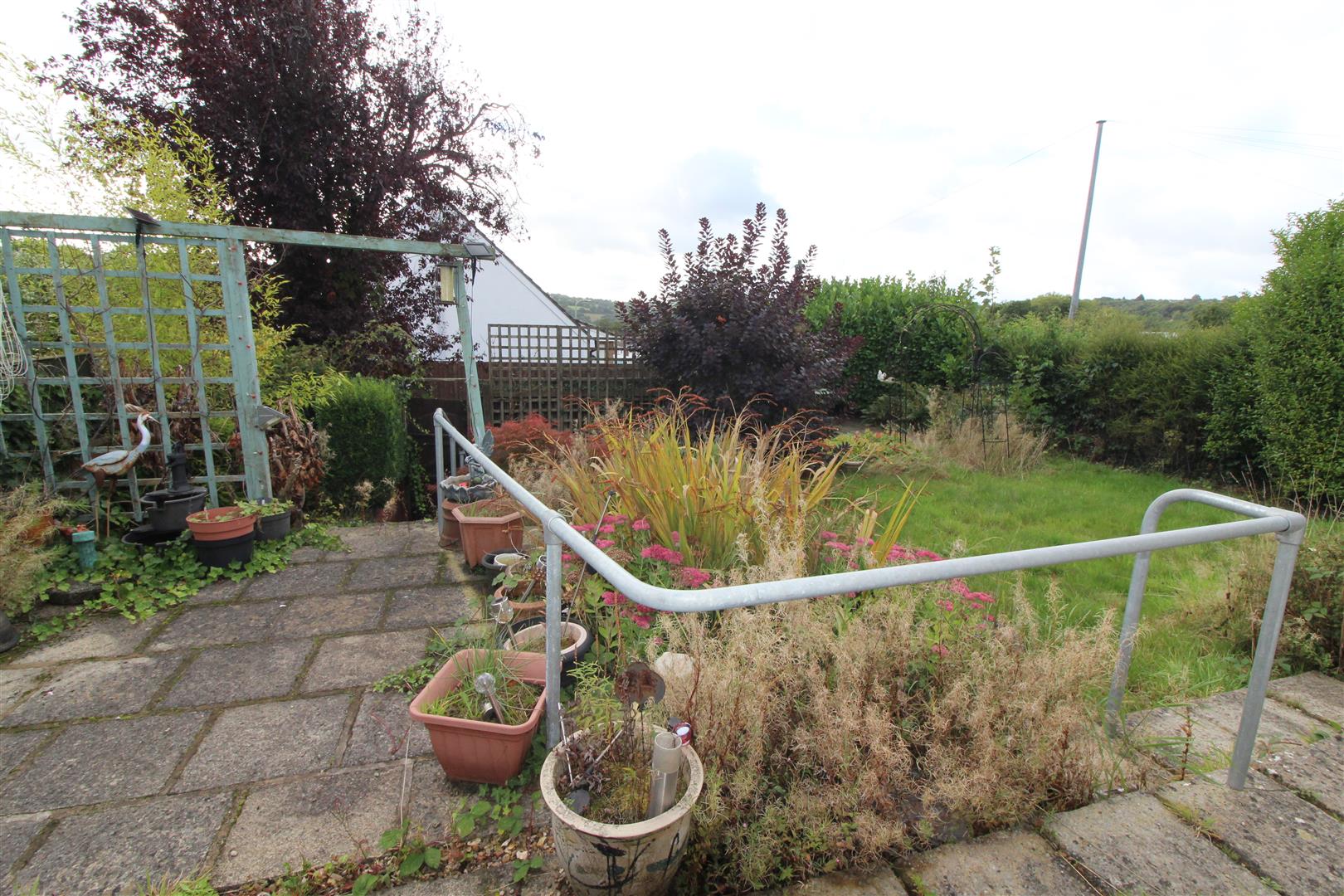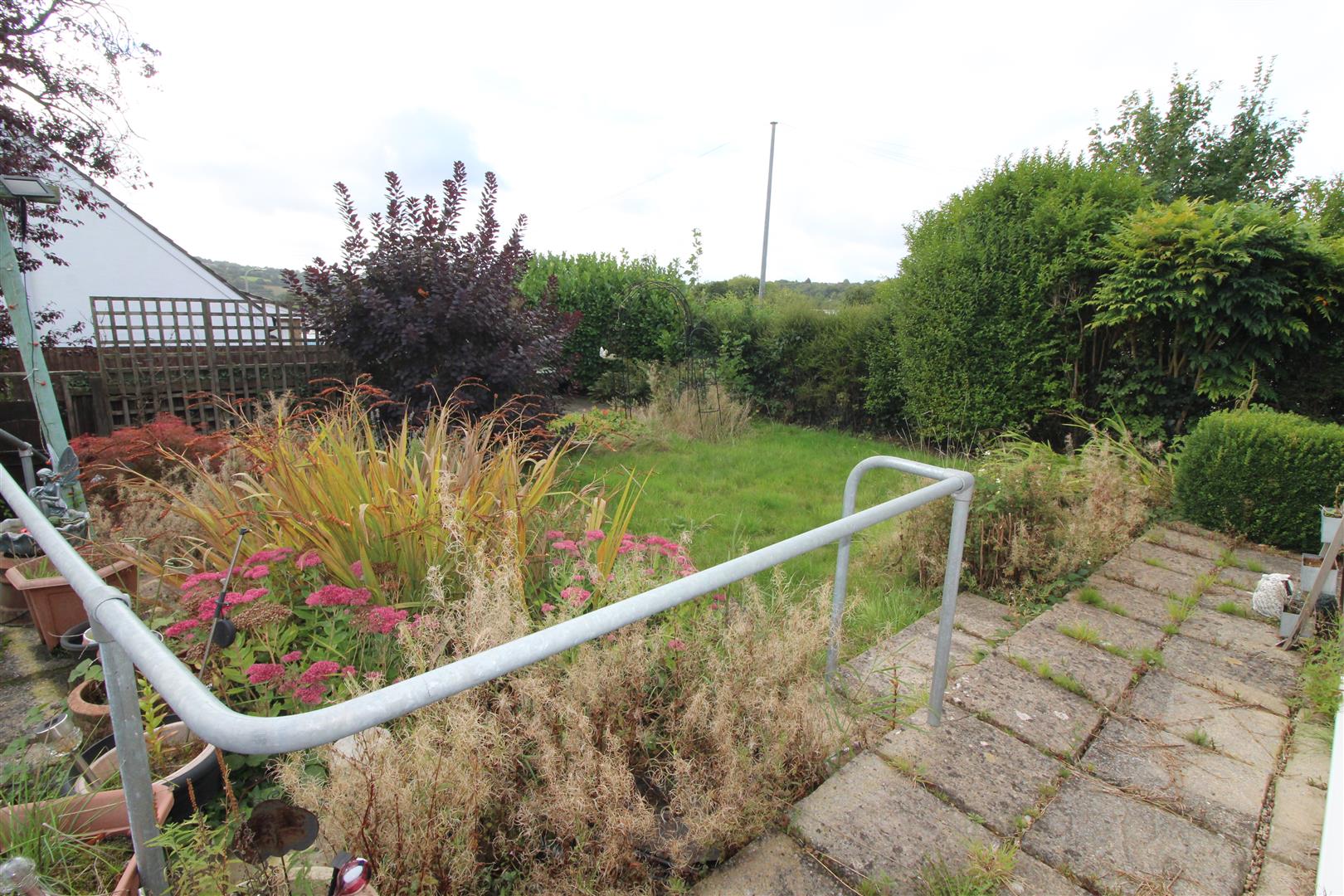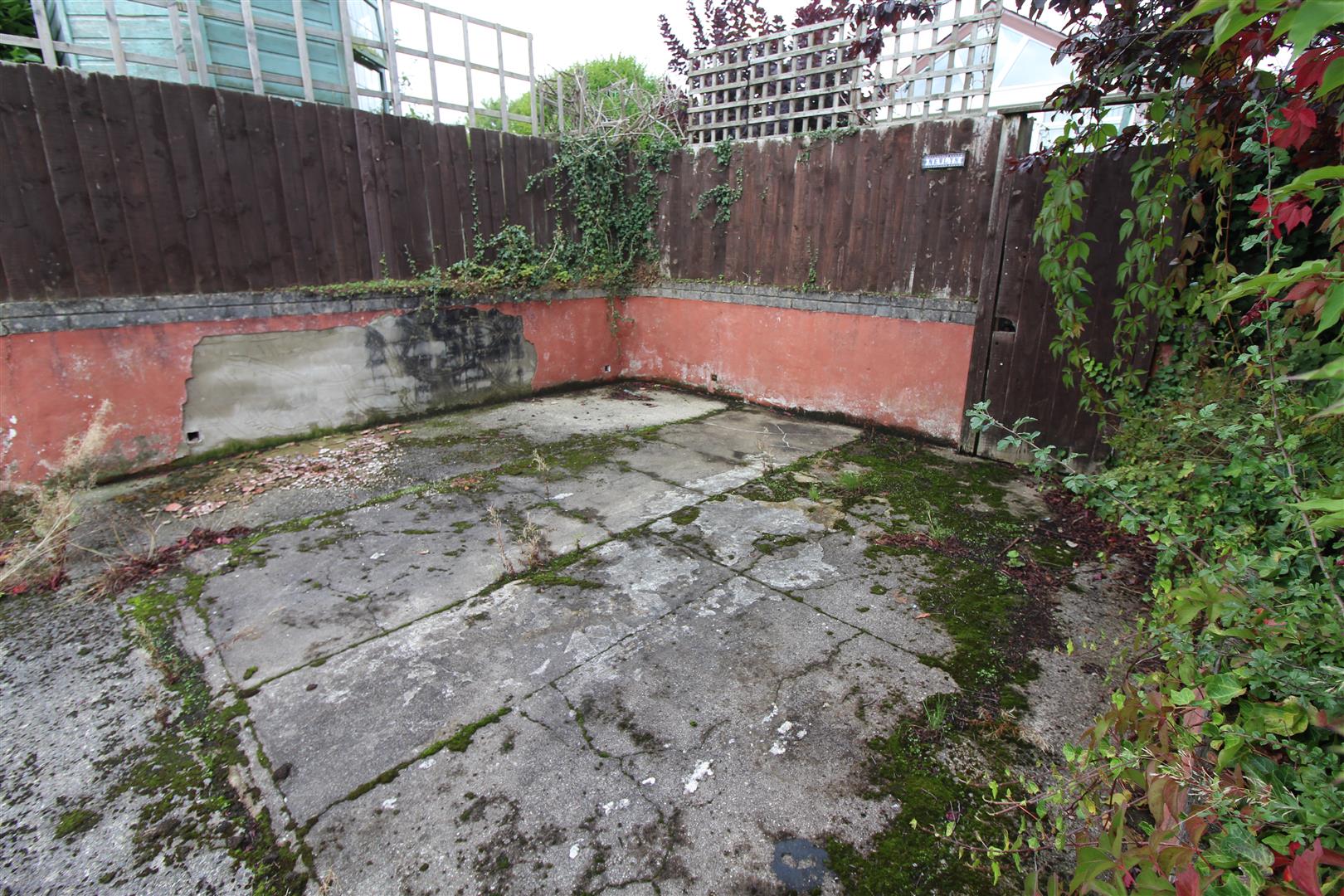 Gated entrance with steps leading to patio area with shrub boundaries, gated pathway leading to rear garden.