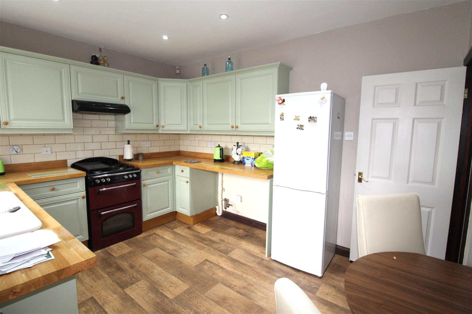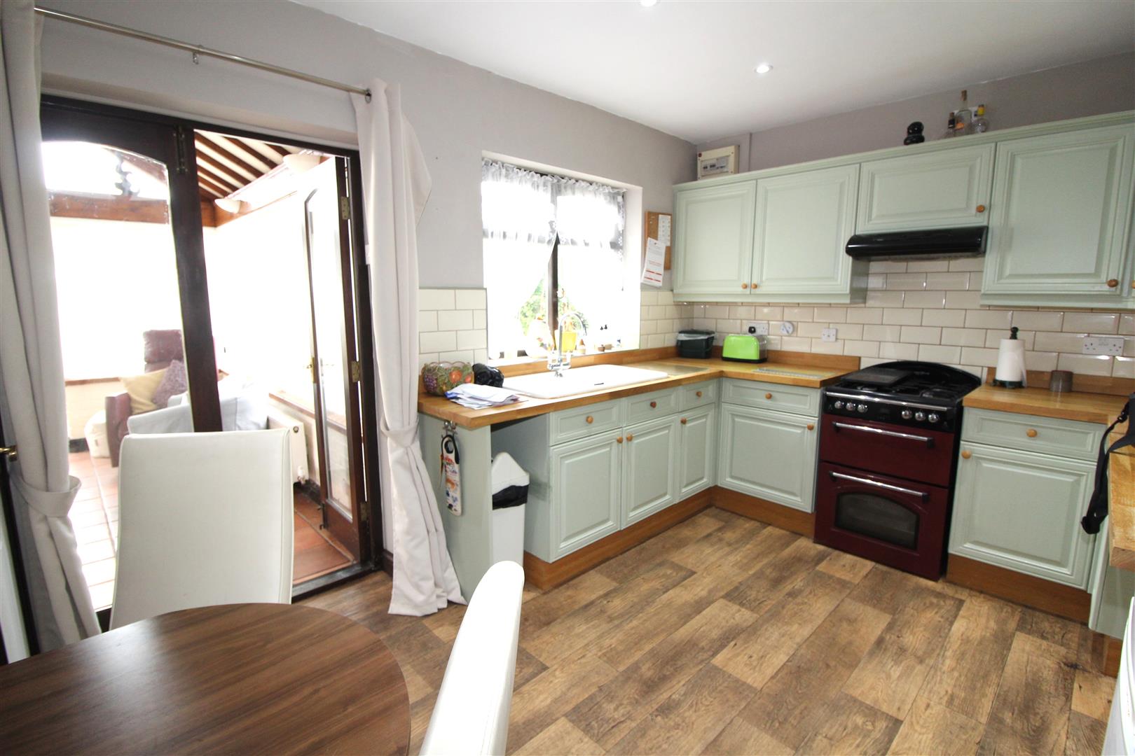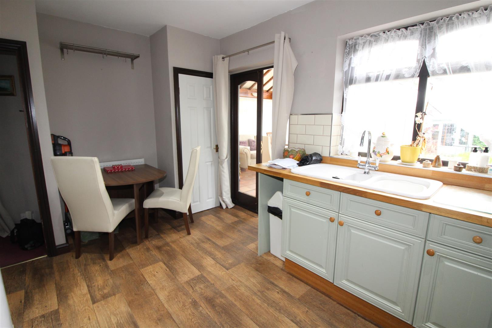 Double glazed window to rear aspect, painted finish to walls and ceiling, spot lighting, base and wall cabinets, bowl and a half single drainer sink, plumbing for automatic washing machine, space for fridge/freezer and dining table, cupboard housing wall mounted gas central heating combination boiler, double doors leading to conservatory.