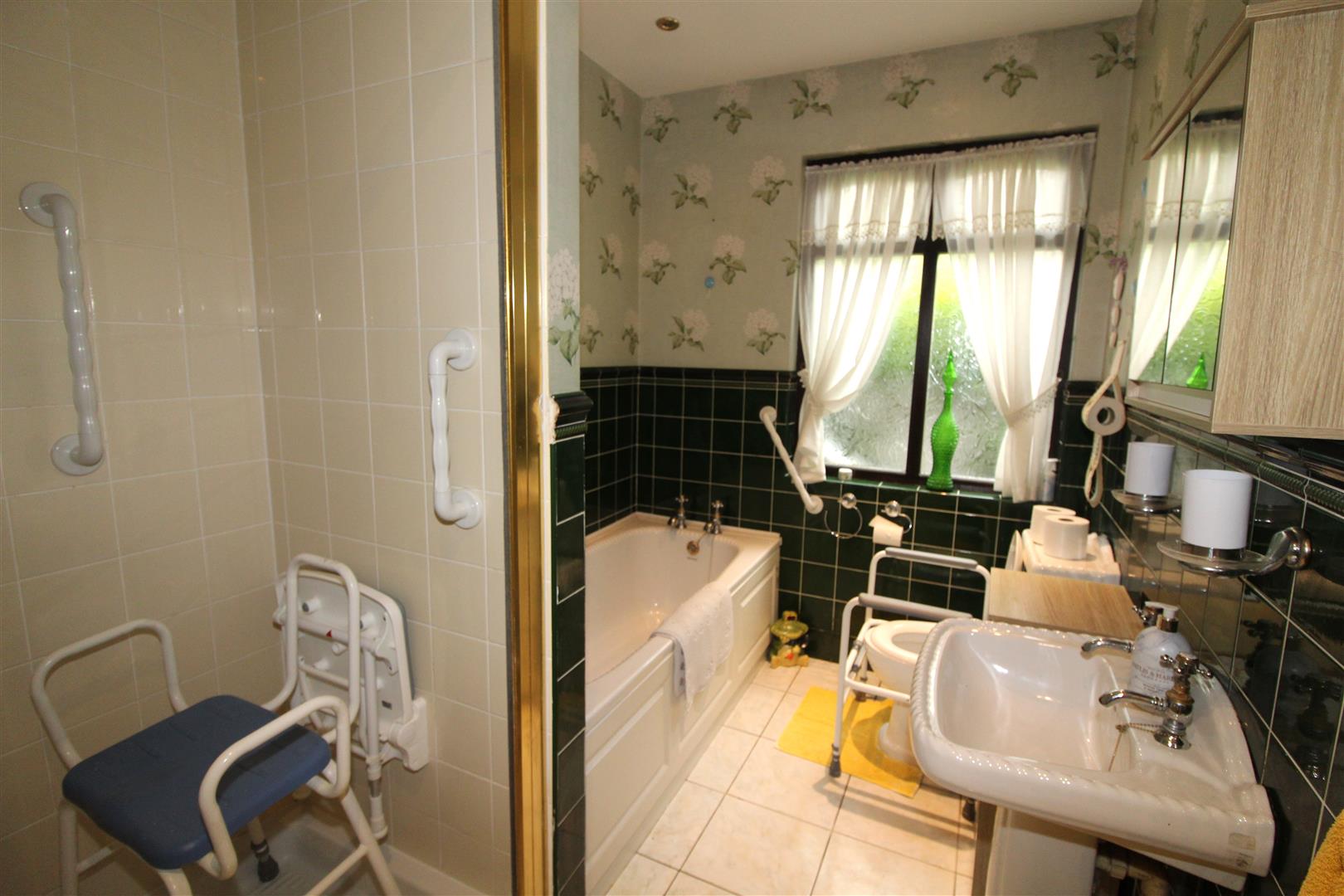 Double glazed window to side aspect with obscured glass, painted finish to ceiling, spot lighting, papered and tiled finish to walls, panel bath, low level WC, pedestal wash hand basin, shower enclosure with shower, radiator, shelved linen cupboard with radiator.