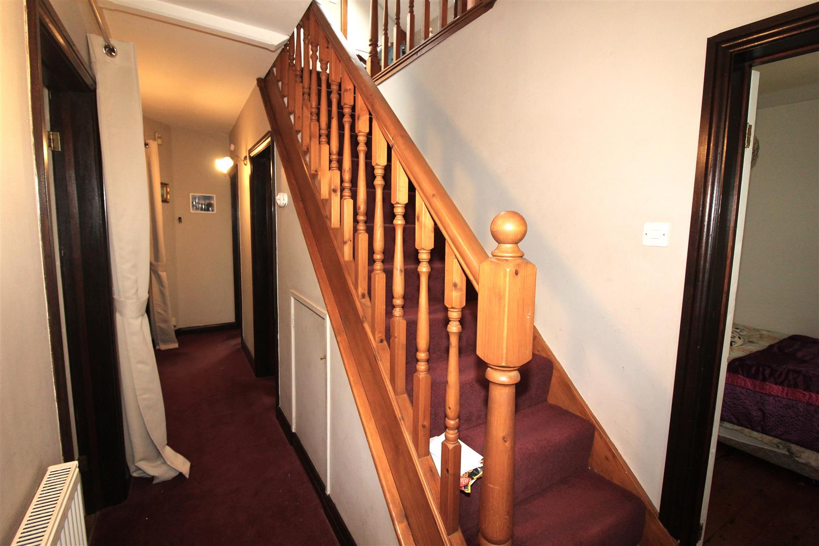 Timber entrance door, painted finish to walls and ceiling, radiator, stairs leading to first floor accommodation, understairs storage.