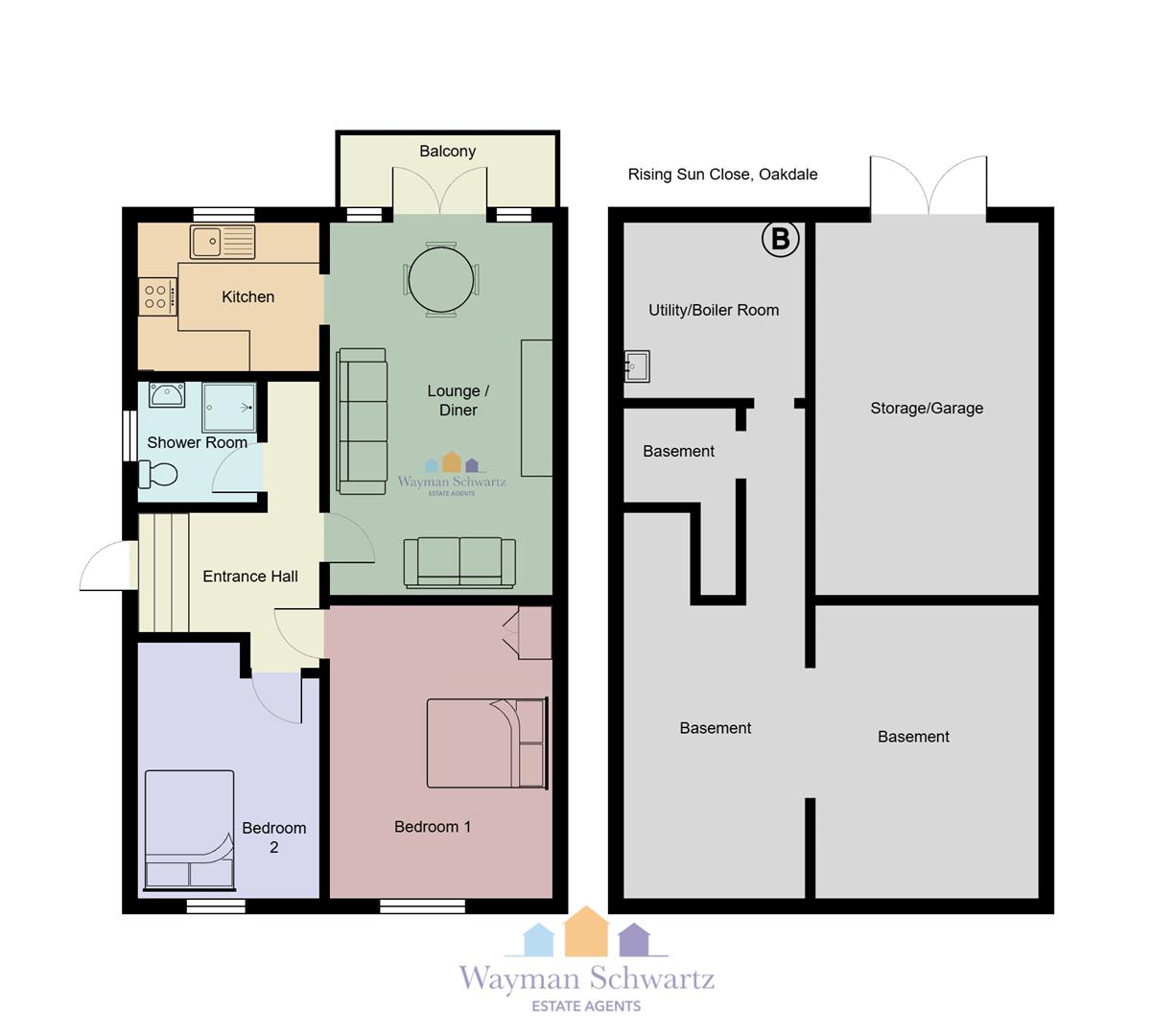 Located in Rising Sun Close, cul de sac, Oakdale, this charming semi-detached bungalow offers a delightful blend of comfort and modern living. With two well-proportioned bedrooms, this property is perfect for small families, couples, or those seeking a peaceful retirement retreat. Upon entering via the hallway you are welcomed into a spacious lounge that boasts a lovely balcony, providing picturesque views of the surrounding area—ideal for enjoying your morning coffee or unwinding in the evening. The modern kitchen is thoughtfully designed, featuring contemporary fittings that make cooking a pleasure. The shower room is equally modern, ensuring convenience and style. This bungalow also benefits from a large basement storage area, providing ample space for all your belongings, whether it be seasonal items or hobby equipment. The gardens front and rear offer a serene outdoor space, perfect for gardening enthusiasts or simply enjoying the fresh air. Additionally, there is parking available for one vehicle with the potential of creating a garage space by changing the doors to the basement entrance back to a garage door. Rising Sun Close is a peaceful location, making it an excellent choice for those who appreciate a quiet neighbourhood while still being within easy reach of local amenities with the village having shops and schools.