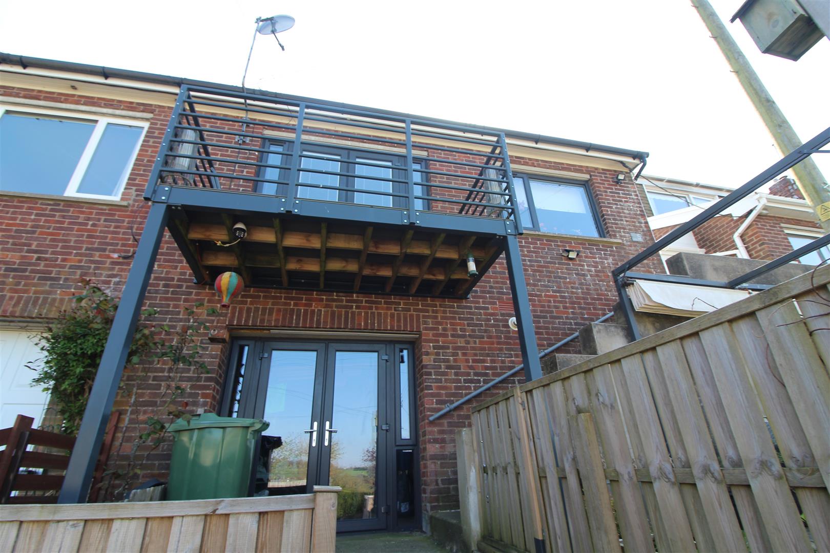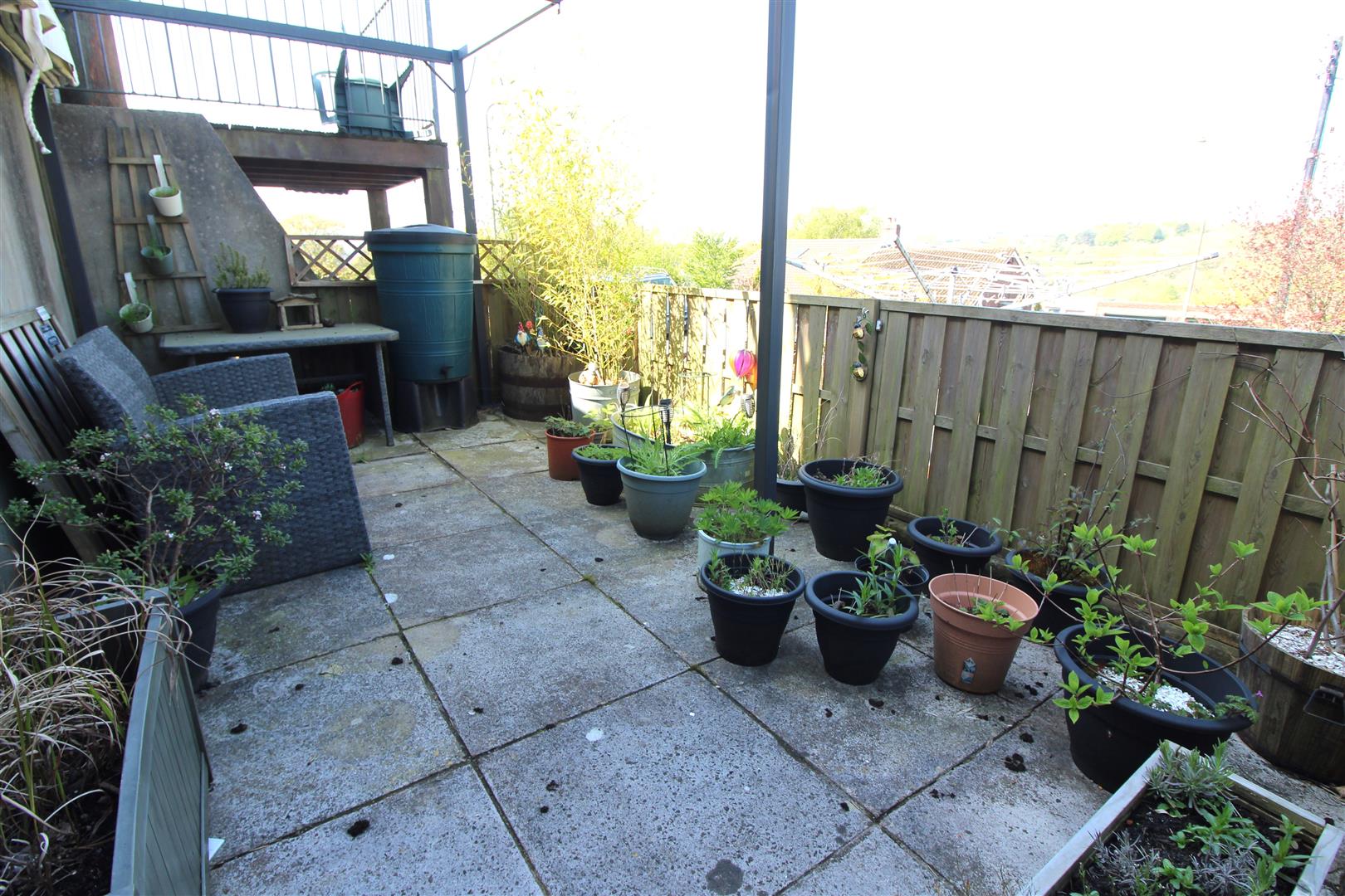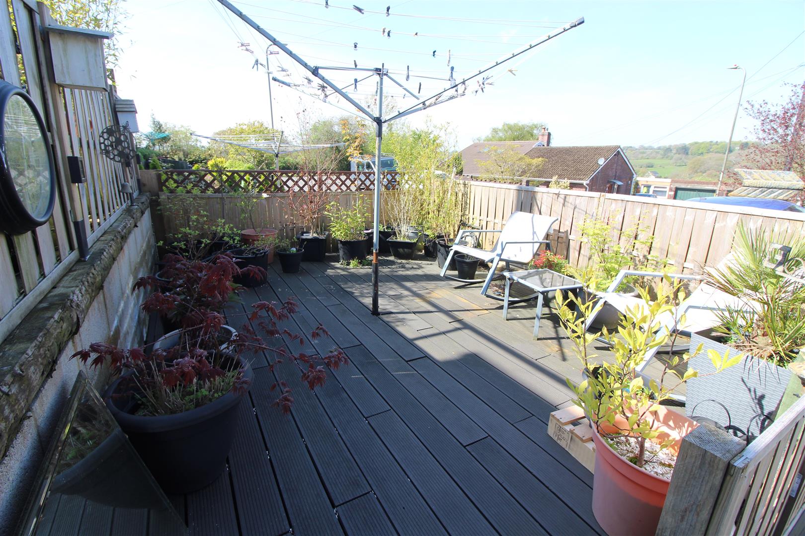 In two parts with separate paved and decked seating areas.