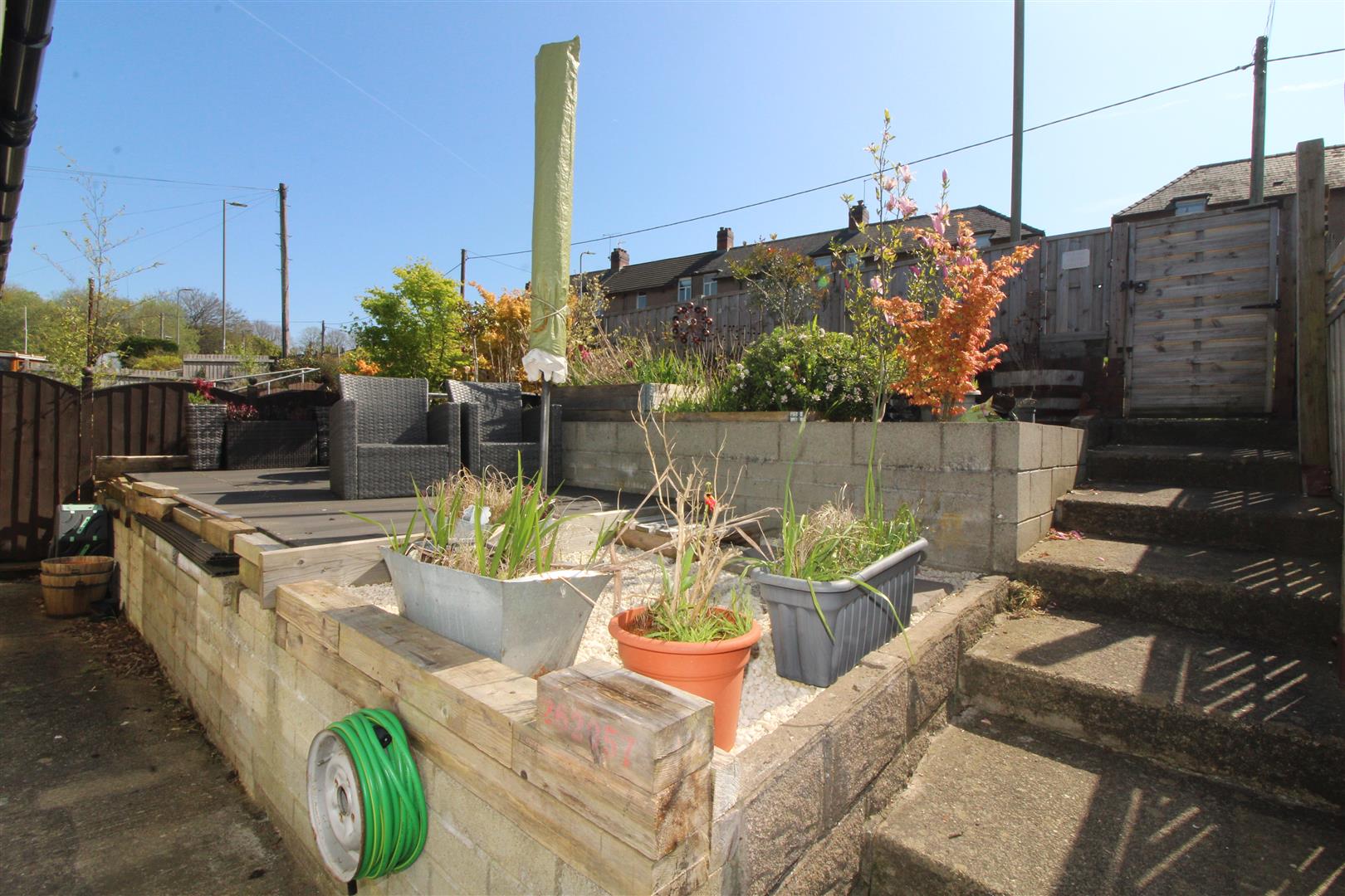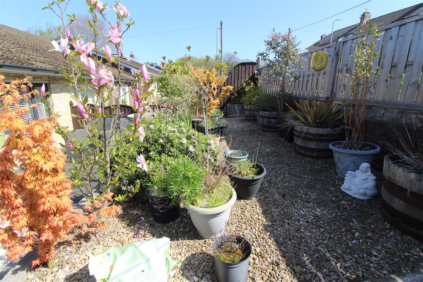 A pebbled garden with gated entrance, pathway leading to rear garden.